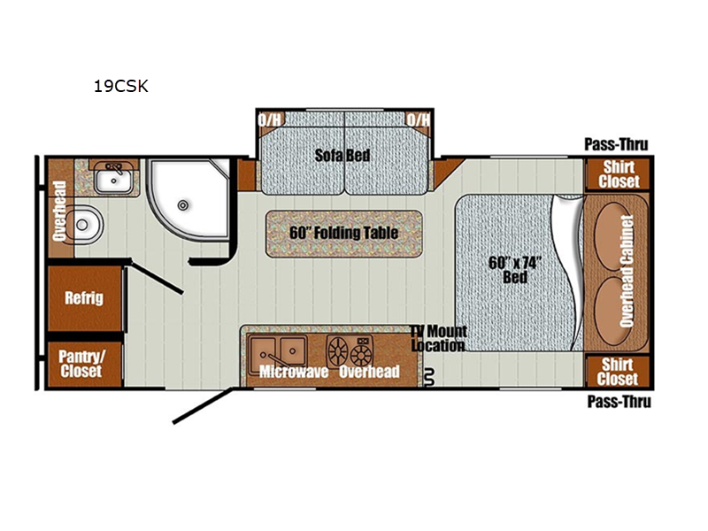 You will have everything in this travel trailer for a comfortable weekend getaway! You will start each morning feeling refreshed after sleeping on the front queen bed with shirt closets on either side and a TV mount location diagonal from it. After you take a nice, hot shower in the rear corner bathroom, head to the 8 cu. ft. 12V refrigerator and grab some bacon to fry up on the three burner cooktop. The sofa bed slide has a 60" folding table for you to enjoy your meals, and can transform into an extra sleeping space for a guest or two little ones. Don't leave any of your favorite snacks behind either when you can store them inside the pantry/closet near the entrance!