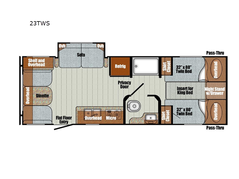 Sleeps 4 Slides 1 Length 26 ft 1 in Ext Width 7 ft 6 in Ext Height 10 ft 6 in Int Height 6 ft 11 in Hitch Weight 440 lbs Dry Weight 3835 lbs Cargo Capacity 2205 lbs Fresh Water Capacity 30 gals Grey Water Capacity 33 gals Black Water Capacity 33 gals Tire Size 14" Furnace BTU 25000 btu Available Beds Two Twin with King Conversion Refrigerator Type 12V Refrigerator Size 8 cu ft Cooktop Burners 3 Shower Size 24" x 36" Number of Awnings 1 LP Tank Capacity 20 lbs Water Heater Type Tankless AC BTU 15000 btu Awning Info Electric w/LED Lights Axle Count 2 Number of LP Tanks 2 Shower Type Standard Electrical Service 30 amp Similar Travel Trailer Floorplans