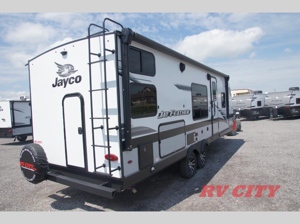 With any Jay Feather travel trailer by Jayco, you will experience an easy-to-tow, lightweight dual axle RV that is built on an American-made frame with an aerodynamic, rounded front profile with a diamond plate to protect against road debris, and includes Azdel composite in the perimeter walls, and Stronghold VBL vacuum-bonded, laminated floor and walls, plus the Magnum Truss roof system. Also included are features in the Customer Value package, and the Sport package which offers aluminum tread entry steps, roof-mount solar prep, an LED TV, and the Glacier package which includes an enclosed underbelly. The interior provides residential-style kitchen countertops with a decorative backsplash, residential plank-style vinyl flooring for easy care, a decorative wallboard for style, and ball-bearing drawer guides with 75 lb. capacity to mention a few of the amenities. Choose your favorite today!