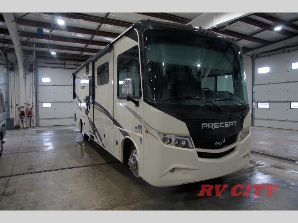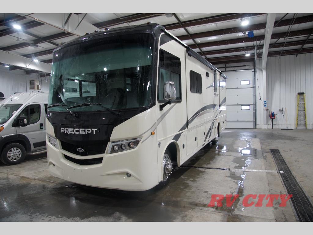 The Jayco Precept Class A gas motorhome comes with some features that you'll only find on a Jayco product, like the JRIDE PLUS which offers you a powerful blend of precise handling and renowned stability on the road and the JAYCOMMAND system powered by Firefly which allows you to control your coach's operations from just about anywhere with your phone. You'll find two-point lap seatbelts in all designated seating locations, and the one-piece, seamless fiberglass front and rear caps resist wear and tear over the years. The Precept also offers you the lightest yet strongest construction in the industry with the Stronghold VBL lamination on the roof, floor, and sidewalls. You'll also be very pleased to find a 120" panoramic windshield (the largest in the industry), automatic hydraulic leveling jacks, an Onan® Marquis Gold Genset 5,500W gas generator with auto-gen start, and a Girard® tankless LP water heater.