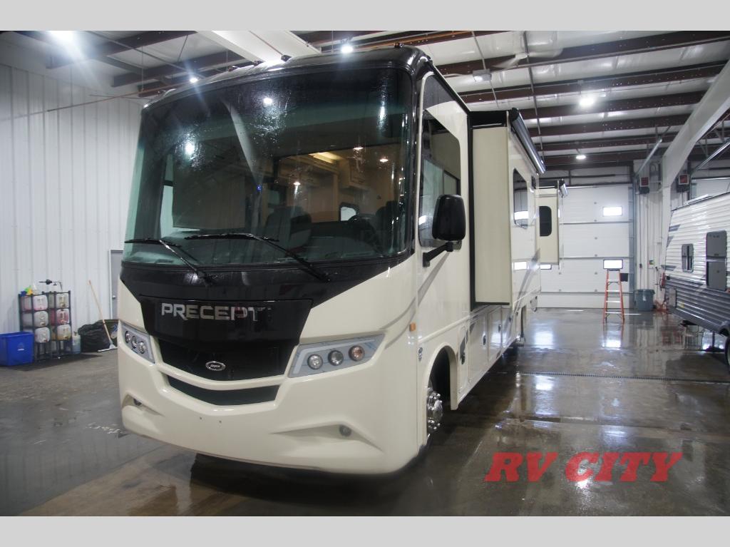 The fun is just about to begin with this Precept Class A gas motorhome! You will have an amazing night of sleep on the RV king bed slide back in the private bedroom, and the bedroom also offers you an LED TV to watch while you relax. The separated bathroom gives you a chance to have two people getting ready at the same time, and the opposing slides in the main living area provide some extra room for lounging or socializing. As you drive down the road, you'll appreciate the removable cockpit table that sits in between the swivel cab seats, and you can create some extra sleeping space by adding the optional drop-down overhead bunk in the cab.