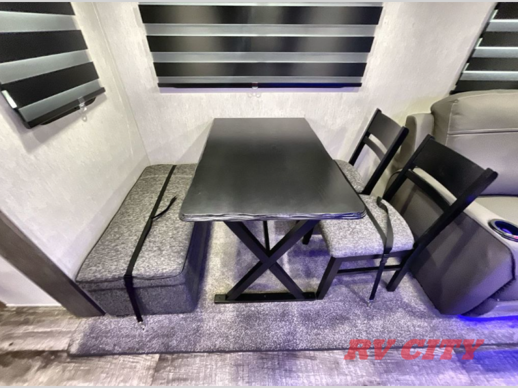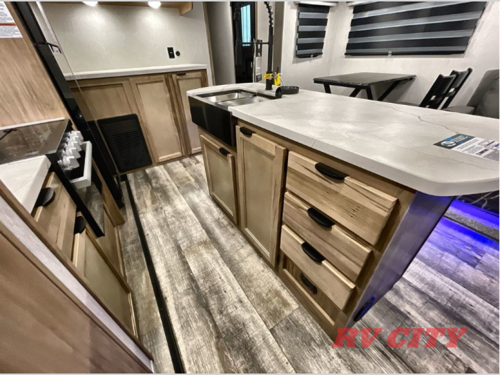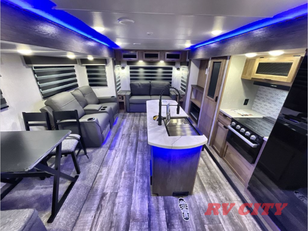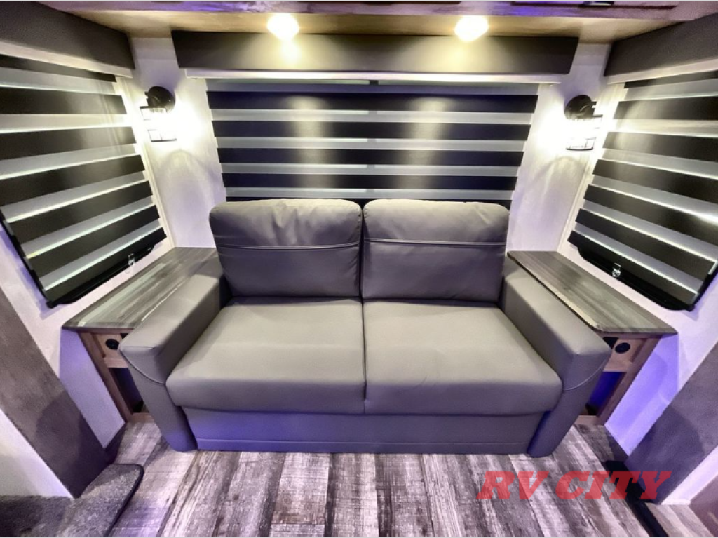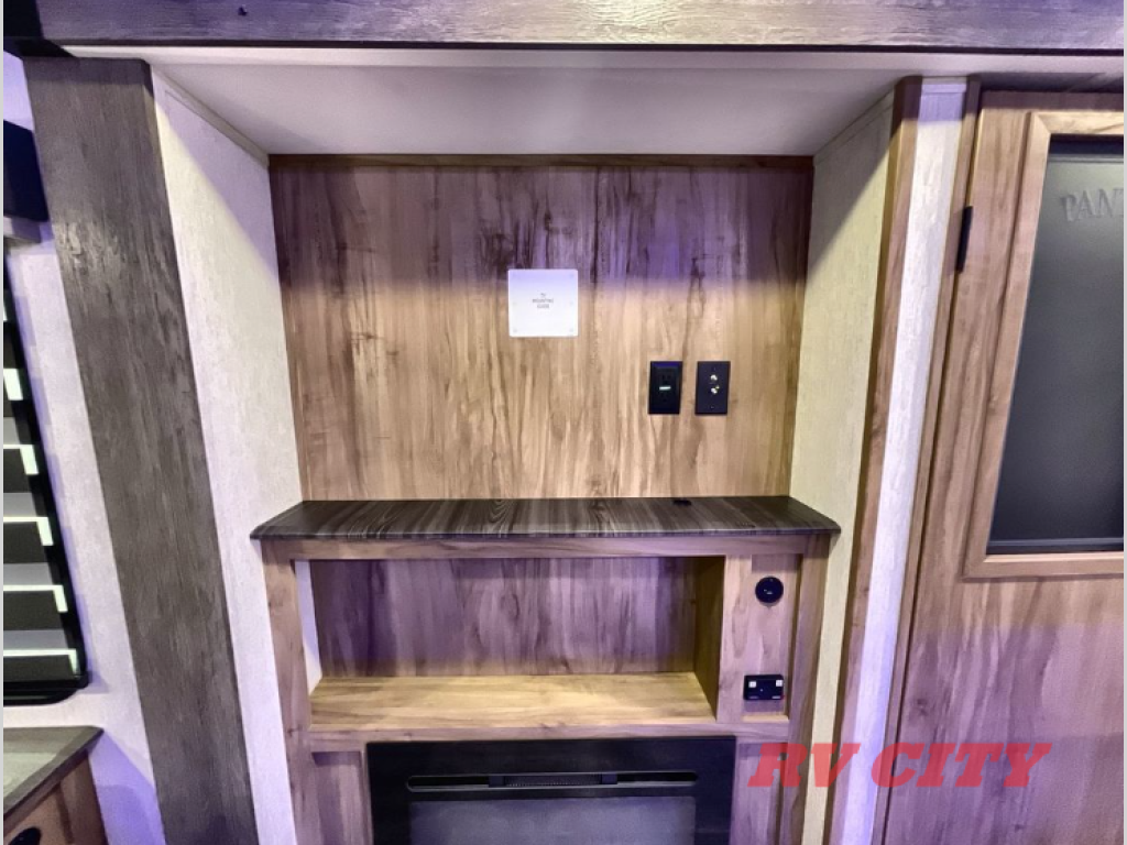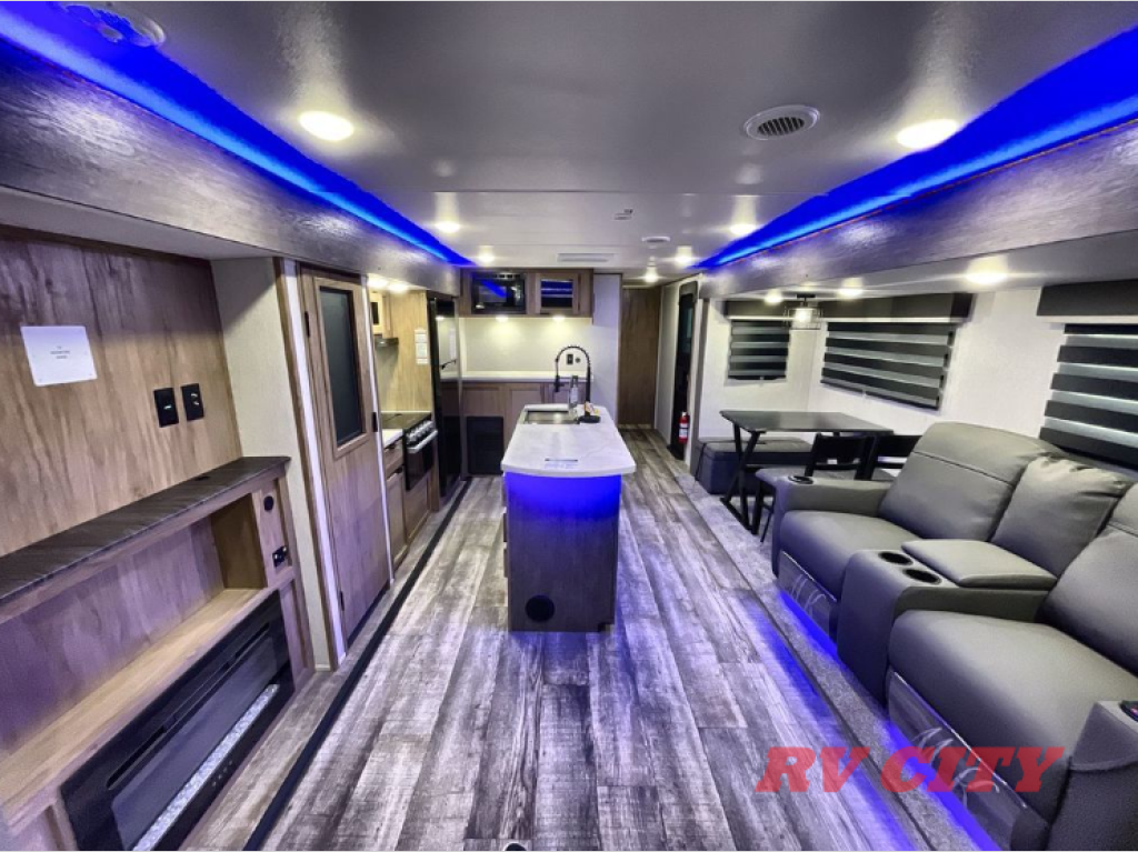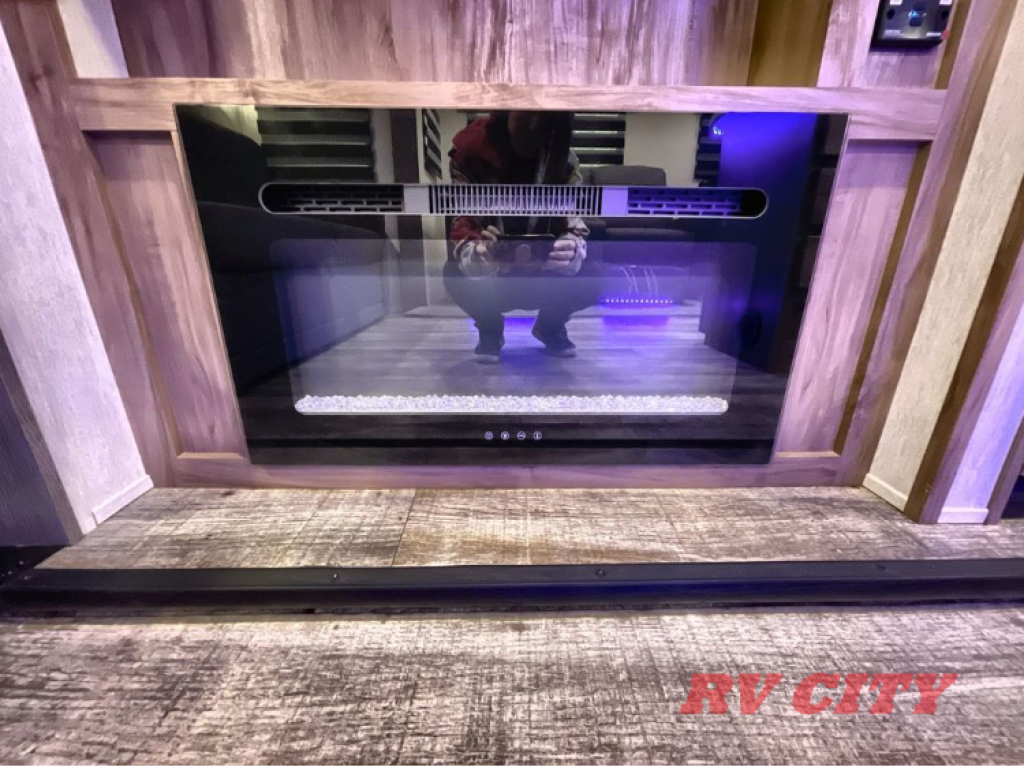 This trailer has it all for maximum comfort and convenience as well as entertainment! The rear living area includes a deluxe tri-fold hide-a-bed sofa with a rear window for great views of your campsite, and dual opposing slides widen this area so you can visit with friends. You'll also find theater seating with heat, light, and massage, plus a free-standing table with two fixed and two folding chairs. Enjoy the fireplace on a cool night or when you want a little ambiance while seated inside. The kitchen island will be handy for food prep and serving, and the unique coffee bar will be a favorite as well. Two patio awnings will provide an outdoor living area; just grab your camping chairs from the full pass-through storage. When you want to call it a night, fall quickly to sleep on the queen bed in the front bedroom with easy access to a dual entry bathroom which offers a radius shower with opaque glass doors.