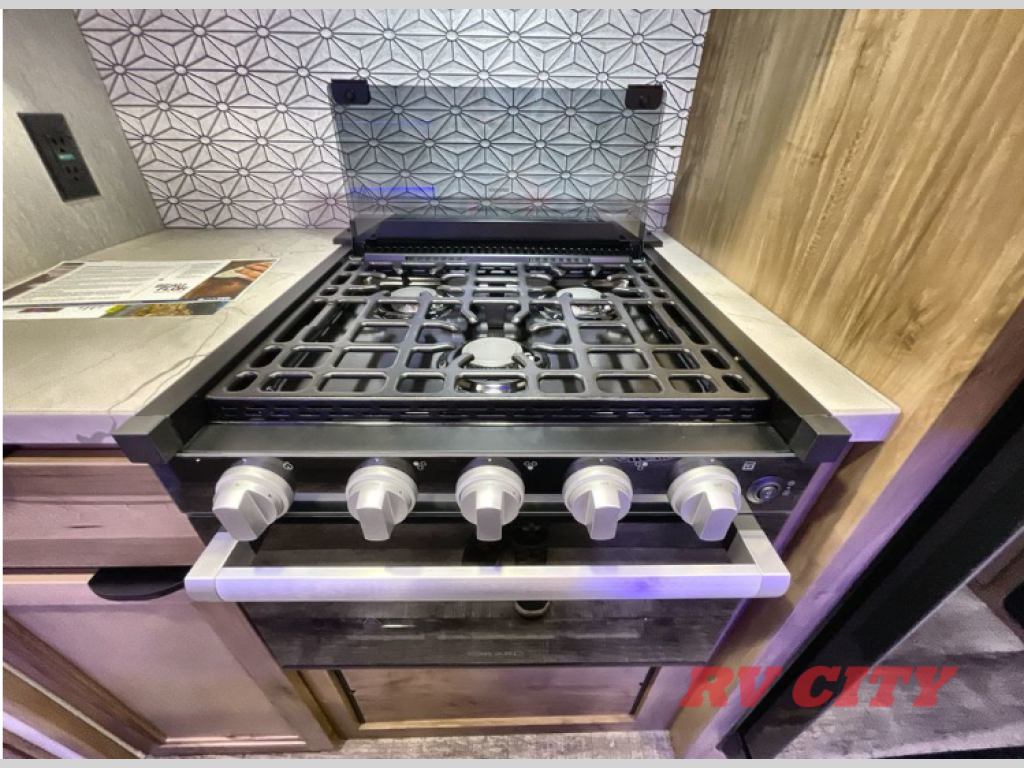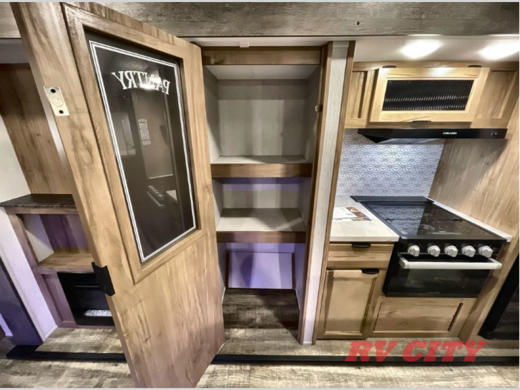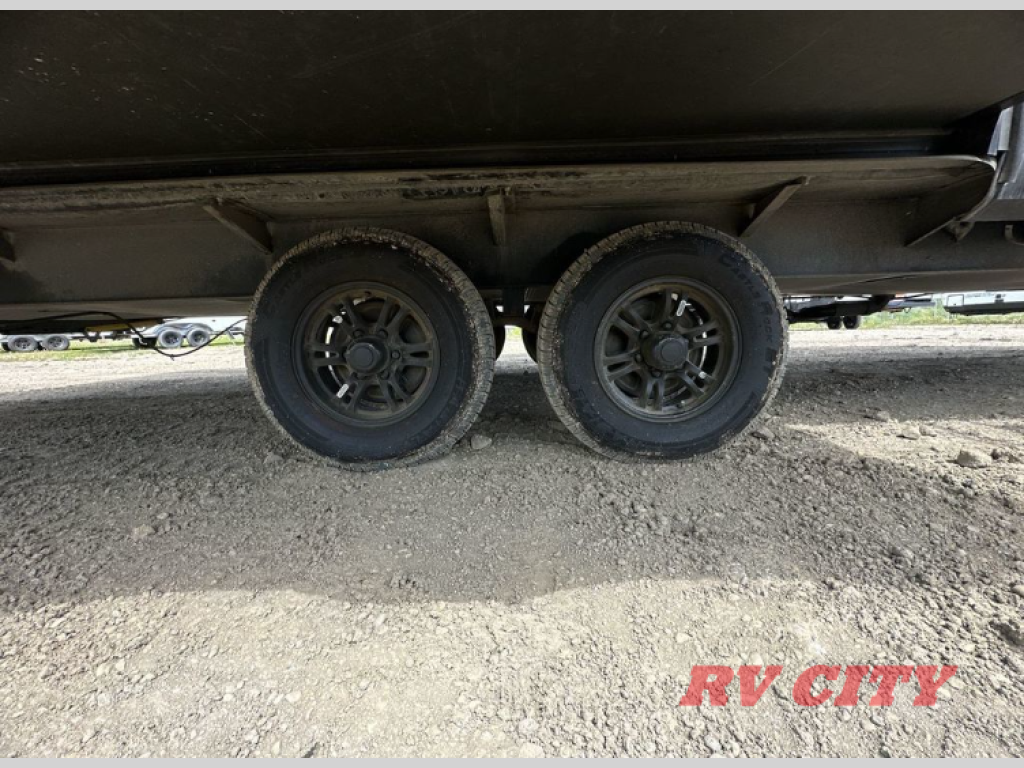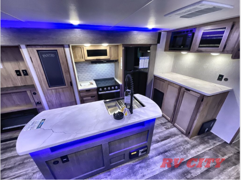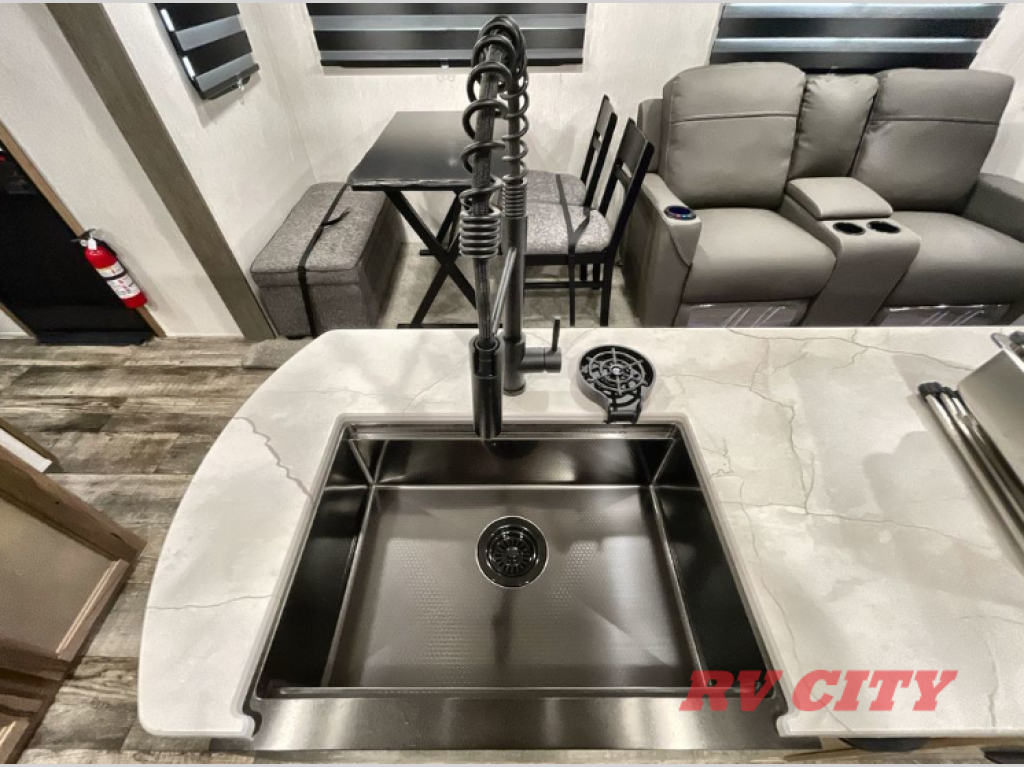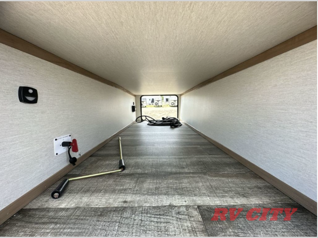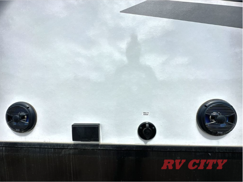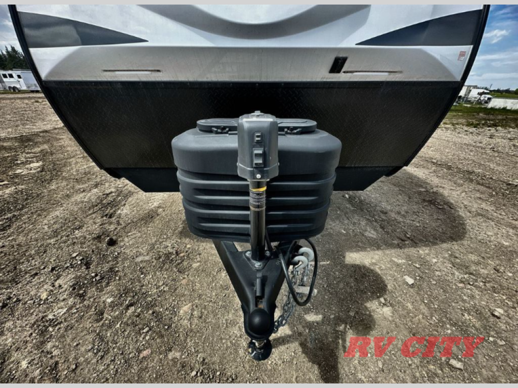 This trailer has it all for maximum comfort and convenience as well as entertainment! The rear living area includes a deluxe tri-fold hide-a-bed sofa with a rear window for great views of your campsite, and dual opposing slides widen this area so you can visit with friends. You'll also find theater seating with heat, light, and massage, plus a free-standing table with two fixed and two folding chairs. Enjoy the fireplace on a cool night or when you want a little ambiance while seated inside. The kitchen island will be handy for food prep and serving, and the unique coffee bar will be a favorite as well. Two patio awnings will provide an outdoor living area; just grab your camping chairs from the full pass-through storage. When you want to call it a night, fall quickly to sleep on the queen bed in the front bedroom with easy access to a dual entry bathroom which offers a radius shower with opaque glass doors.
