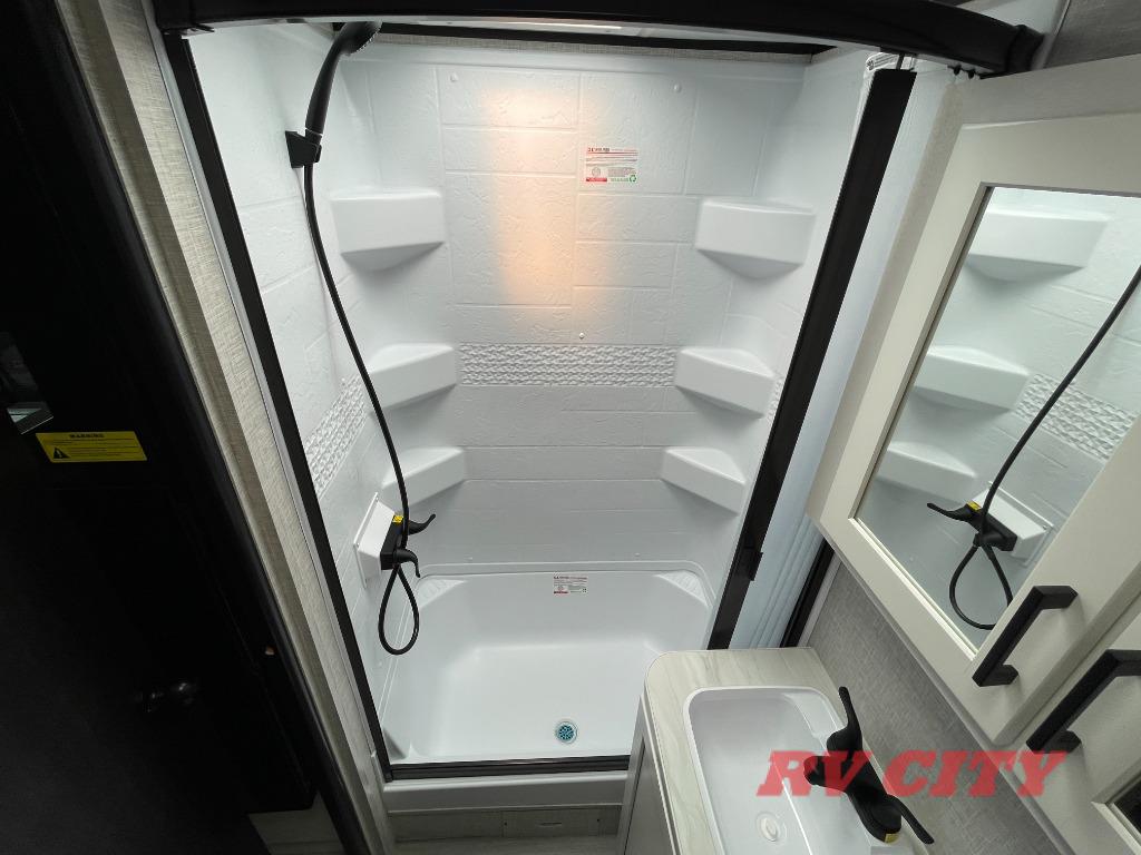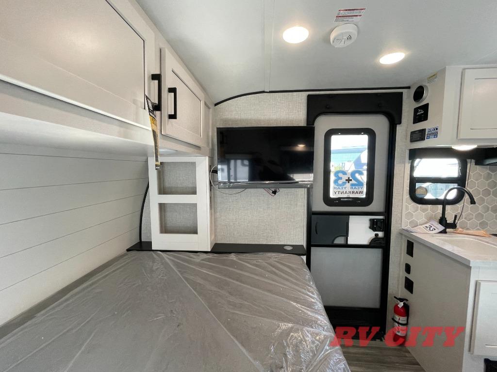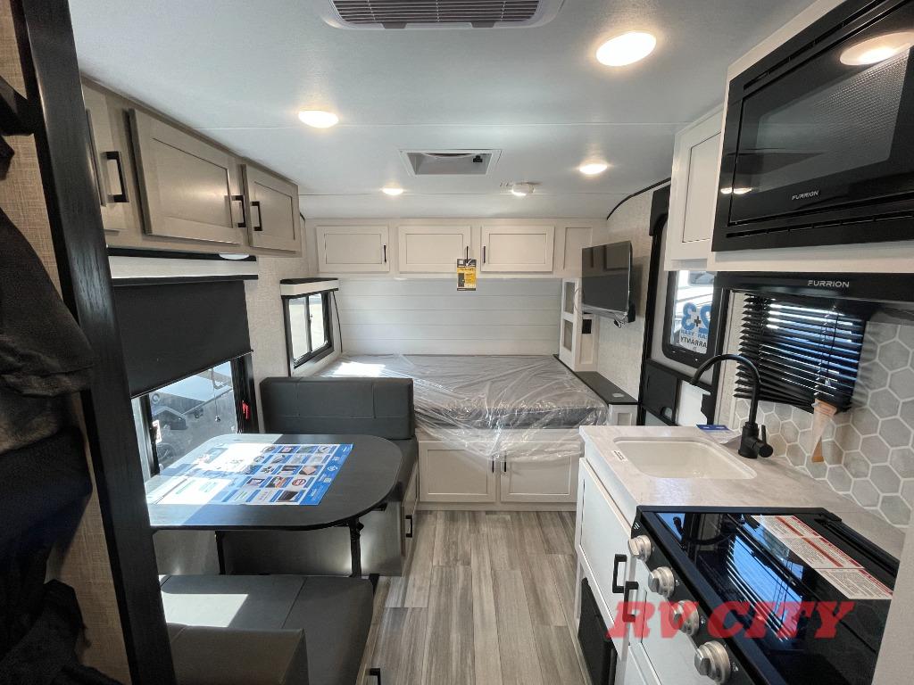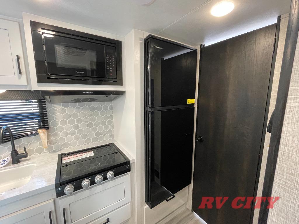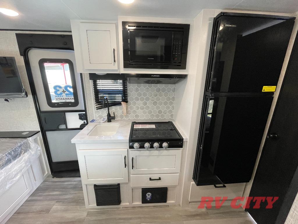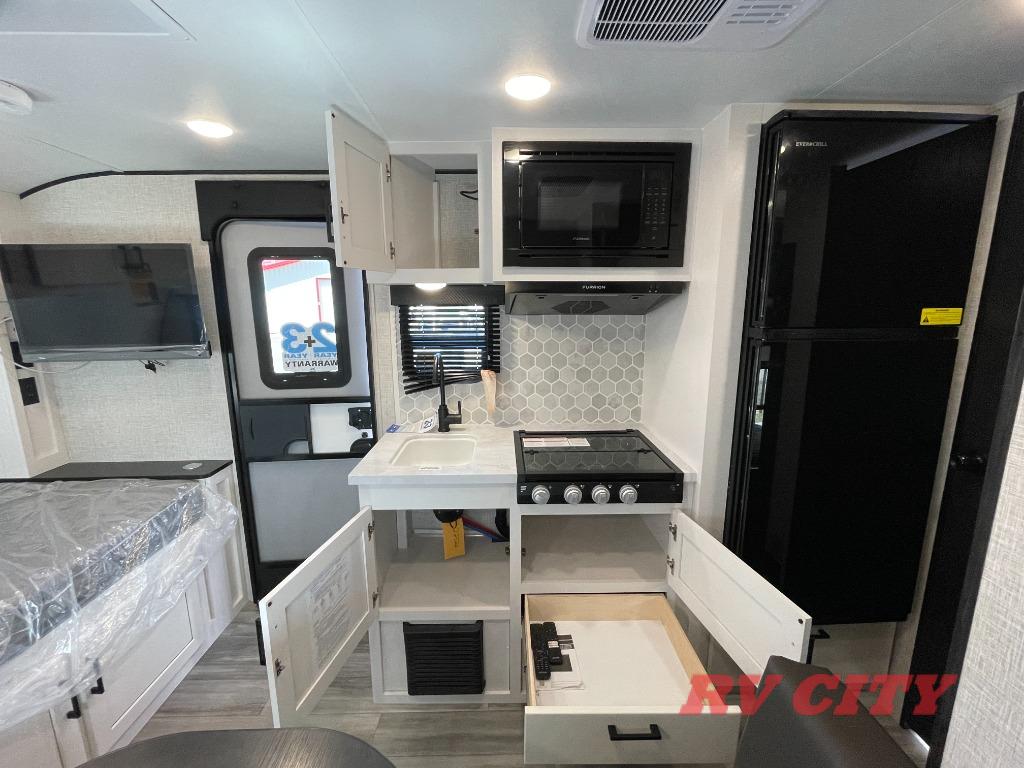Jayco's lightest travel trailer, the Jay Feather Micro is ready for adventure at the drop of a hat! The Climate Shield weather protection will let you camp well into the colder months and the Stronghold VBL with double-sized Azdel is ultra durable. The Jay Pro Package includes 16-inch American-made Goodyear off-road tires with self-adjusting brakes, a rear-mounted roof ladder, and the Overlander 1 Solar Package with a 200W solar panel. Additional exterior features include marine grade exterior speakers with blue LED accent lighting, a swing-out entry door assist handle, a power tongue jack, and more! Inside, you will love the 4-inch high-density dinette cushions with vinyl backing for easy cleaning, along with the handcrafted hardwood door/drawer fronts, residential style kitchen countertops, and decorative roller shades with a reflective barrier for better insulation.