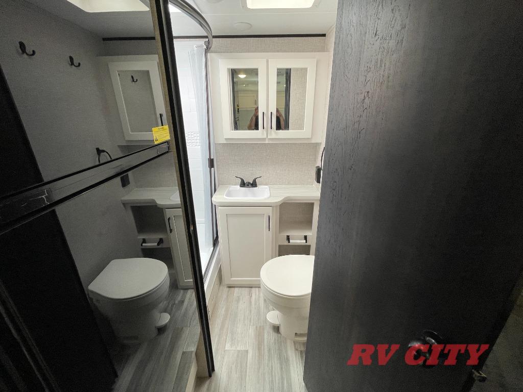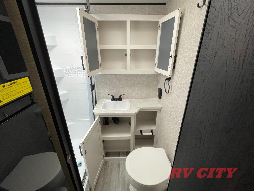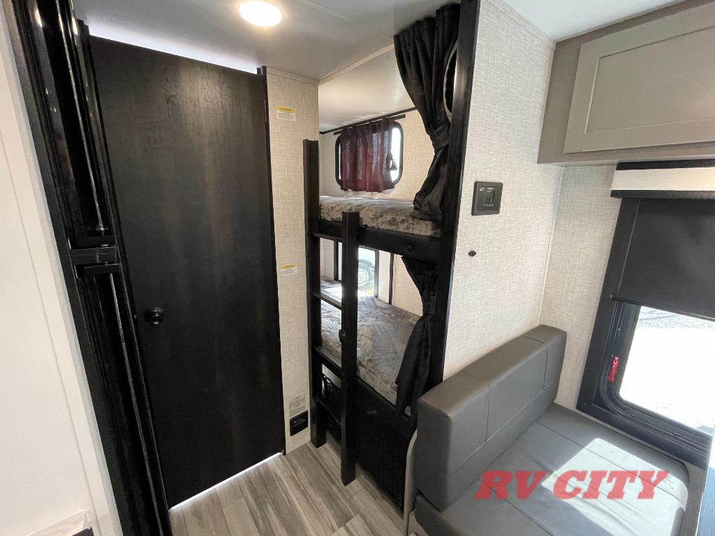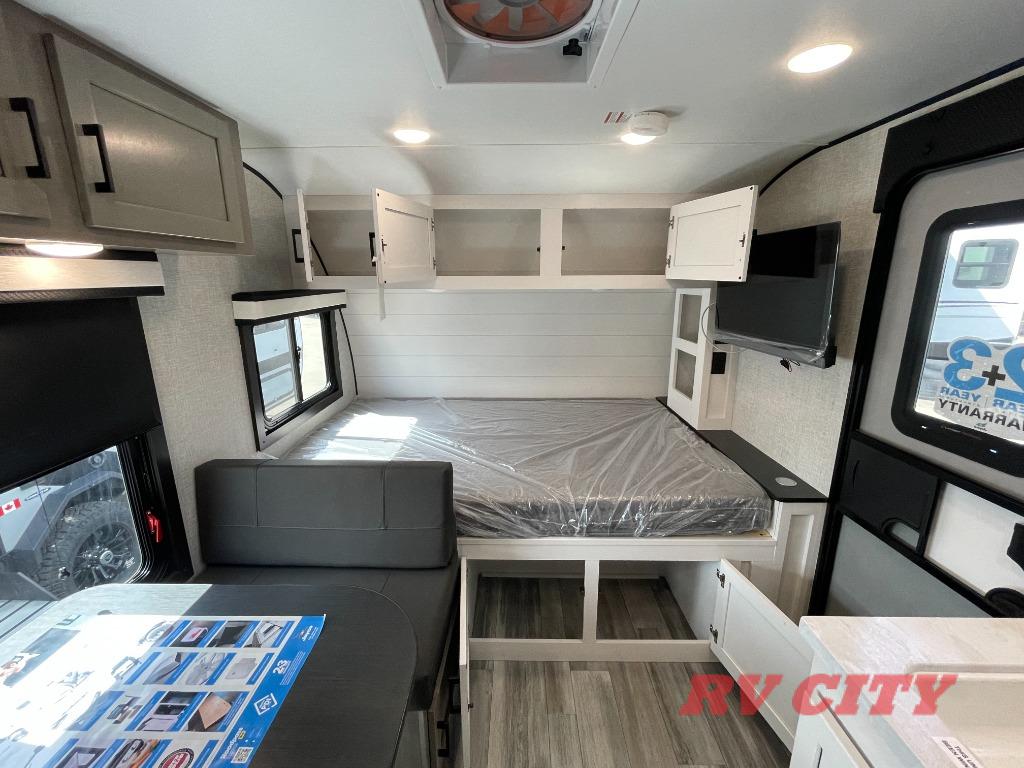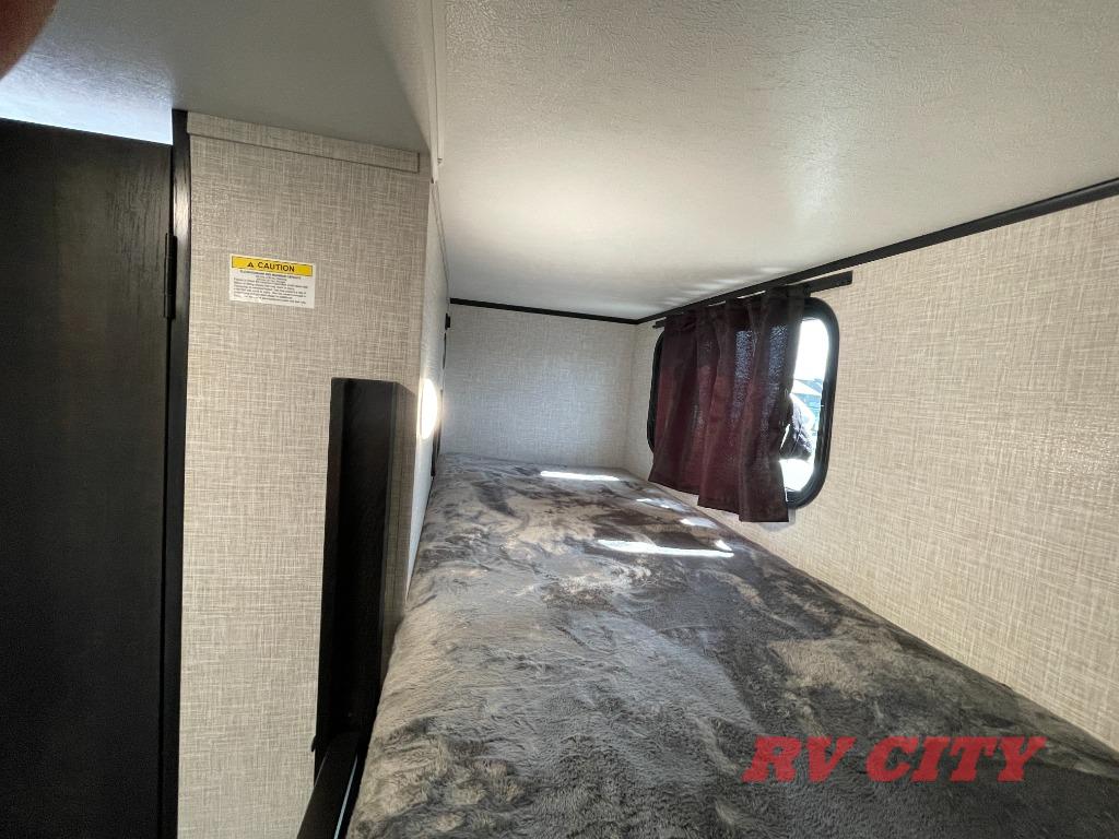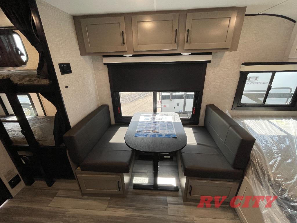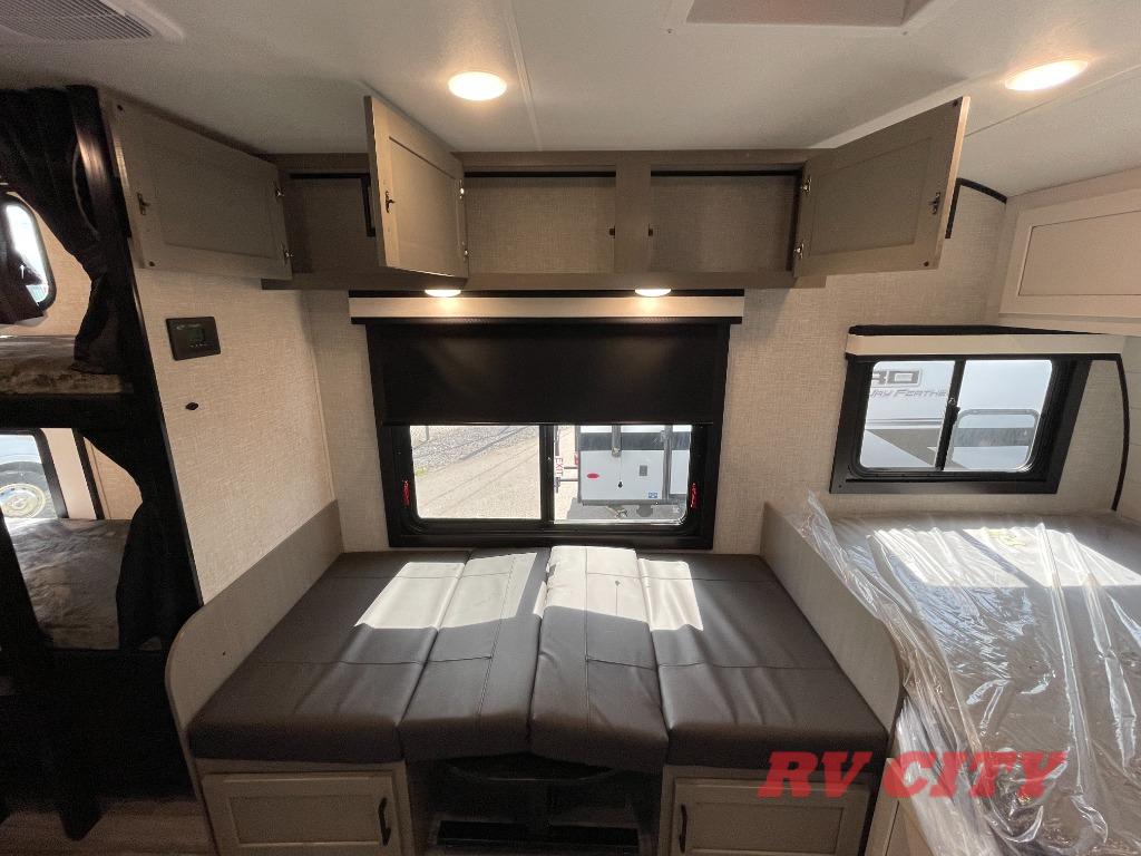 If you've been looking for a lightweight travel trailer with more sleeping space, your search is over with this model! There are bunk beds in the back near the full bath for convenience, a front 54" x 74" queen bed, plus a booth dinette that will double as dining and sleeping space. This model also includes overhead compartments for your belongings, plus exterior storage for you fishing poles or tackle boxes and a cargo door under the bunks for even more storage space!