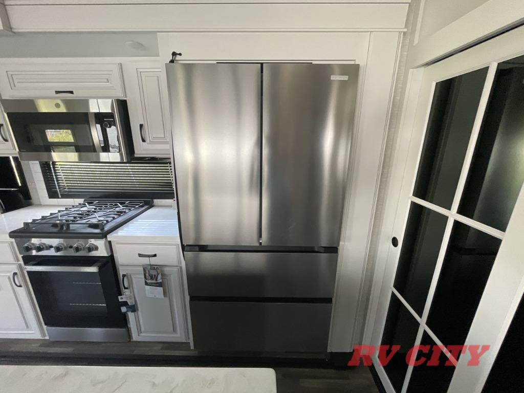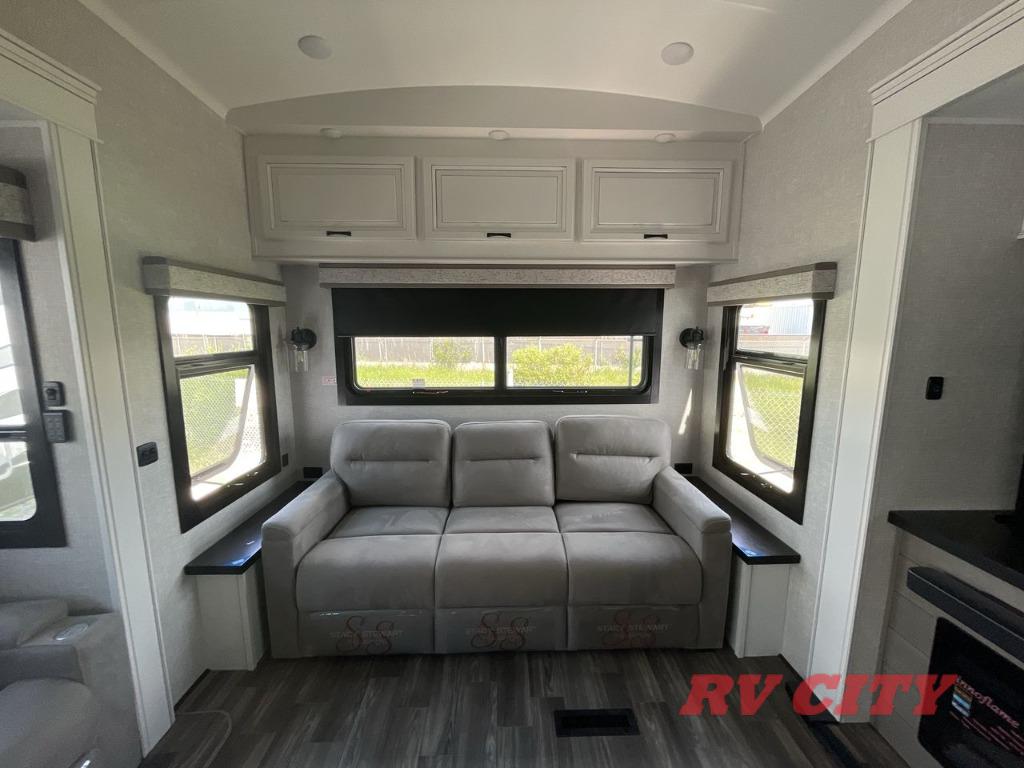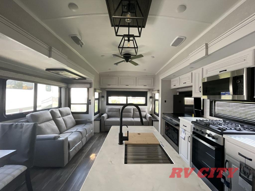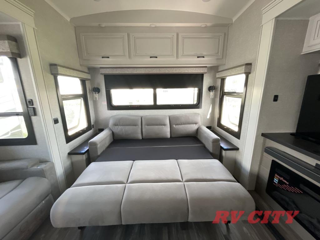 Finding the perfect RV park or campground is all you have to do, then you can load up and hit the road whether you are a full-timer or weekend warrior. The two electric awnings and the three slides are easy to set up and close, and you will have lots of interior and exterior storage to bring everything you might need. The kitchen offers a residential refrigerator and 24" stove, a 30" residential microwave, a kitchen island, a pantry and a pull-out countertop. You can relax on the tri-fold sofa and the theater seats while watching your shows on the 50" Smart LED HDTV with fully digital HDMI output and home entertainment system with subwoofer plus there is a fireplace below. Dine at the free standing table which includes a leaf, two free standing chairs and two folding chairs, or you can work from here as well. The front bedroom offers a king bed slide and a flip-top dresser with 32" TV, plus access to a spacious private front bath including dual sinks, a walk-in closet, bench seat, and more.