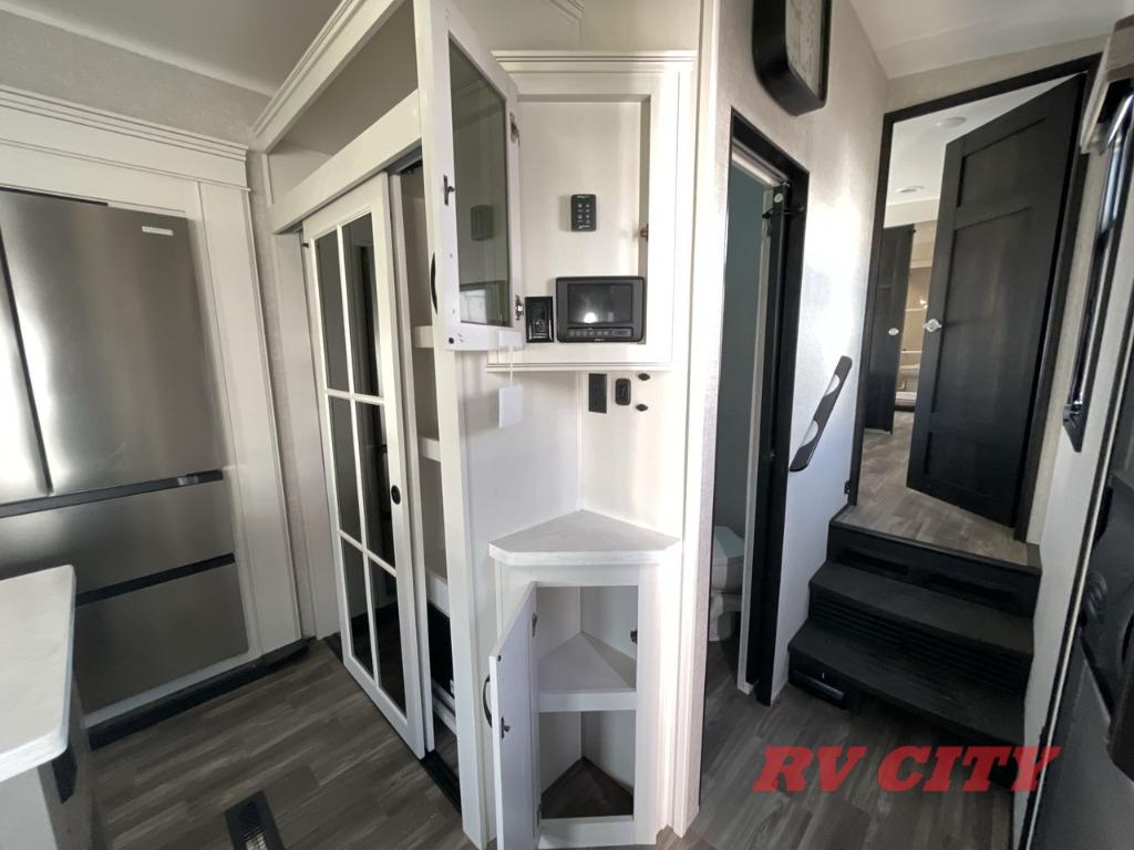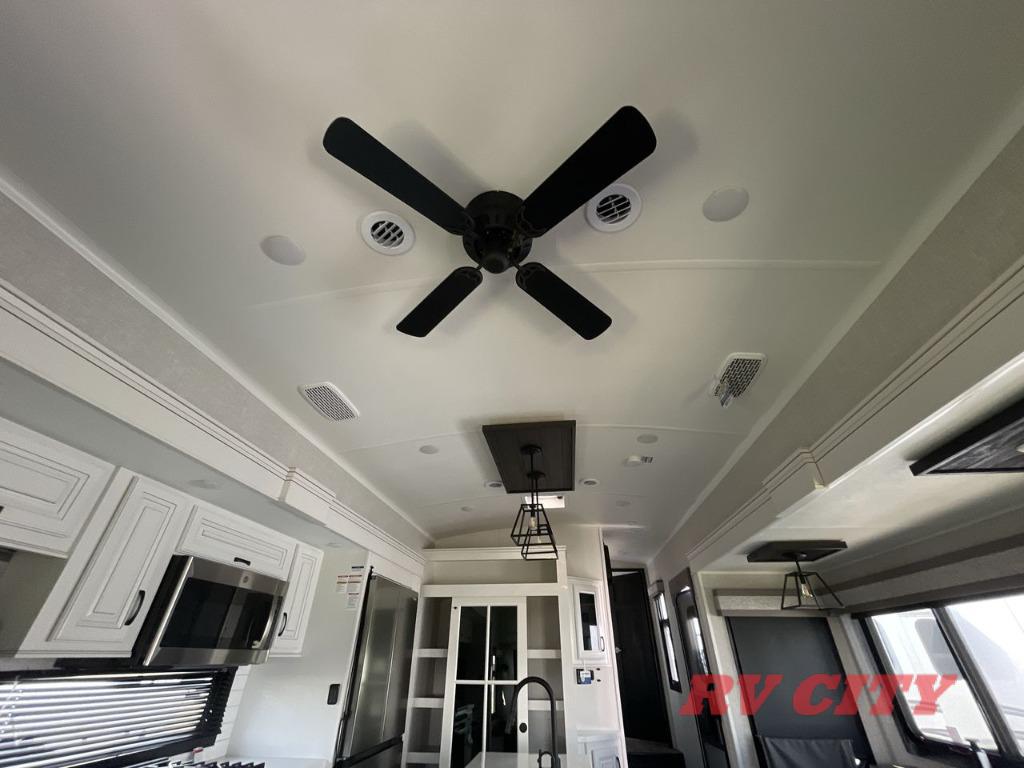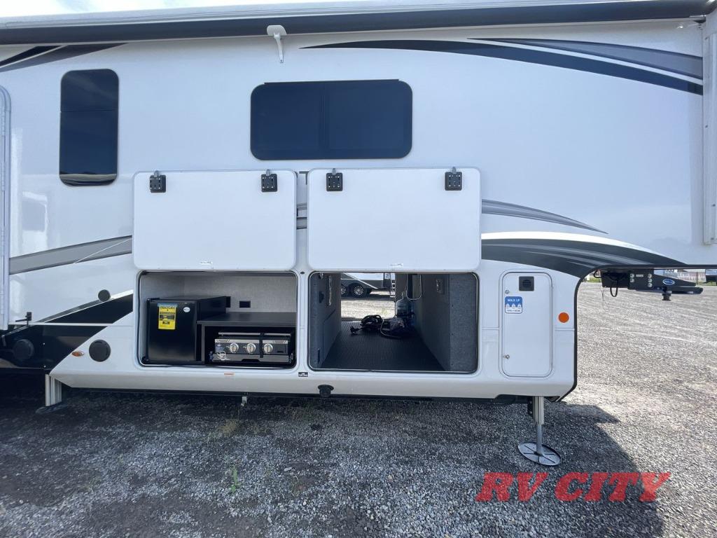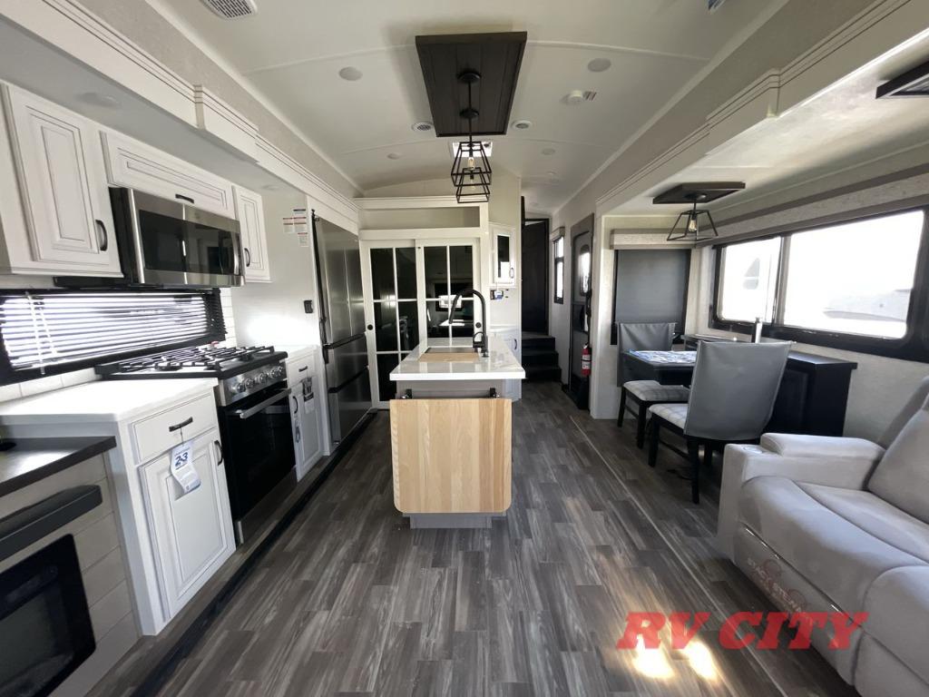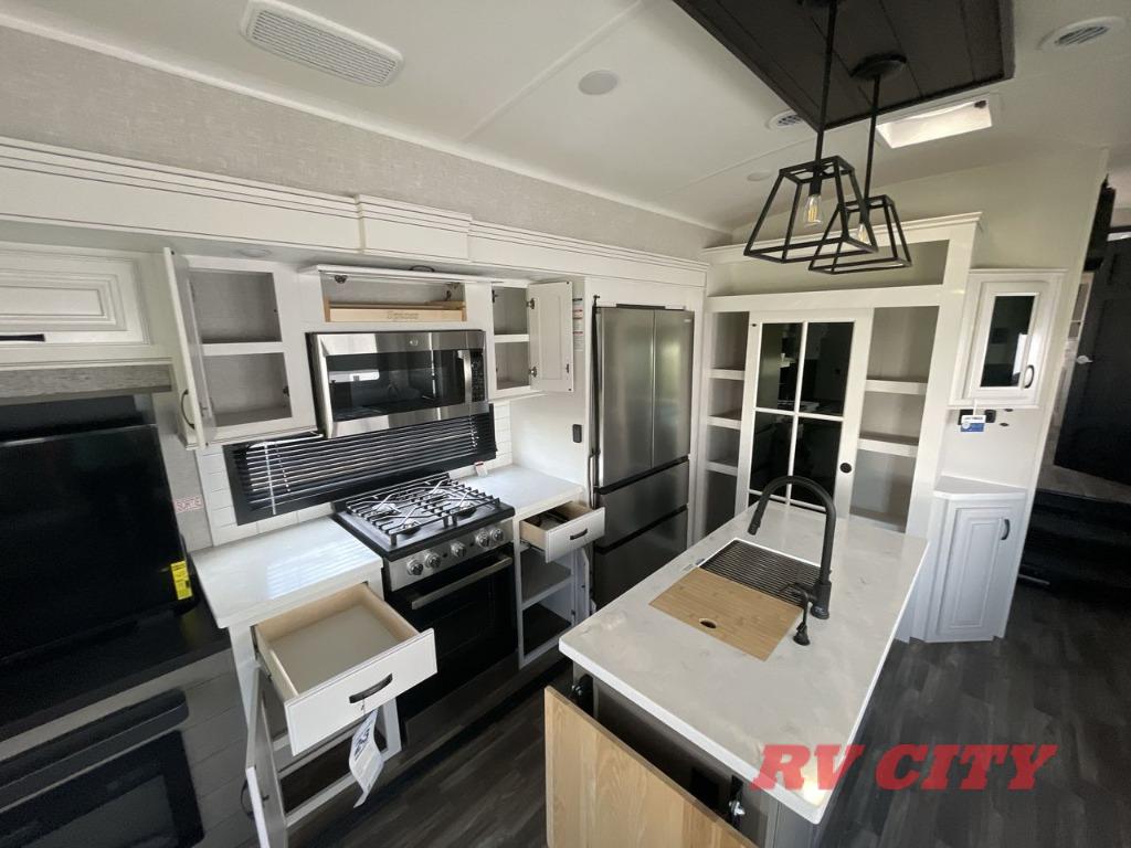 Finding the perfect RV park or campground is all you have to do, then you can load up and hit the road whether you are a full-timer or weekend warrior. The two electric awnings and the three slides are easy to set up and close, and you will have lots of interior and exterior storage to bring everything you might need. The kitchen offers a residential refrigerator and 24" stove, a 30" residential microwave, a kitchen island, a pantry and a pull-out countertop. You can relax on the tri-fold sofa and the theater seats while watching your shows on the 50" Smart LED HDTV with fully digital HDMI output and home entertainment system with subwoofer plus there is a fireplace below. Dine at the free standing table which includes a leaf, two free standing chairs and two folding chairs, or you can work from here as well. The front bedroom offers a king bed slide and a flip-top dresser with 32" TV, plus access to a spacious private front bath including dual sinks, a walk-in closet, bench seat, and more.
