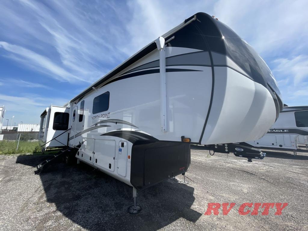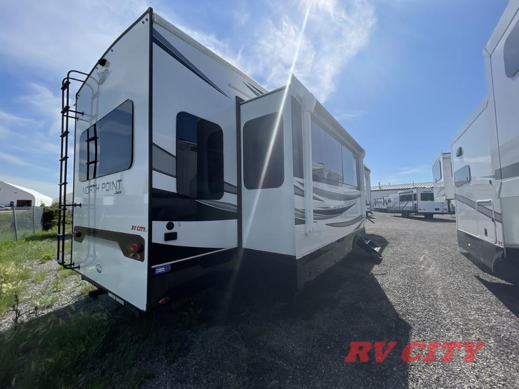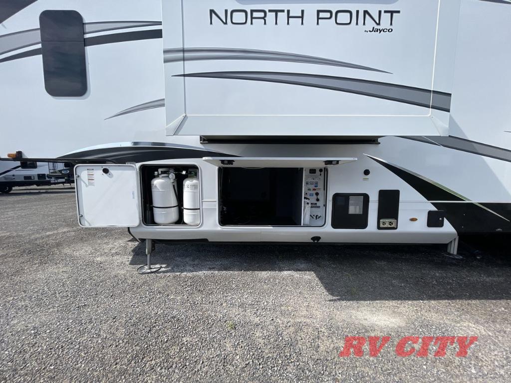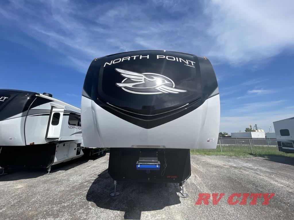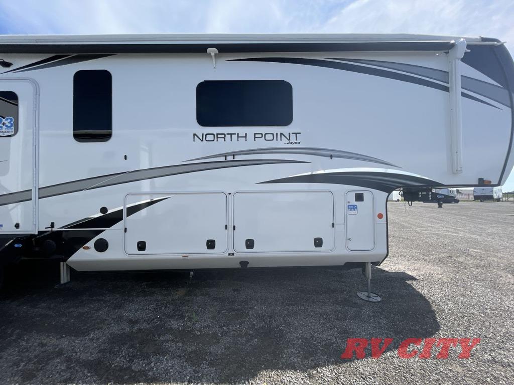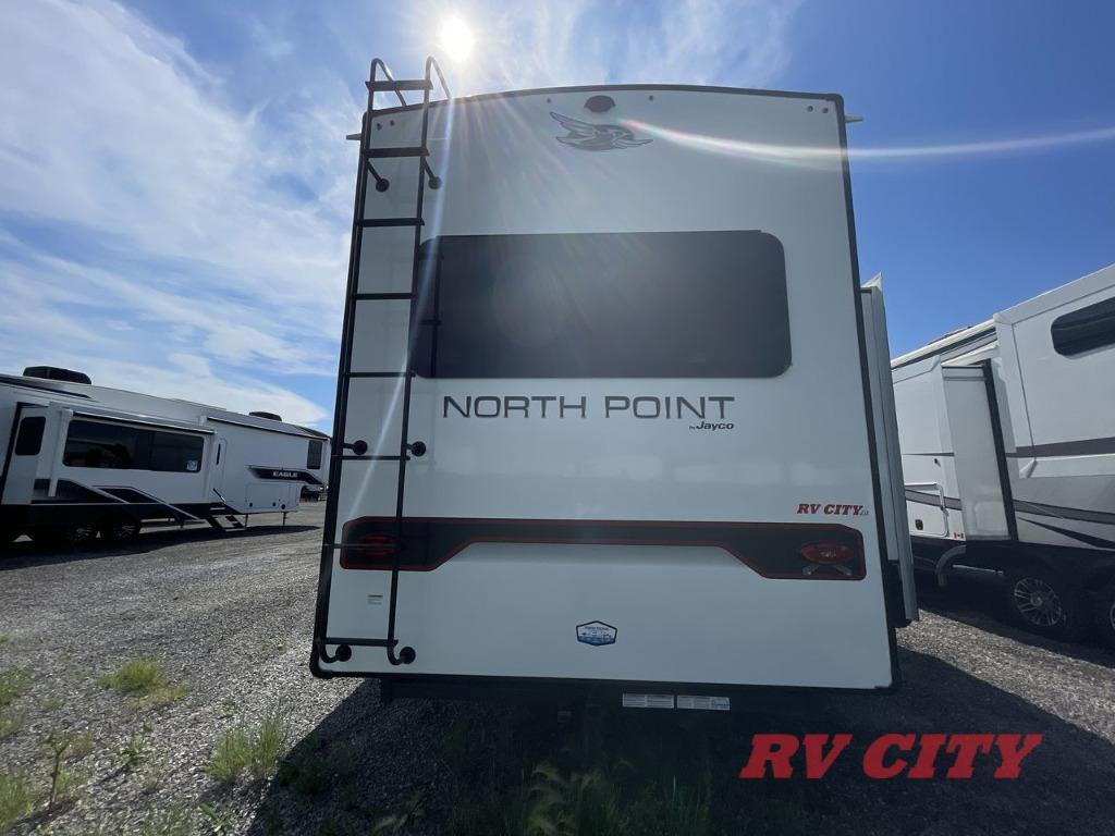With any North Point fifth wheel by Jayco you begin with a strong foundation with a custom frame, designed and sized specifically to best support each unit. Constructed with Stronghold VBL™ aluminum framed, vacuum bond laminated walls and the Magnum Truss™ XL6™ roof system with a one-piece, seamless roof material, which is the strongest tested roof in the industry. The 5-Star Handling package is included with Uniroyal tires, a MORryde rubber pin box, Dexter axles with Nev-R-Adjust brakes, MORryde CRE-3000 rubberized suspension and wet bolt fasteners and bronze bushings. The interior has handcrafted hardwood glazed doors and drawers, vinyl flooring throughout, a vessel bowl sink with high rise faucet in the main bathroom, plus so much more you just have to see one to believe it all!