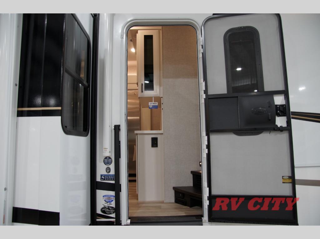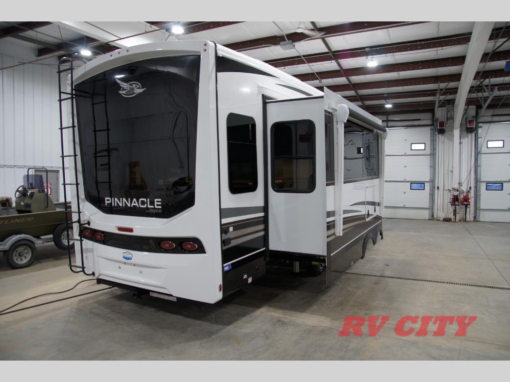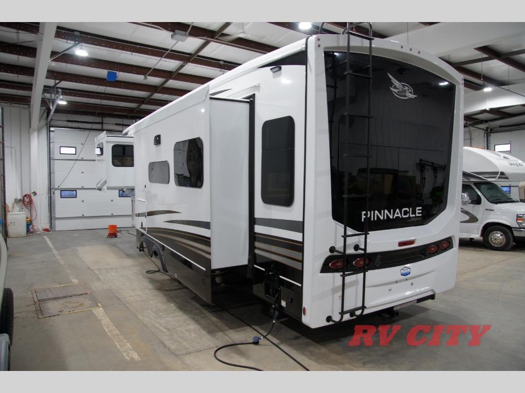 Each Pinnacle fifth wheel features Stronghold VBL lamination for the lightest, yet strongest construction in the RV industry. Add that to the Magnum Truss XL6 roof system and Climate Shield zero-degree tested weather protection and you'll be enjoying your fifth wheel for years to come. Some of the exterior conveniences you will appreciate are the Keyed-Alike lock system, the fully enclosed, universal docking center, and the 6-point hydraulic auto-leveling system for quick and easy set up. The 5 Star Handling Package will make towing a fifth wheel a walk in the park, and the two Whisper Quiet A/C units will keep you comfortable during the hot summer months. Inside, you'll enjoy the farmhouse stainless steel sink, the handcrafted hardwood glazed cabinetry, the vinyl flooring throughout, plus many more comforts. There is even a central vacuum system, a wireless remote control system, USB ports throughout, plus many more conveniences to make each trip enjoyable.