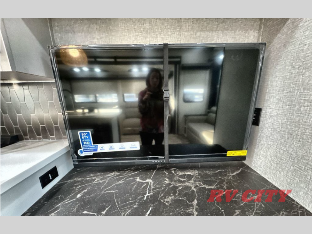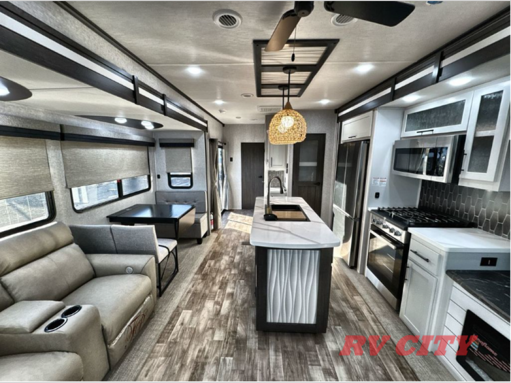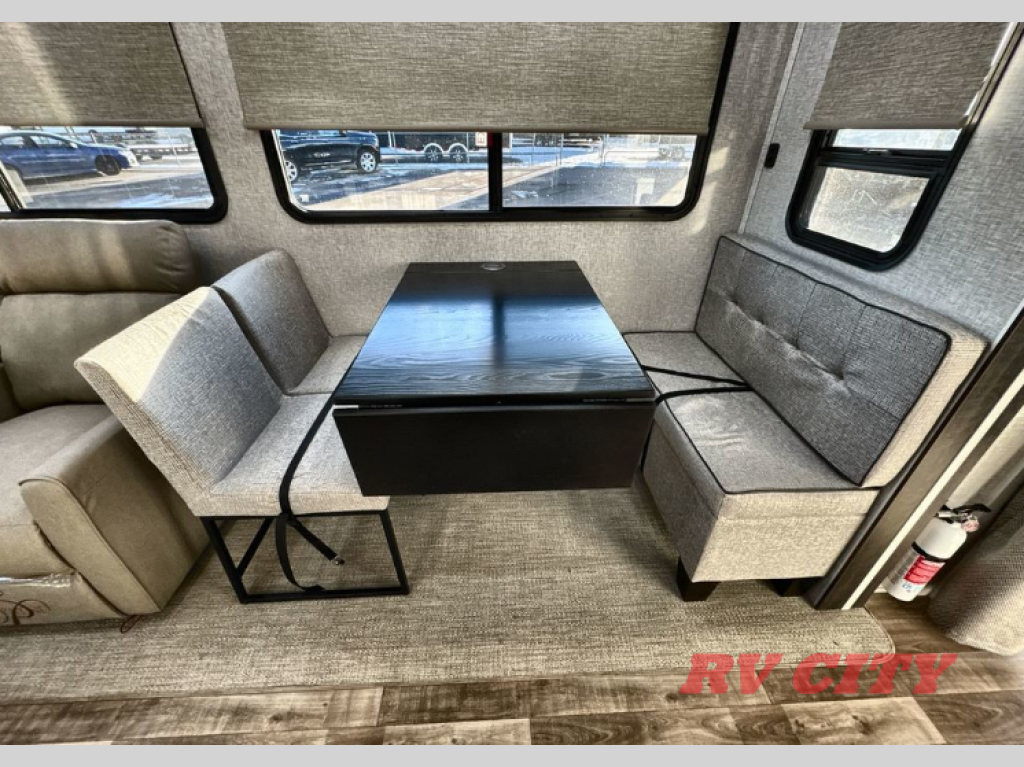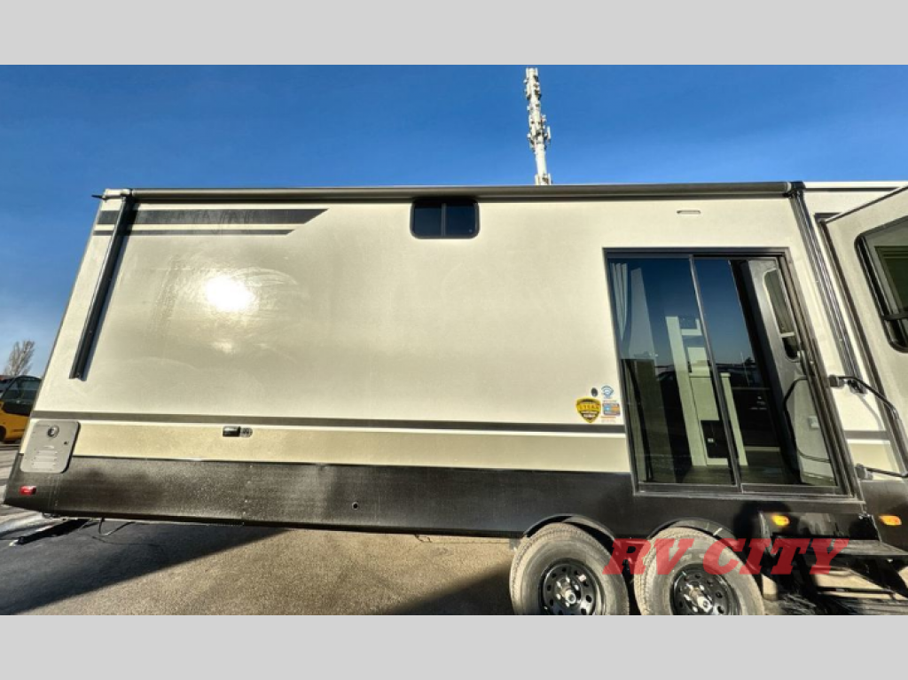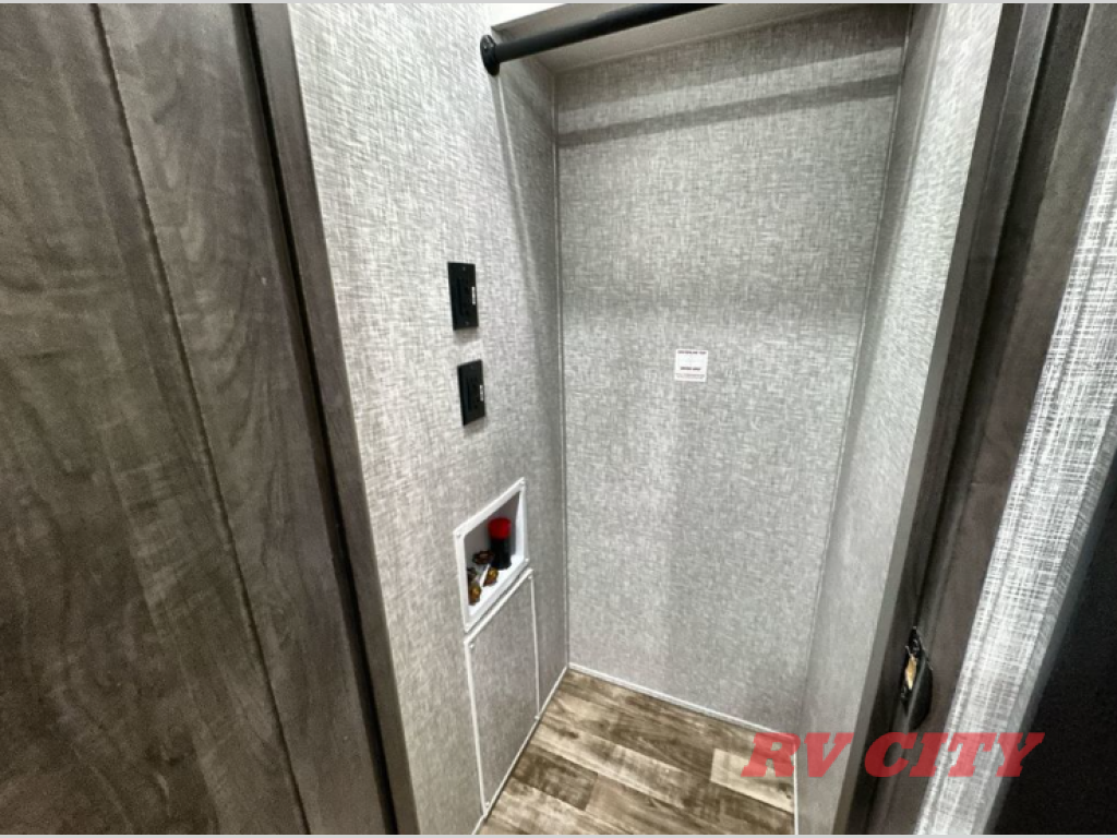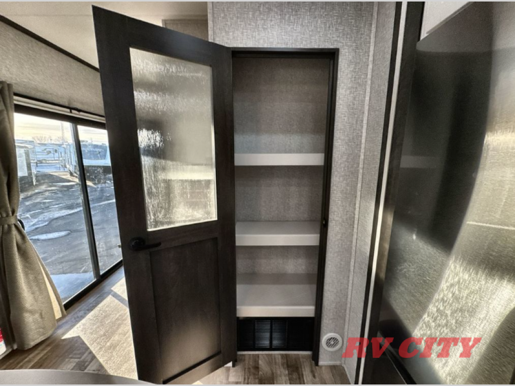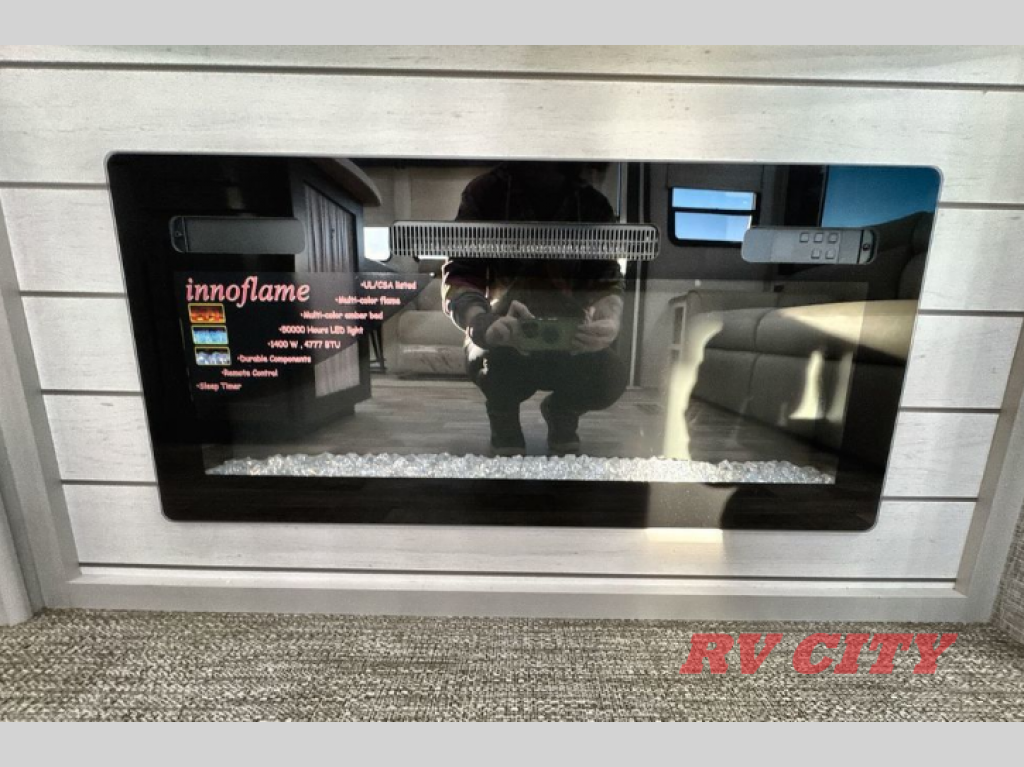 Get away to your own master suite at your favorite destination today! You can sleep on the king bed slide out with plenty of storage for your clothes on the opposite side and get cleaned up in the full bathroom in the 48" shower. There are even dual bath sinks so you both can brush your teeth at the same time. There is also a space that has been prepped for an optional washer/dryer if you like. An added convenience is the centrally located half bath across from the patio doors for easy entry and exit. The front living area provides a sofa that can double as sleeping space for your kids or overnight guests, and the theater seats allow you to clearly see the 50" lift TV with fireplace below. The cook will love the kitchen island, hutch, and pantry with a shelf, as well as the appliances. Dining or even doing a little work will be comfortable while seated at the free standing table with chairs and bench seating.