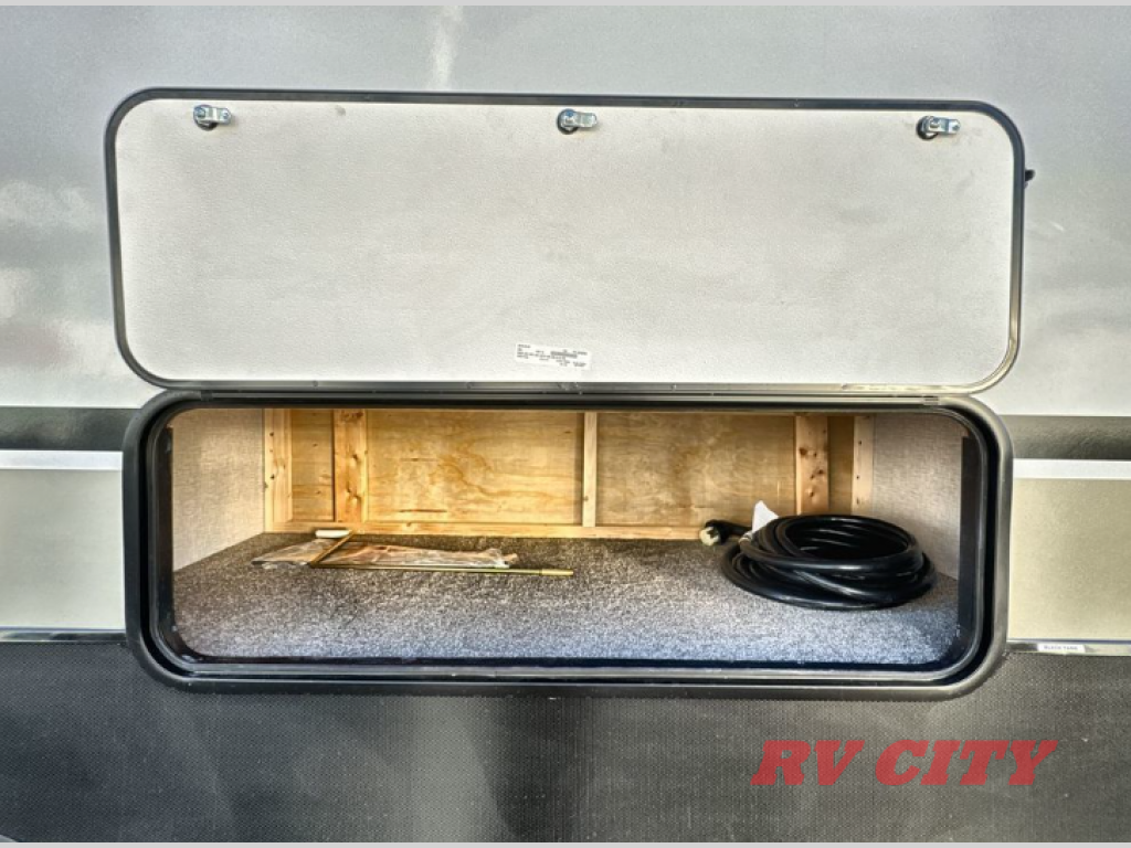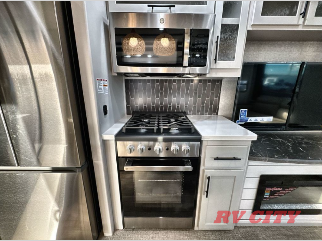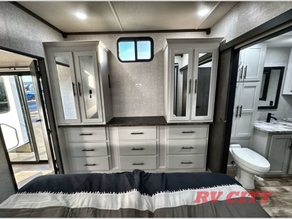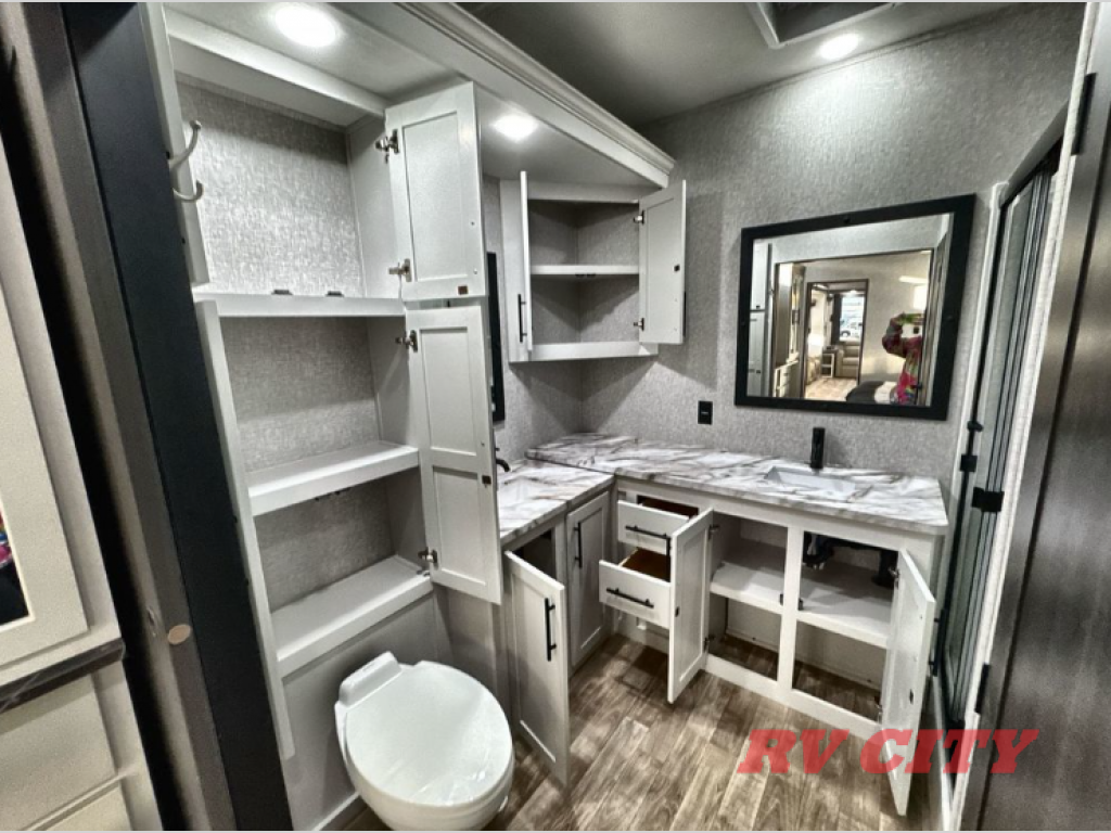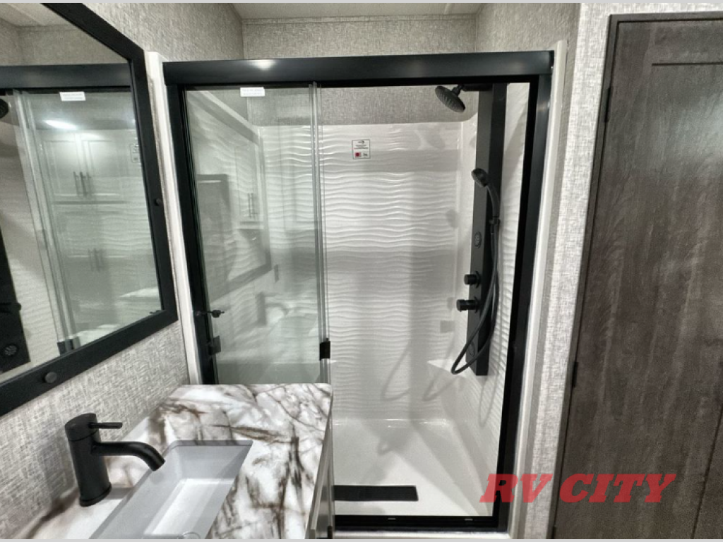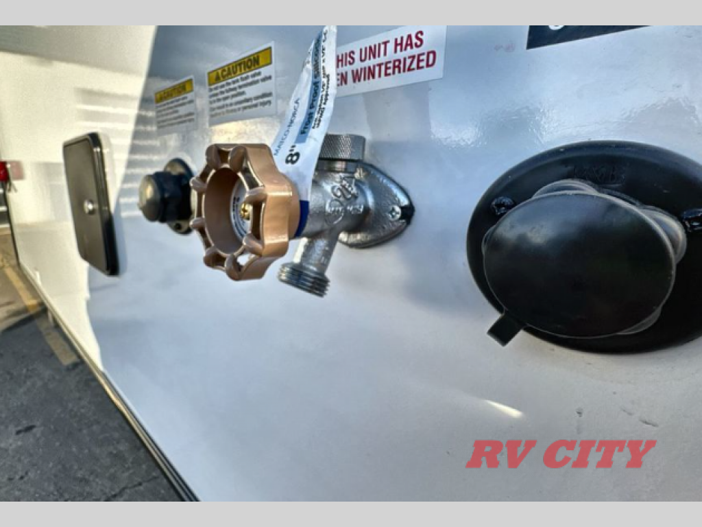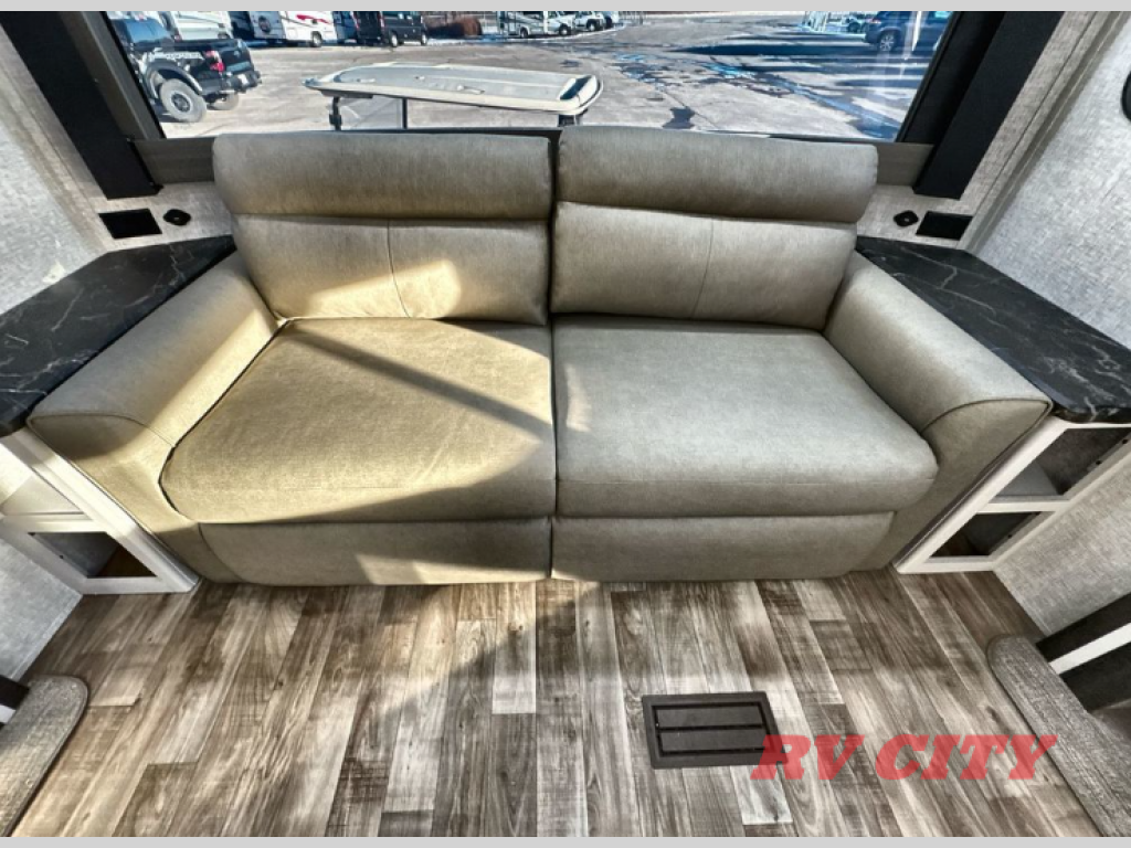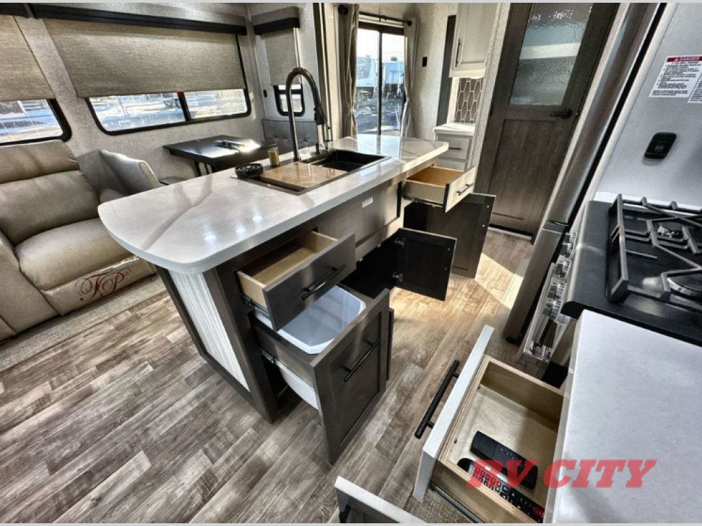 Get away to your own master suite at your favorite destination today! You can sleep on the king bed slide out with plenty of storage for your clothes on the opposite side and get cleaned up in the full bathroom in the 48" shower. There are even dual bath sinks so you both can brush your teeth at the same time. There is also a space that has been prepped for an optional washer/dryer if you like. An added convenience is the centrally located half bath across from the patio doors for easy entry and exit. The front living area provides a sofa that can double as sleeping space for your kids or overnight guests, and the theater seats allow you to clearly see the 50" lift TV with fireplace below. The cook will love the kitchen island, hutch, and pantry with a shelf, as well as the appliances. Dining or even doing a little work will be comfortable while seated at the free standing table with chairs and bench seating.