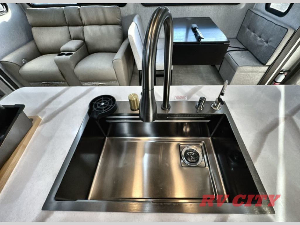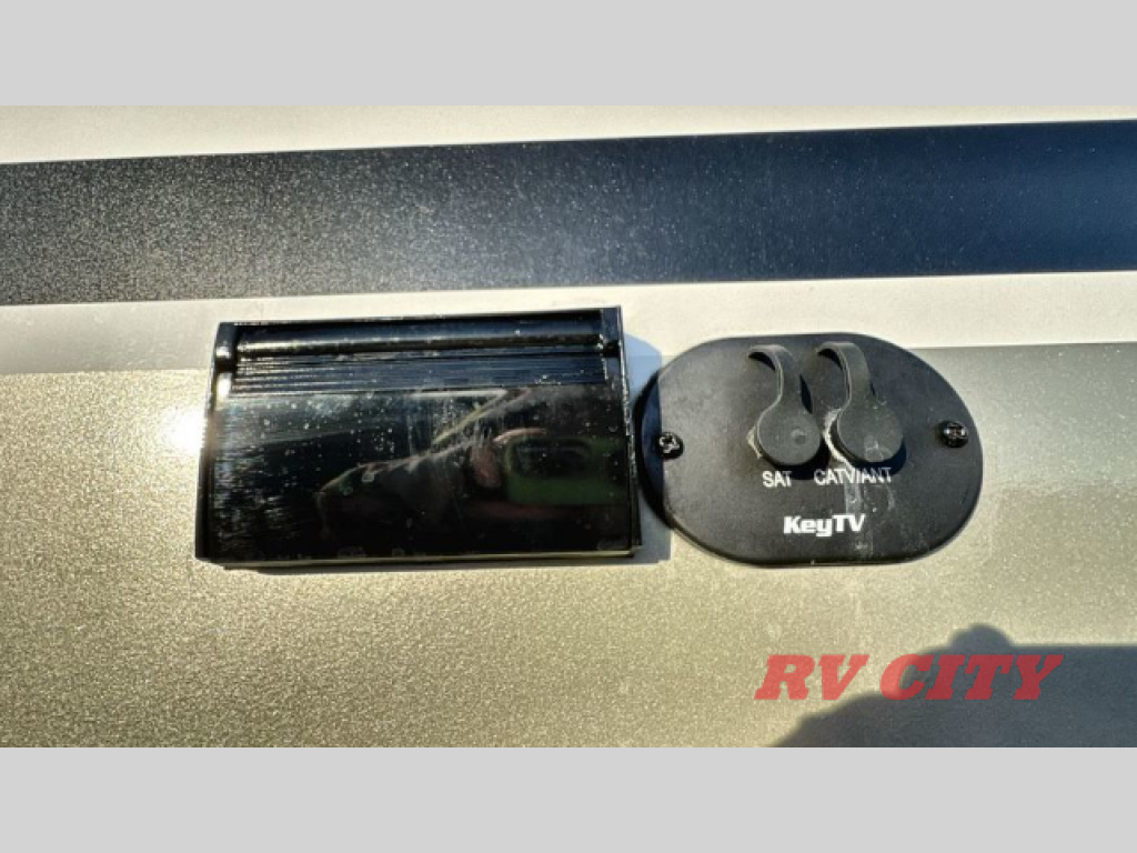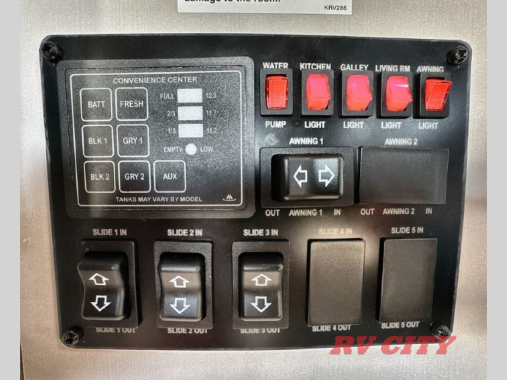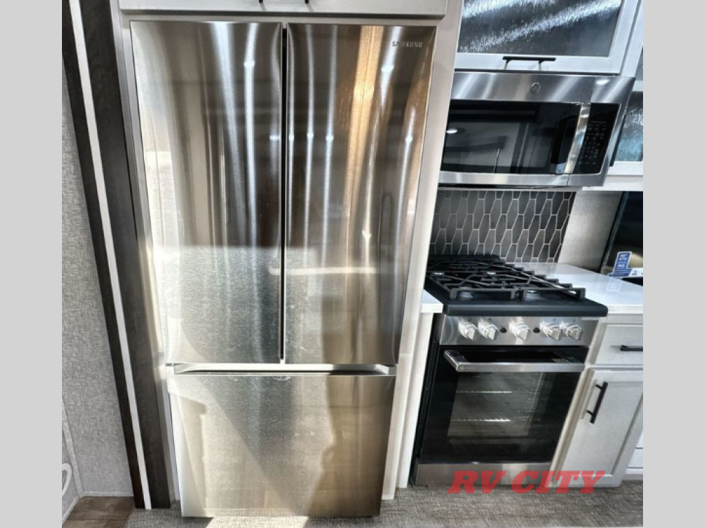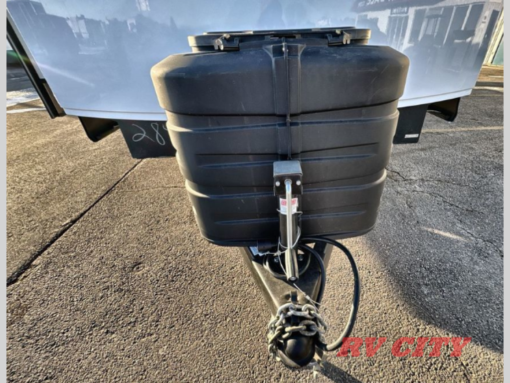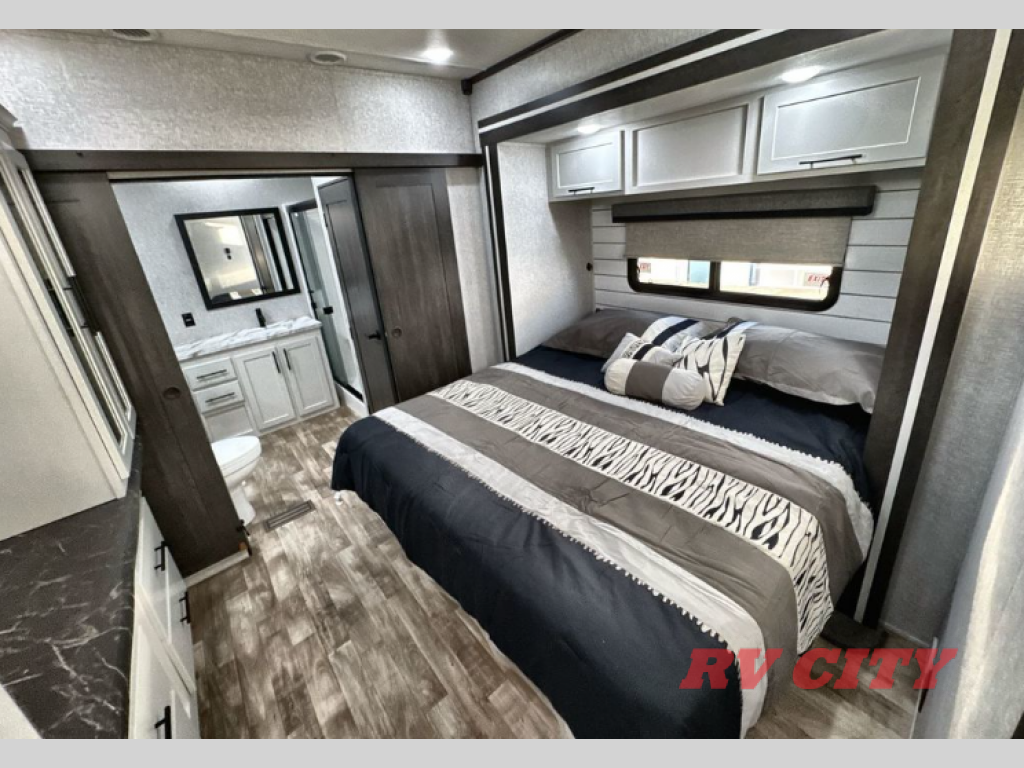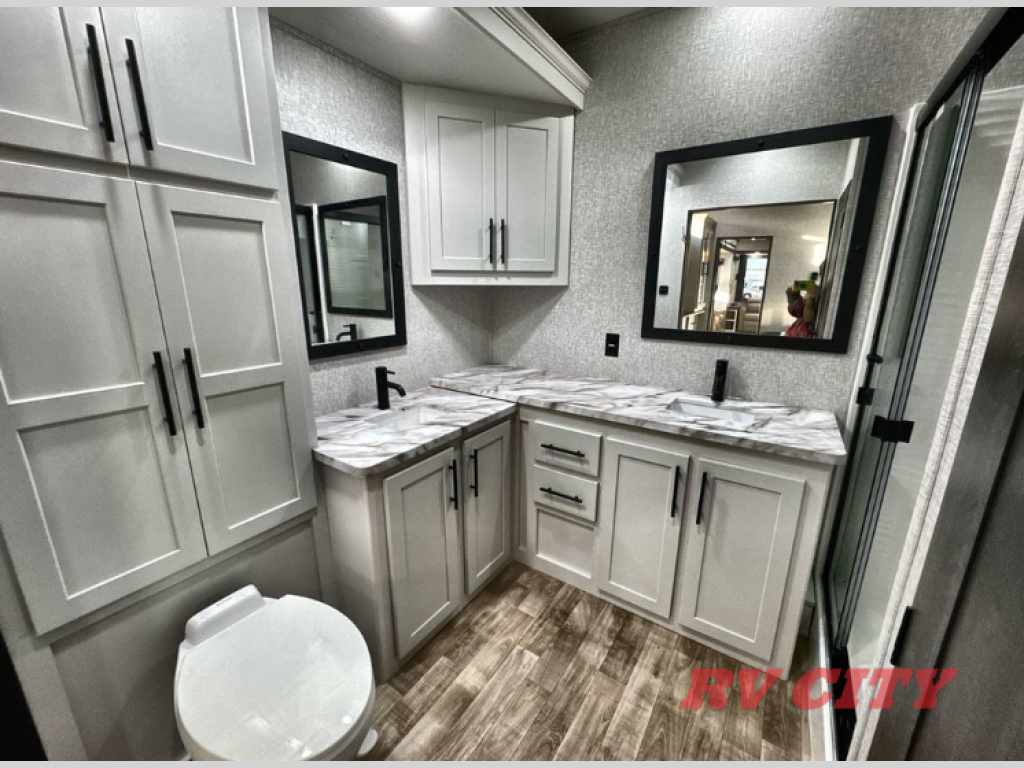 Get away to your own master suite at your favorite destination today! You can sleep on the king bed slide out with plenty of storage for your clothes on the opposite side and get cleaned up in the full bathroom in the 48" shower. There are even dual bath sinks so you both can brush your teeth at the same time. There is also a space that has been prepped for an optional washer/dryer if you like. An added convenience is the centrally located half bath across from the patio doors for easy entry and exit. The front living area provides a sofa that can double as sleeping space for your kids or overnight guests, and the theater seats allow you to clearly see the 50" lift TV with fireplace below. The cook will love the kitchen island, hutch, and pantry with a shelf, as well as the appliances. Dining or even doing a little work will be comfortable while seated at the free standing table with chairs and bench seating.