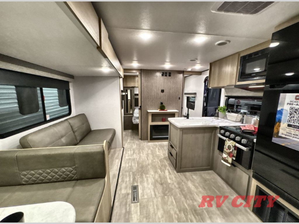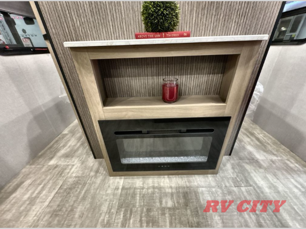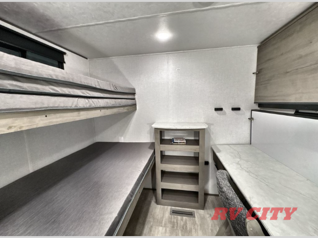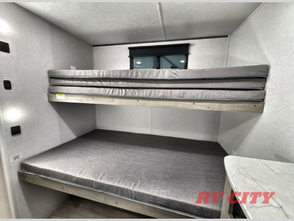Pack your bags and head out on a great family vacation in this travel trailer! You will enjoy a good night's rest on the queen bed in the front private bedroom, and the kids will enjoy having their own rear private bunkhouse with a set of bunk beds and a fold down bed above a booth dinette. If you need an extra sleeping space, then you can transform the living area booth dinette. The theater seating offers a comfortable place to sit while relaxing in front of the fireplace. The fully equipped kitchen has everything you need to prepare your best home cooked meals. After a fun-filled day at the beach, you can head to the full bathroom to rinse the sand out of your hair in the shower with exhaust fan!