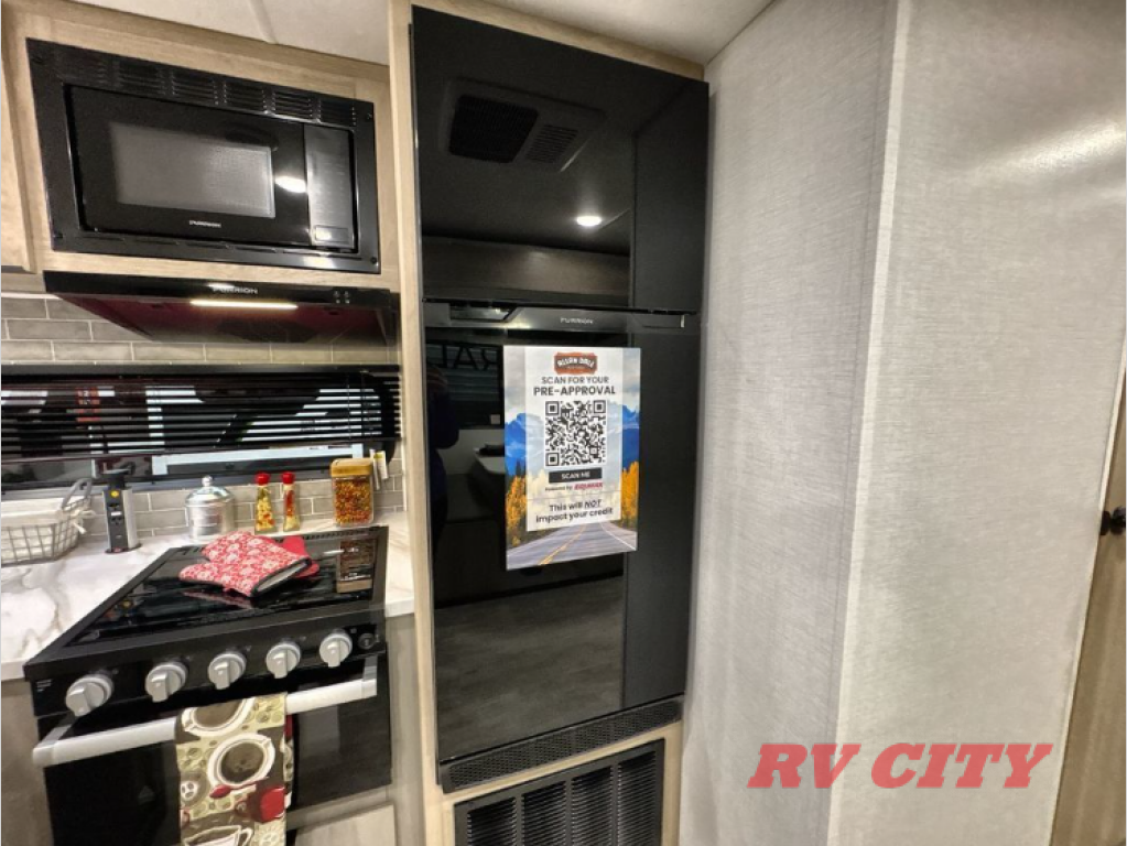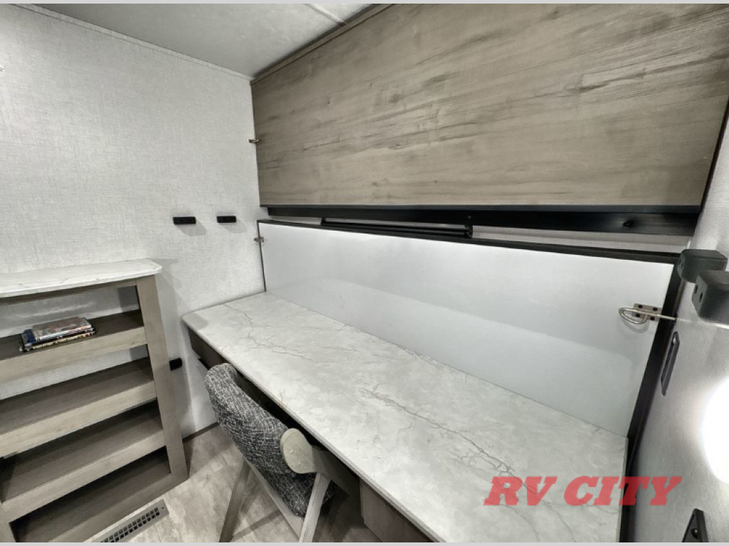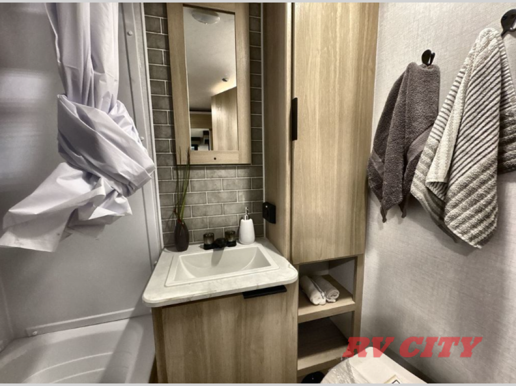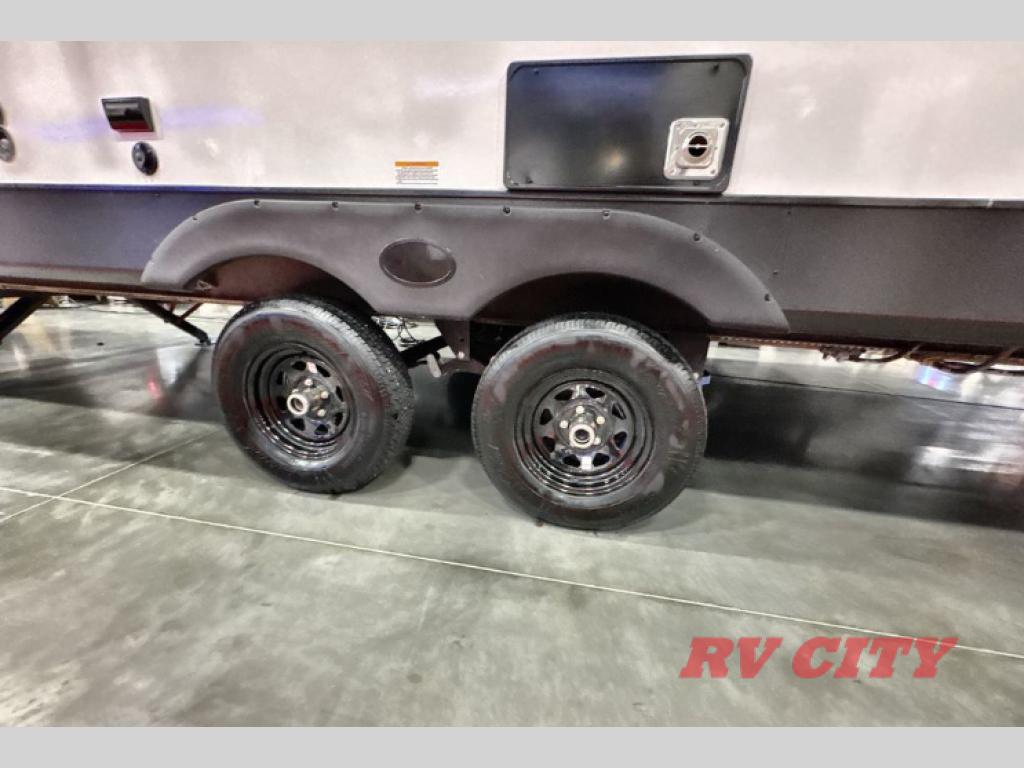 Pack your bags and head out on a great family vacation in this travel trailer! You will enjoy a good night's rest on the queen bed in the front private bedroom, and the kids will enjoy having their own rear private bunkhouse with a set of bunk beds and a fold down bed above a booth dinette. If you need an extra sleeping space, then you can transform the living area booth dinette. The theater seating offers a comfortable place to sit while relaxing in front of the fireplace. The fully equipped kitchen has everything you need to prepare your best home cooked meals. After a fun-filled day at the beach, you can head to the full bathroom to rinse the sand out of your hair in the shower with exhaust fan!