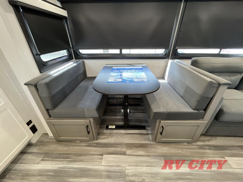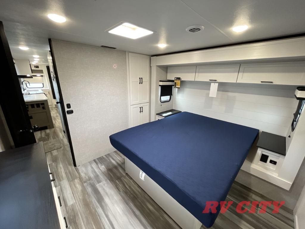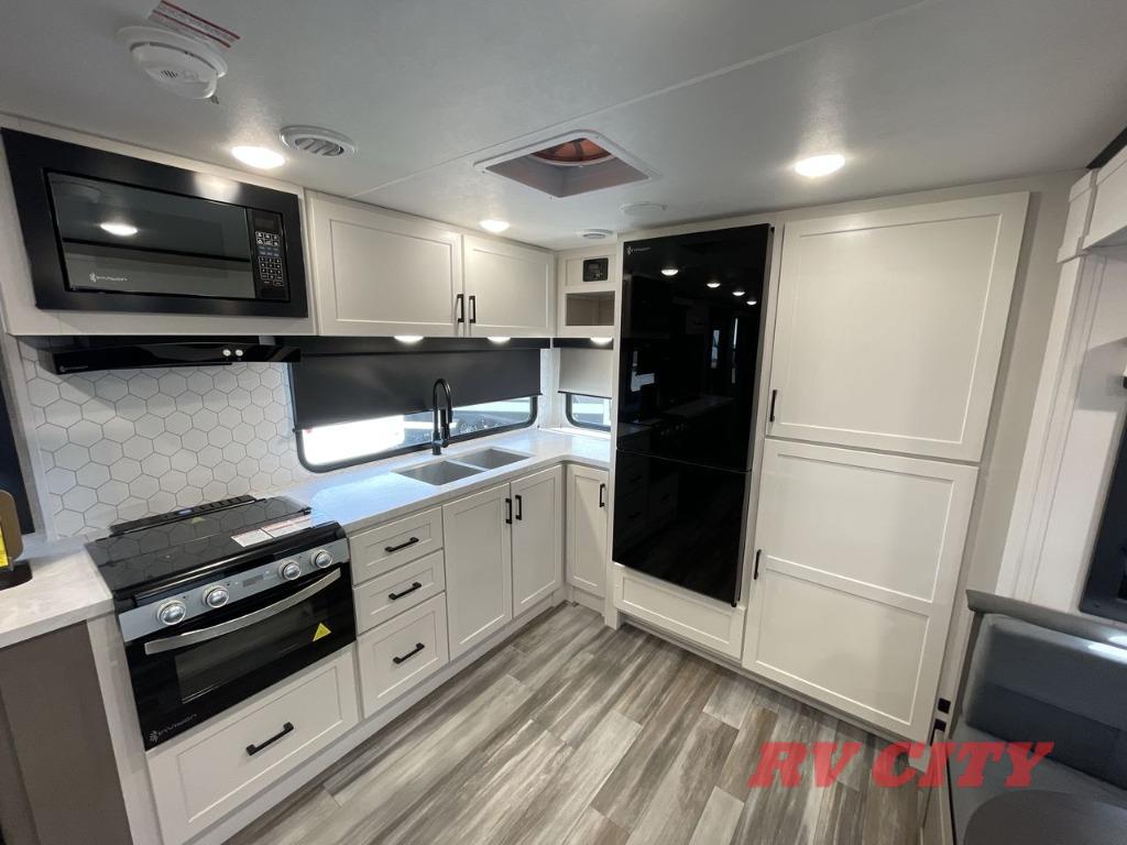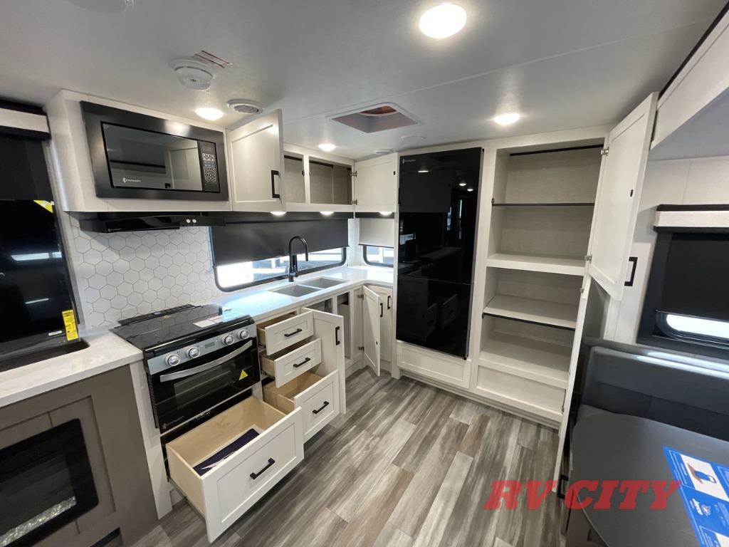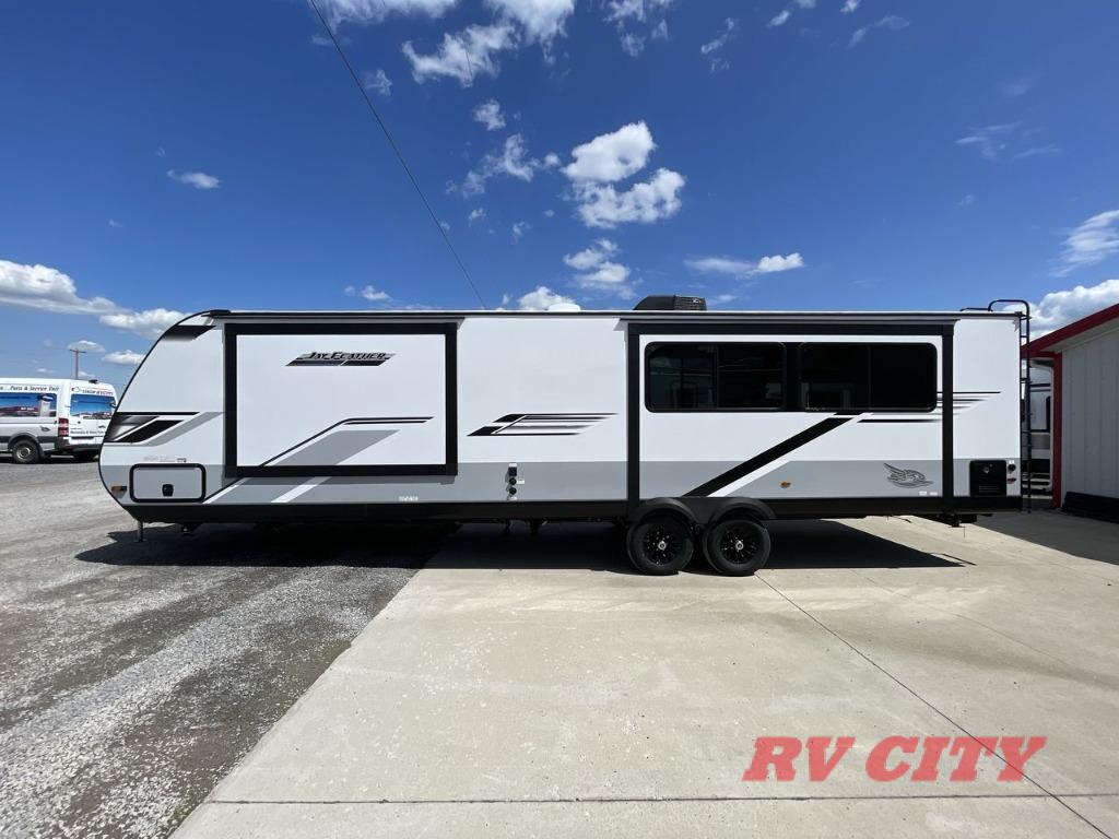 With any Jay Feather travel trailer by Jayco, you will enjoy lightweight towing, convenient exterior amenities, and at-home comforts inside! The Overlander 1 Solar Package included within the Jay Sport Package comes with a 200W solar panel and a 30-amp digital controller so you can enjoy some off-grid camping. There is also a modern graphics package with a dual-colored sidewall, LCI Solid Step fold-down aluminum tread steps on the main entry door, and Climate Shield 0 -100° F tested weather insulation package that will allow you to camp in all sorts of climates. The Customer Value Package will make time outdoors easier than ever with a power tongue jack and a Rock Solid stabilizer system, plus American-made nitro-filled Goodyear tires with self-adjusting electric brakes. More exterior features include a Keyed-Alike locking system, marine grade exterior speakers, a Magnum Truss roof system, and the list goes on! And we haven't even touched on the interior comforts, like the residential style seamless countertops and vinyl flooring throughout, decorative backsplash, handcrafted hardwood door/drawer fronts, and multiple USB charging ports to keep you going!