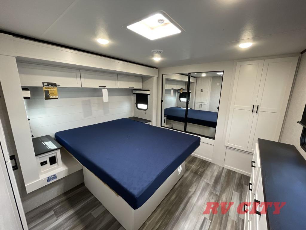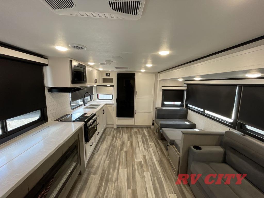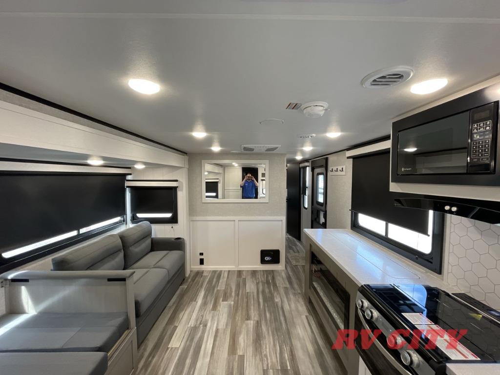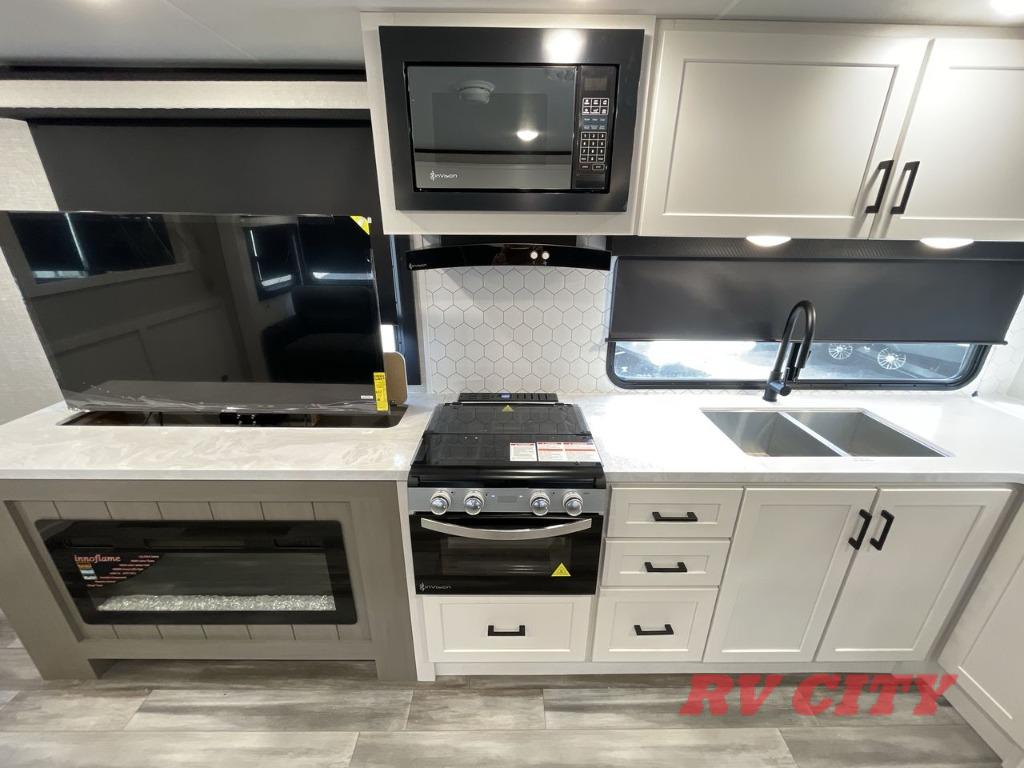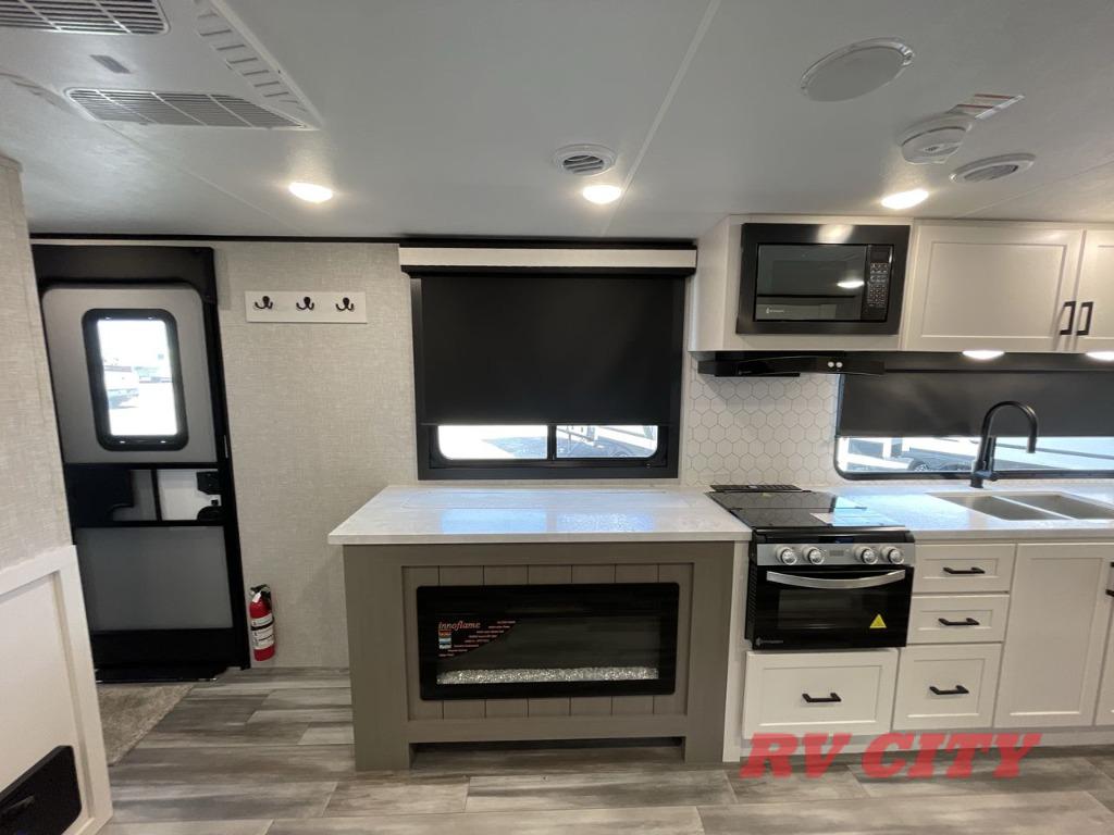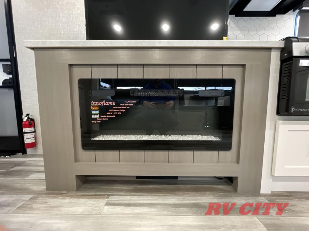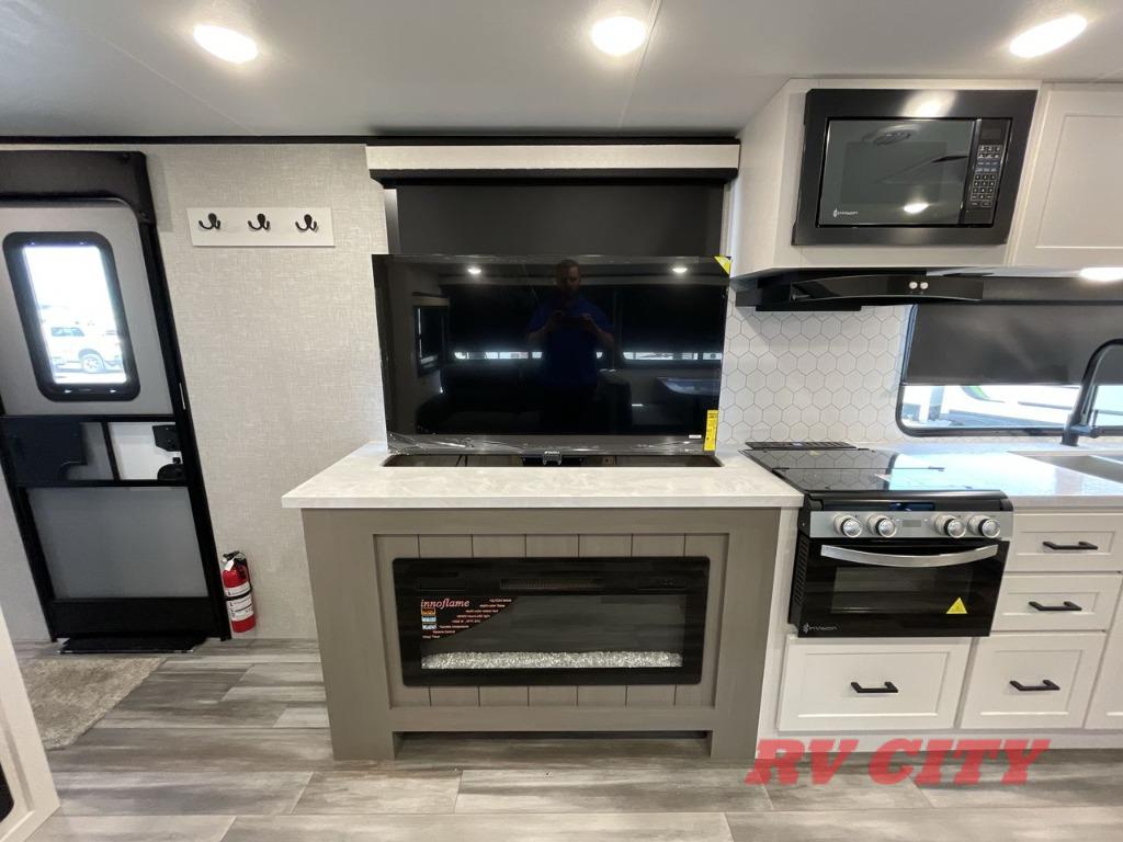 Experience the ultimate in RV living with our luxurious travel trailer, featuring a spacious rear kitchen perfect for meal prep. The pantry and fridge provide ample grocery storage, and the overhead cabinets add extra space for cookware and dishes. Plus, the microwave makes cooking and reheating meals a breeze, and the dinette is a great spot to enjoy meals or play games with family and friends. In the nice living room, you will find a trifold sofa, a perfect place to relax and unwind, and an entertainment center with a fireplace adding warmth and ambiance to the space. The full bathroom is beautifully appointed and provides all the essentials for a comfortable stay. Furthermore, the front bedroom is a serene retreat, featuring a spacious queen bed, dresser, wardrobe, and nightstands beside the bed for ultimate convenience. This travel trailer also features washer and dryer prep, making it easy to hook up to laundry facilities on the go, and with an outside kitchen, you can cook up a storm while enjoying the fresh air and scenery.