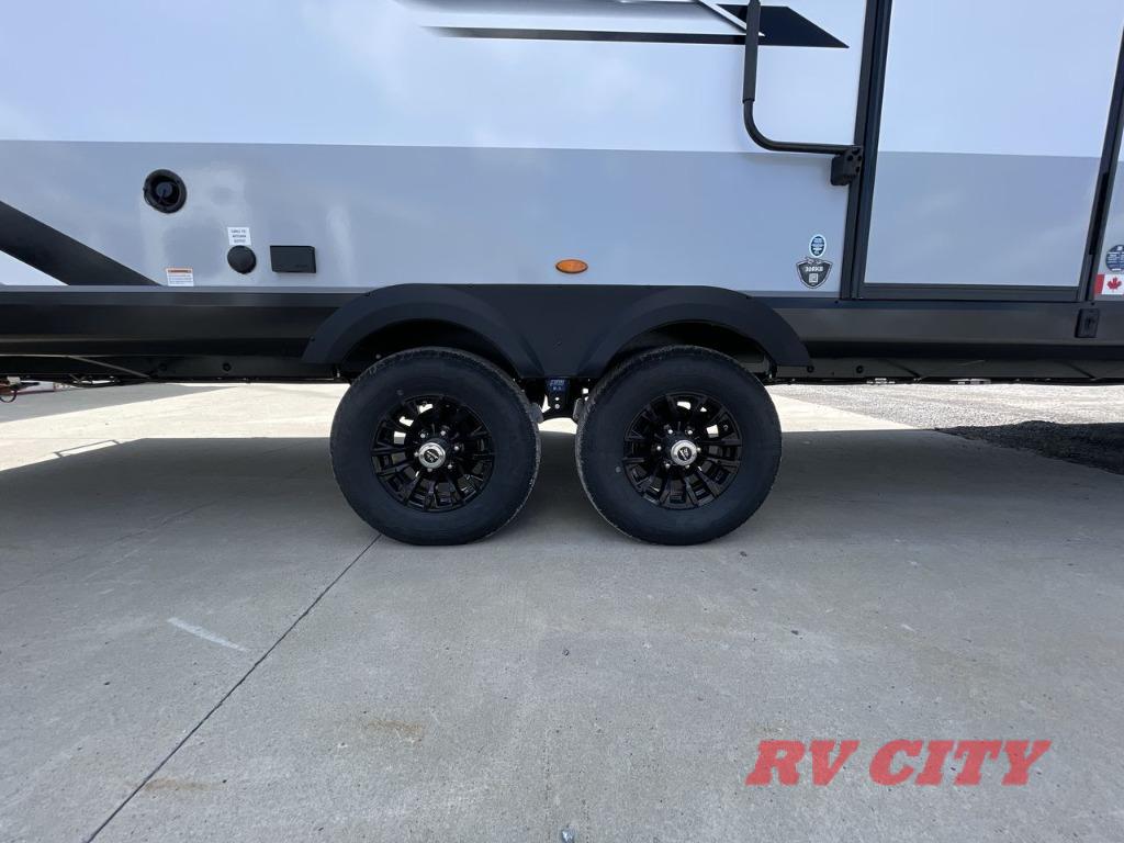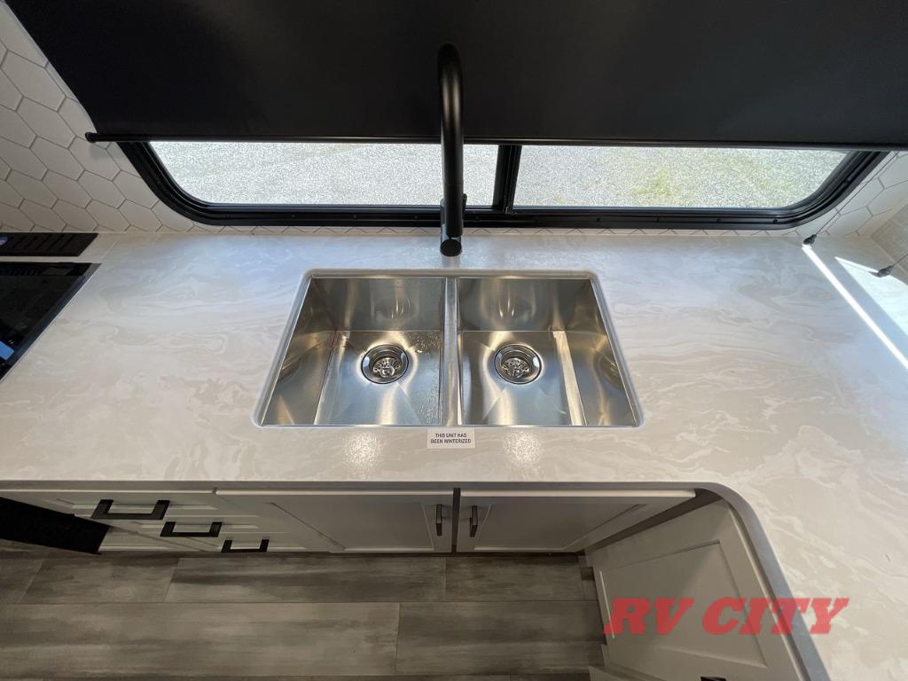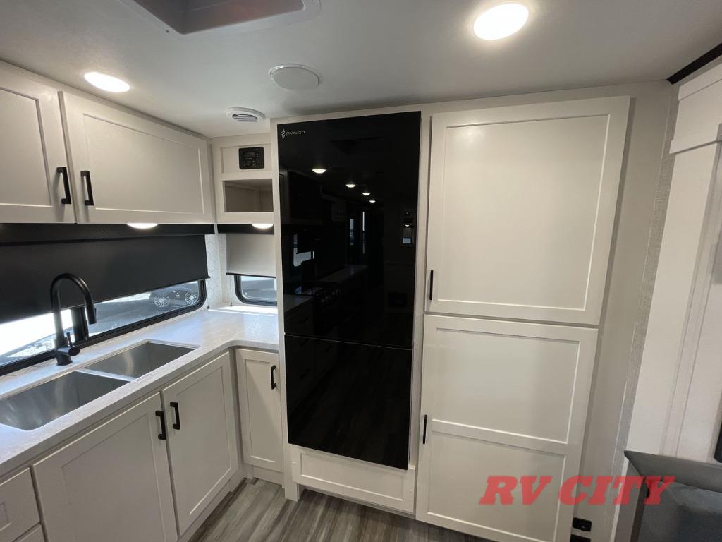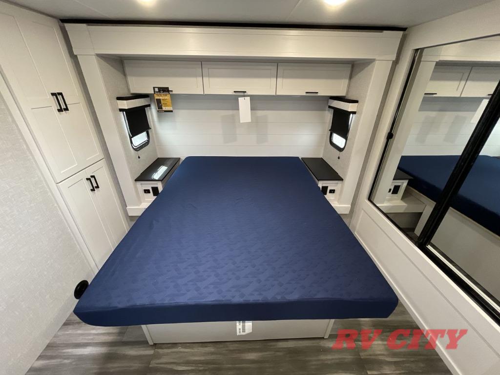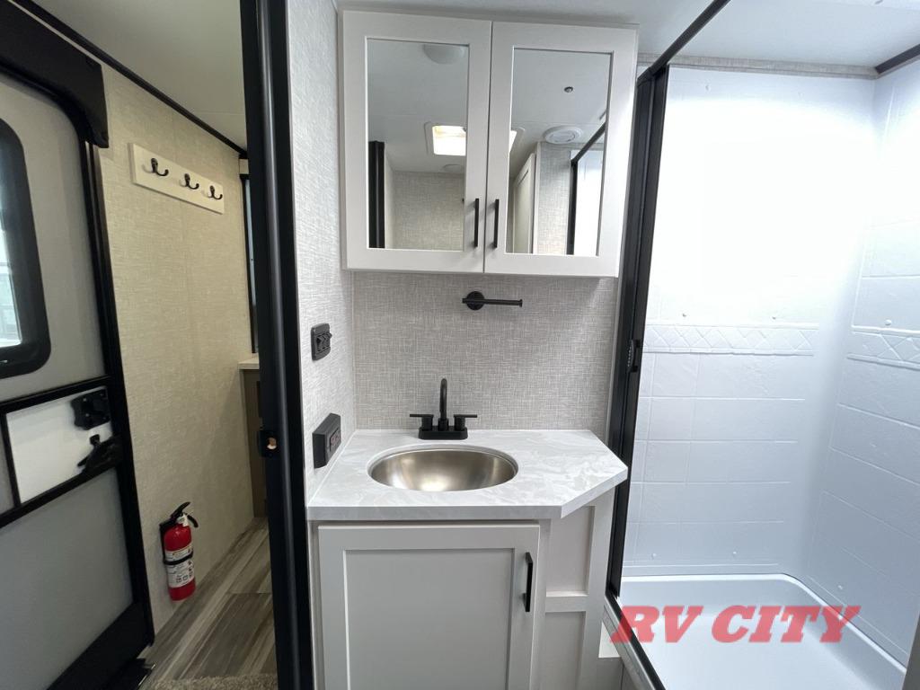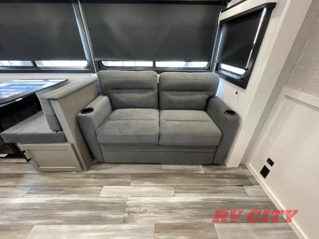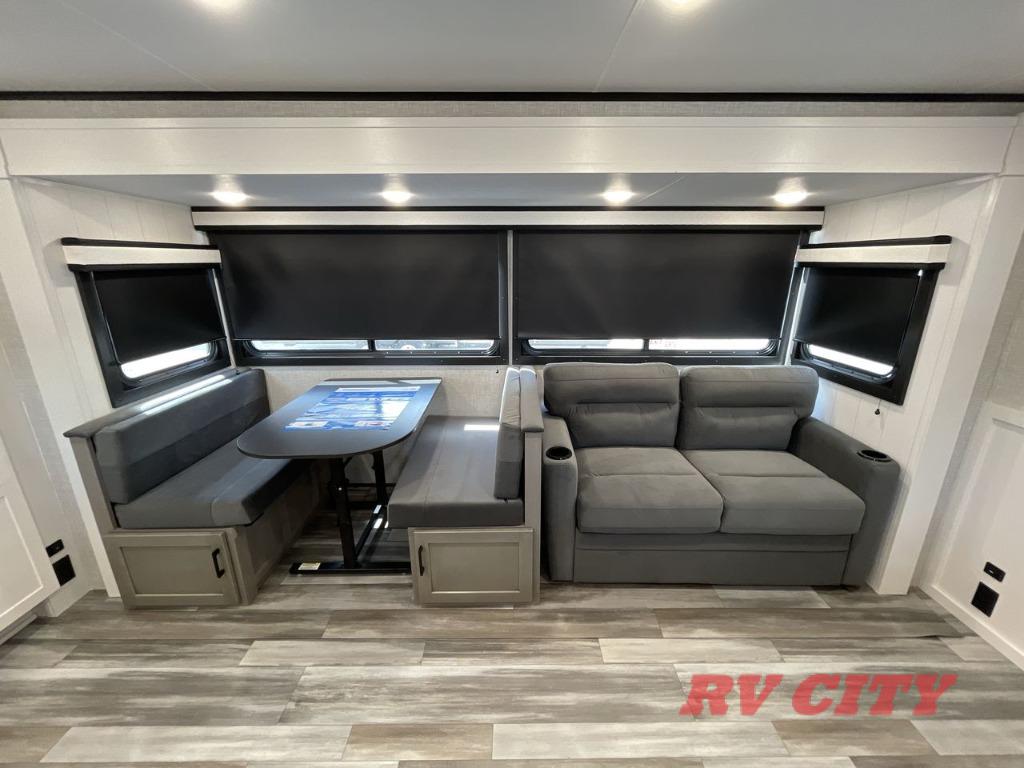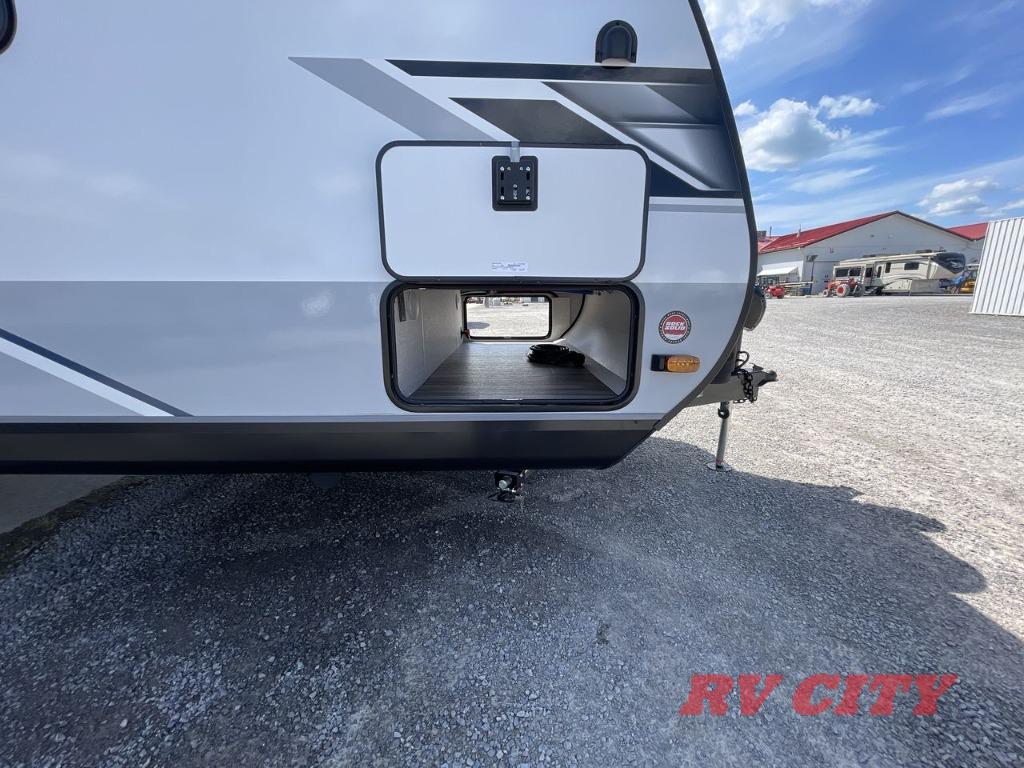 Experience the ultimate in RV living with our luxurious travel trailer, featuring a spacious rear kitchen perfect for meal prep. The pantry and fridge provide ample grocery storage, and the overhead cabinets add extra space for cookware and dishes. Plus, the microwave makes cooking and reheating meals a breeze, and the dinette is a great spot to enjoy meals or play games with family and friends. In the nice living room, you will find a trifold sofa, a perfect place to relax and unwind, and an entertainment center with a fireplace adding warmth and ambiance to the space. The full bathroom is beautifully appointed and provides all the essentials for a comfortable stay. Furthermore, the front bedroom is a serene retreat, featuring a spacious queen bed, dresser, wardrobe, and nightstands beside the bed for ultimate convenience. This travel trailer also features washer and dryer prep, making it easy to hook up to laundry facilities on the go, and with an outside kitchen, you can cook up a storm while enjoying the fresh air and scenery.
