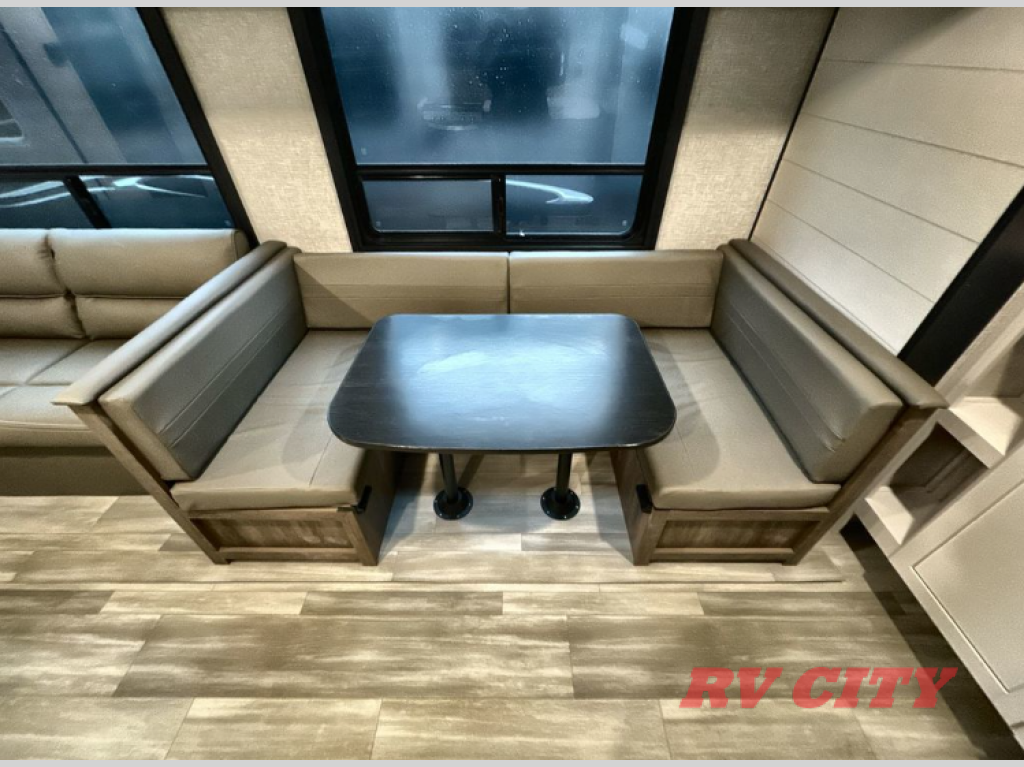 You and the whole family will have a fun time camping in this dual axle trailer! The kiddos can sleep on the corner set of double-size bunk beds and you will have your own privacy with the front private bedroom which has wardrobes on either side of the bed. You could even transform the U-shaped dinette and jack-knife sofa slide into extra sleeping spaces for a couple of cousins to tag along too. Everyone will stay squeaky clean with the shower in the rear corner bathroom, and there is even an exterior sprayer hose to wash the mud off your feet before entering inside the trailer. The chef will enjoy cooking delicious meals indoors, but love being able to breathe in some fresh air while cooking at the outside kitchen. When mother nature rains on your parade, simply head inside and enjoy the entertainment center!