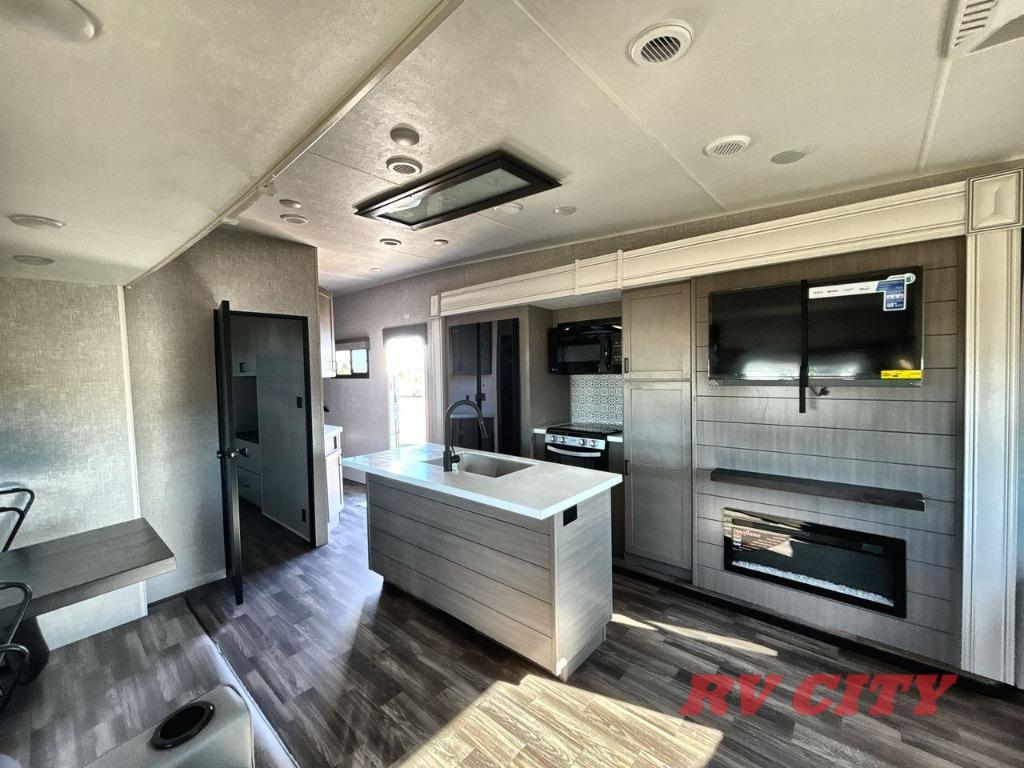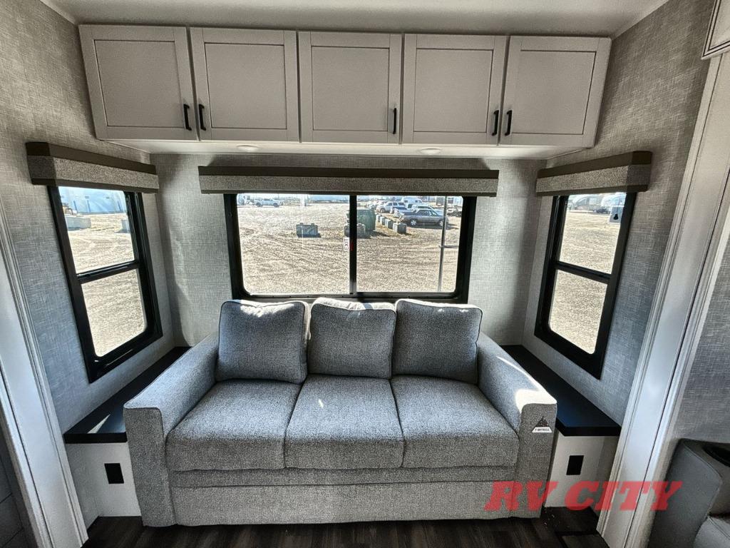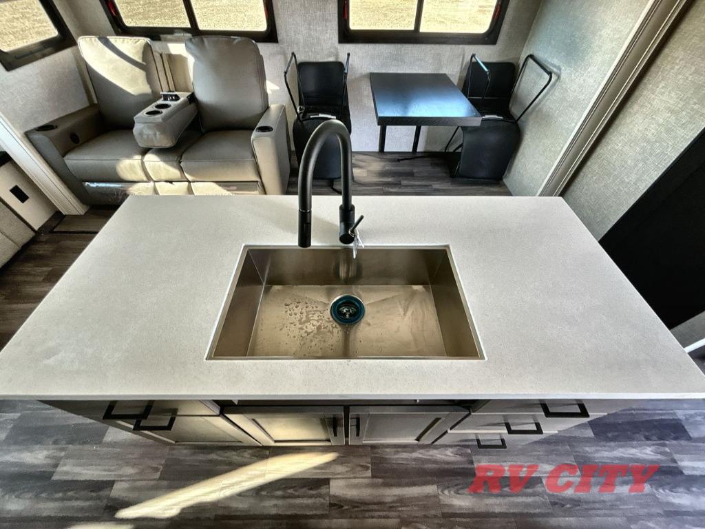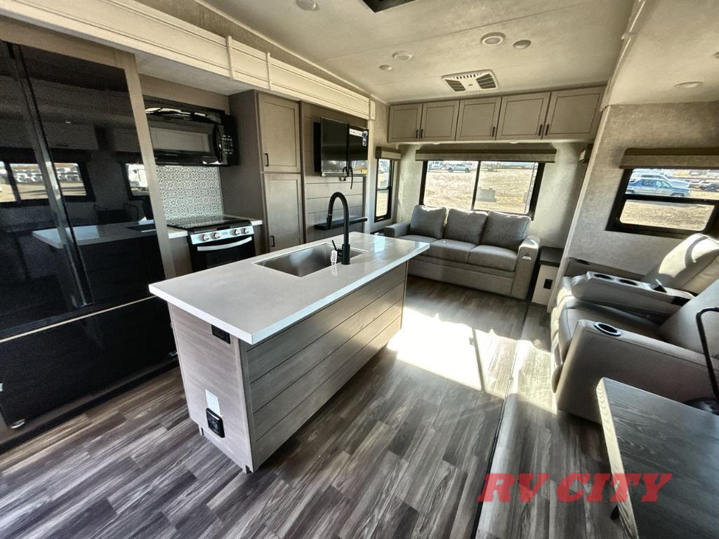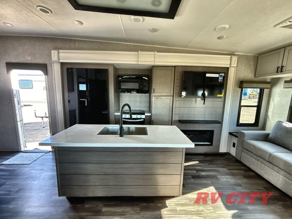 There's plenty of room for lots of guests in this fifth wheel! A private front bedroom and rear living room are standard, plus this model also adds a mid-bunk room with a booth dinette and flip-up bunk above, overhead storage, plus an entertainment center. Everyone will want to gather in the living room with its theater seats, Smart HDTV, and tri-fold sofa, plus the dining table and chairs are right there if you should need extra seating. A center island is the centerpiece of the inside kitchen, while the outside kitchen provides a nice option if you'd like to cook outdoors.