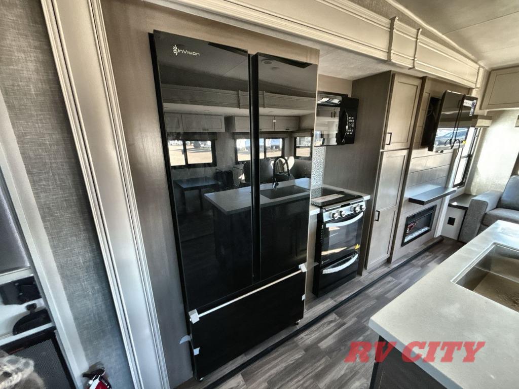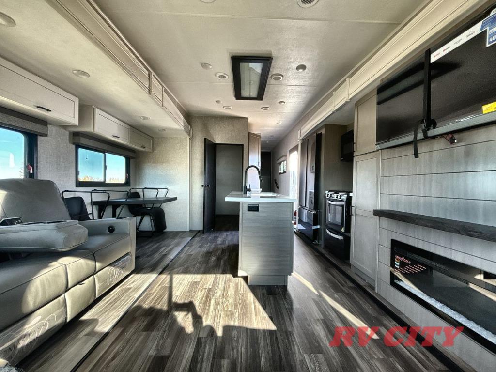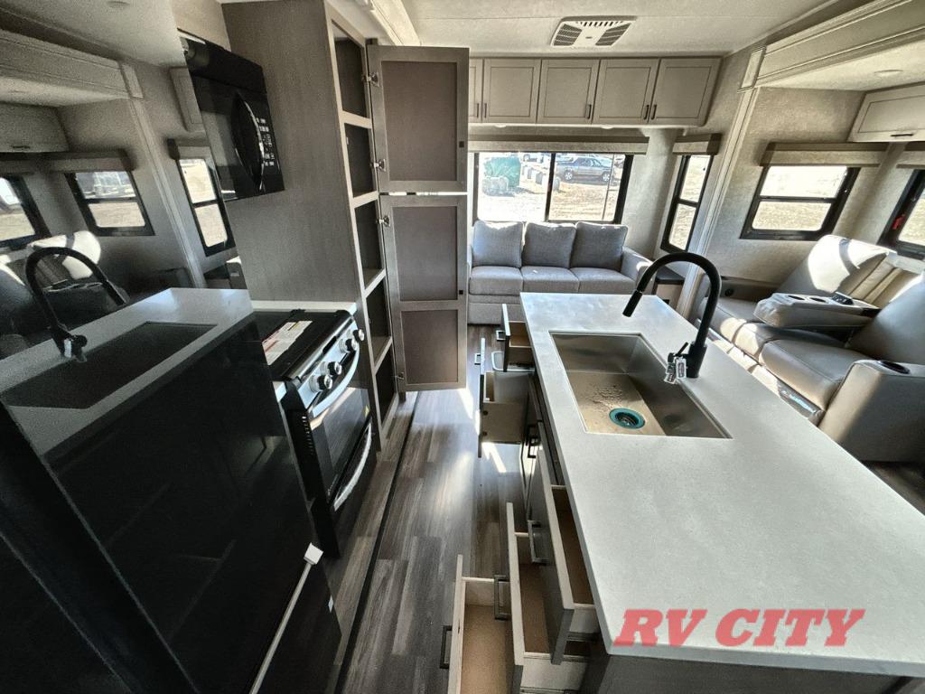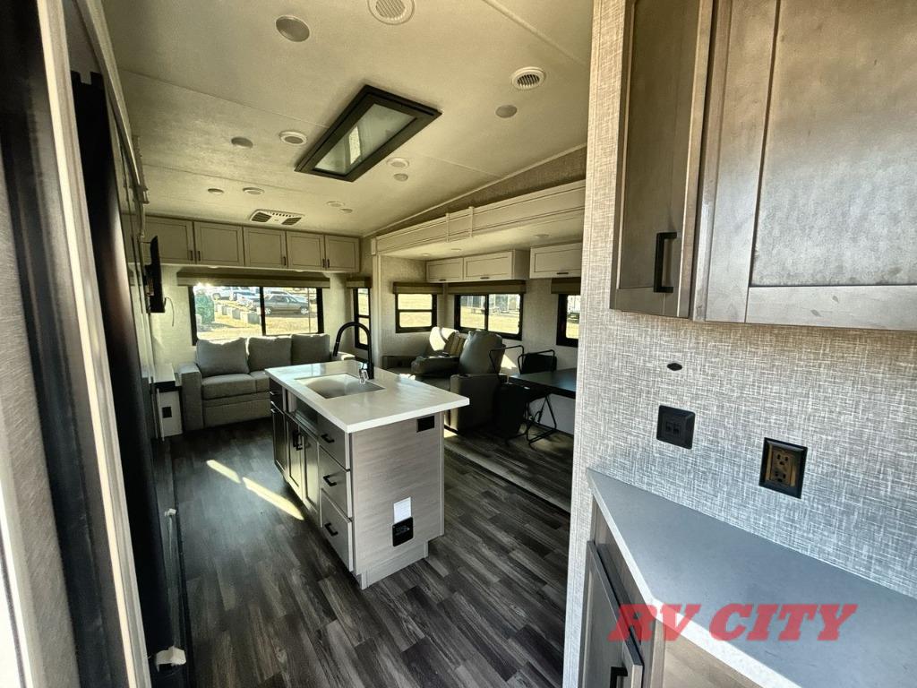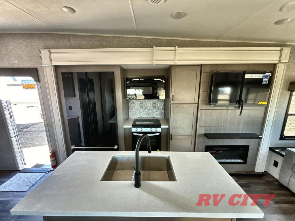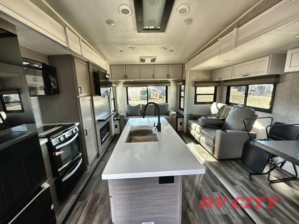 There's plenty of room for lots of guests in this fifth wheel! A private front bedroom and rear living room are standard, plus this model also adds a mid-bunk room with a booth dinette and flip-up bunk above, overhead storage, plus an entertainment center. Everyone will want to gather in the living room with its theater seats, Smart HDTV, and tri-fold sofa, plus the dining table and chairs are right there if you should need extra seating. A center island is the centerpiece of the inside kitchen, while the outside kitchen provides a nice option if you'd like to cook outdoors.