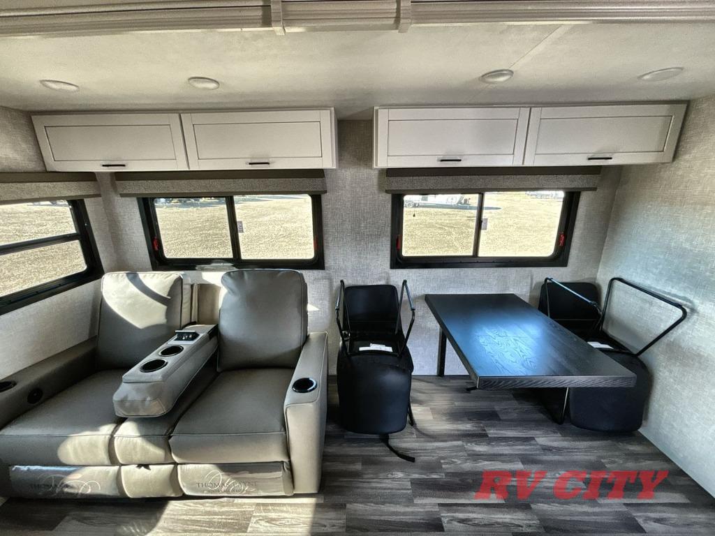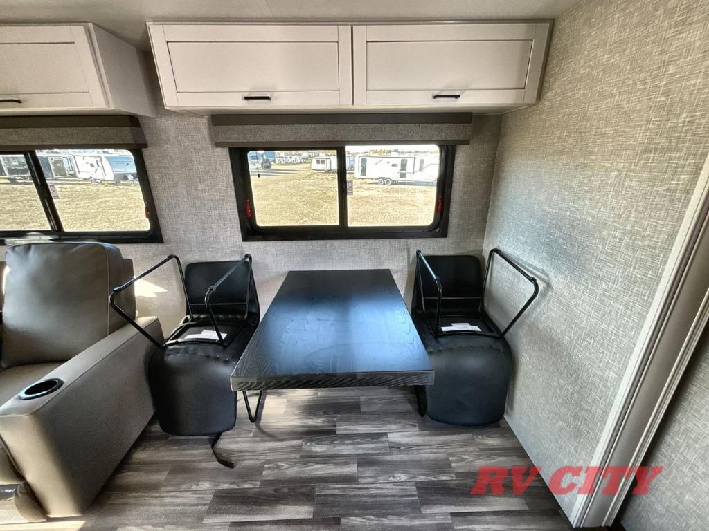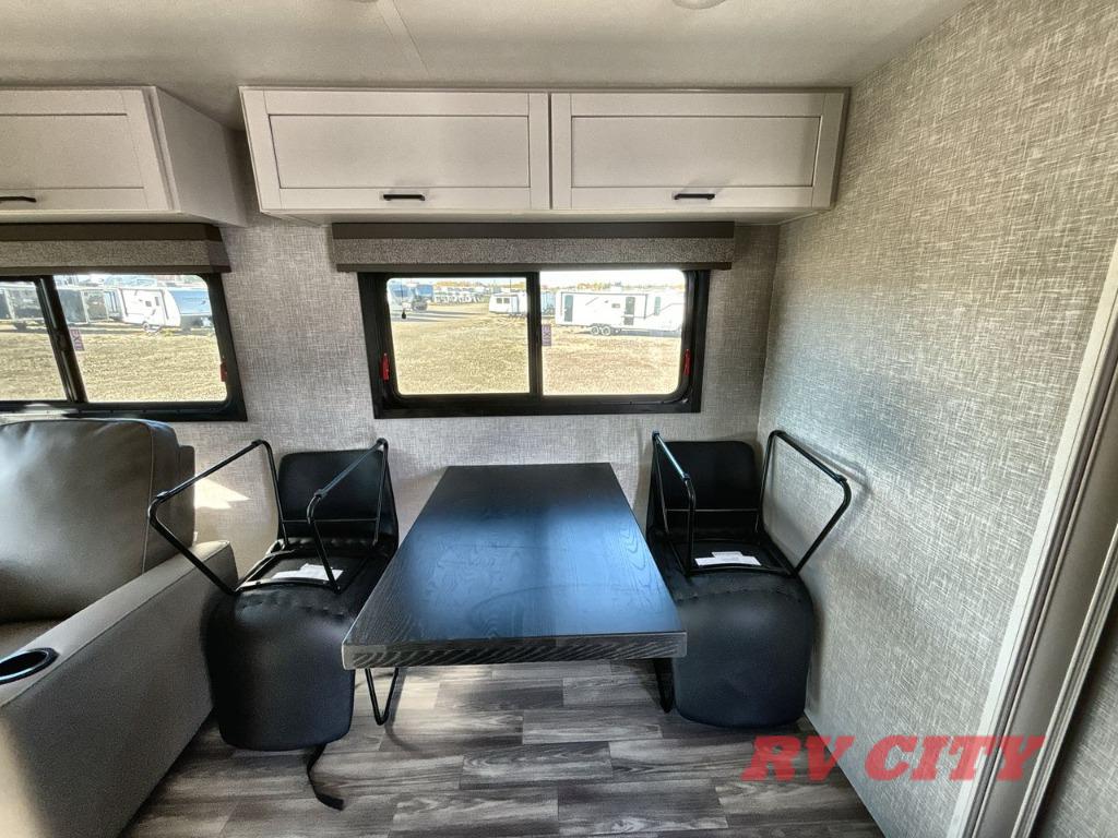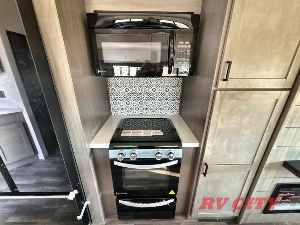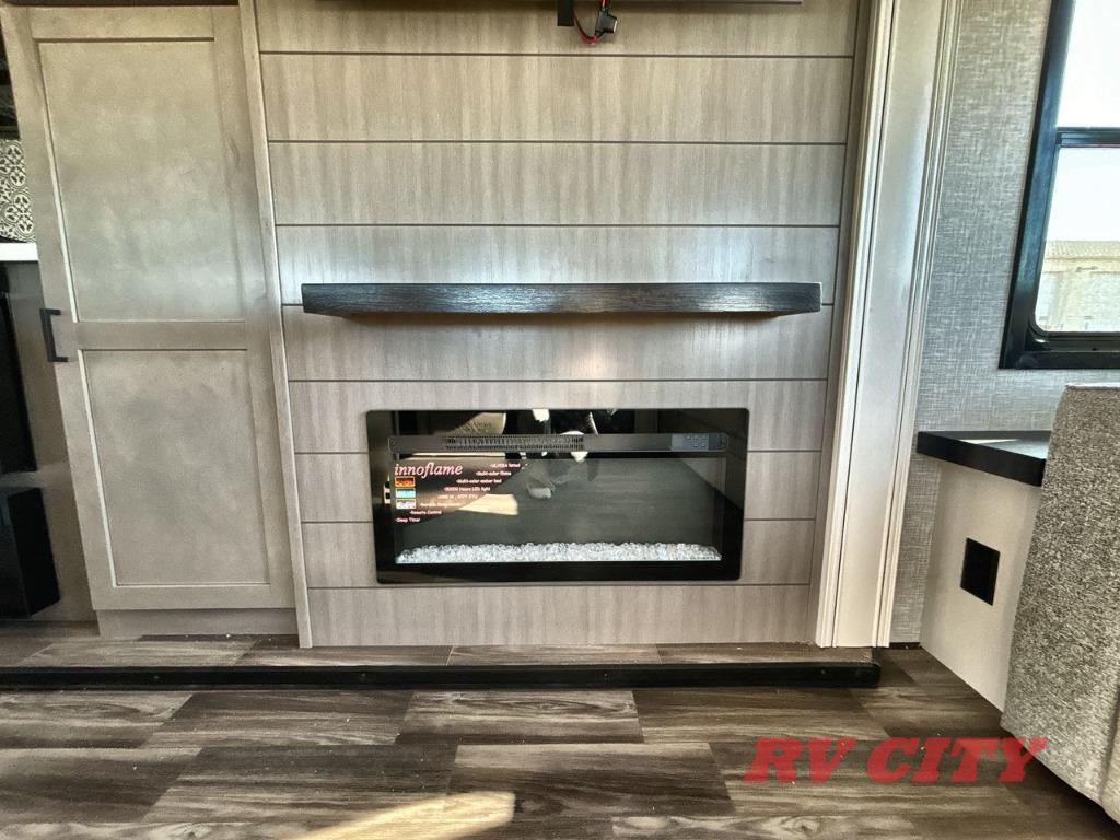There's plenty of room for lots of guests in this fifth wheel! A private front bedroom and rear living room are standard, plus this model also adds a mid-bunk room with a booth dinette and flip-up bunk above, overhead storage, plus an entertainment center. Everyone will want to gather in the living room with its theater seats, Smart HDTV, and tri-fold sofa, plus the dining table and chairs are right there if you should need extra seating. A center island is the centerpiece of the inside kitchen, while the outside kitchen provides a nice option if you'd like to cook outdoors.