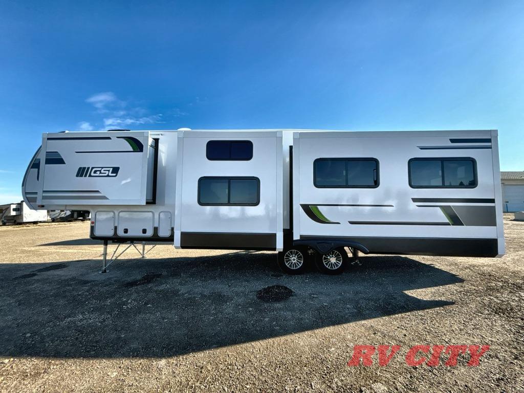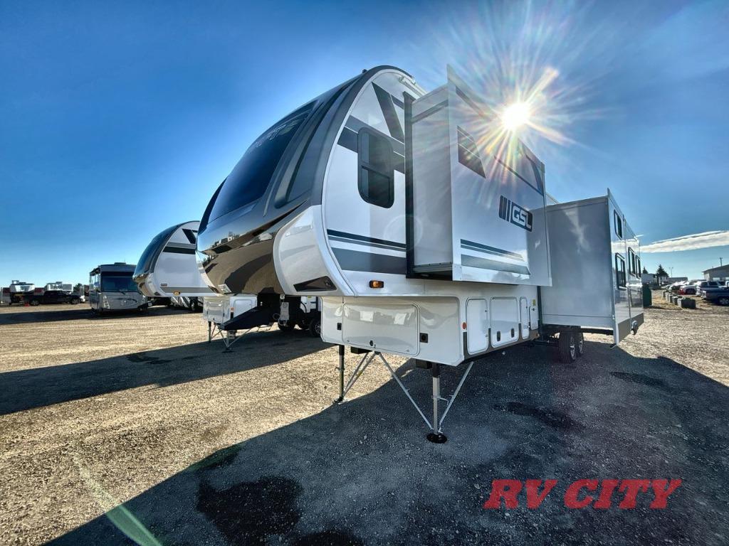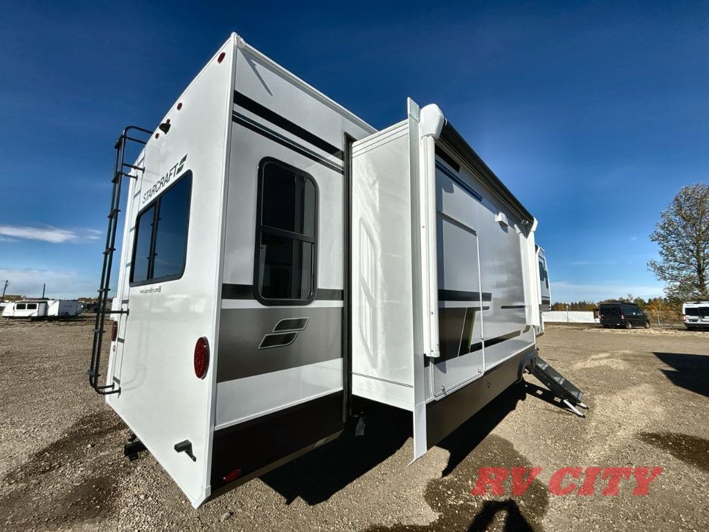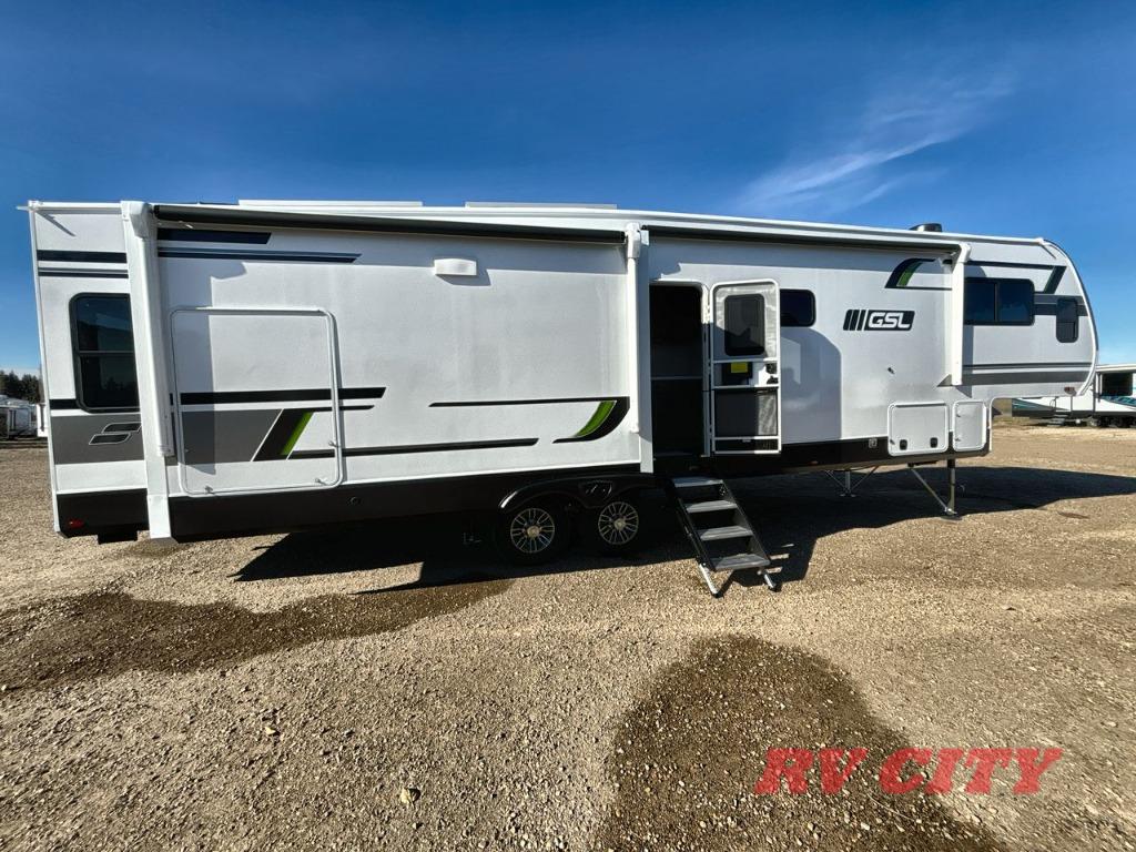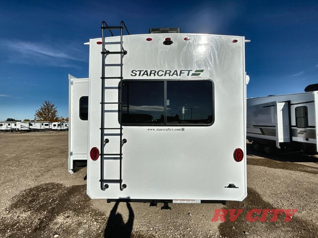 Each Starcraft GSL fifth wheel is built on a 100" wide body frame, and each includes TuffShell vacuumed bonded and laminated construction, reinforced with heavy duty fiberglass, and welded aluminum frame. The mandatory Four Seasons package which adds a heated and enclosed underbelly, high performance furnace, and double insulated baggage doors so you can camp even in colder weather. Inside you'll appreciate modern design elements like the residential vinyl flooring, roller blackout night shades, stainless steel appliances, and solid-surface kitchen countertops. High-tech features are also prominent like the TravelLink Bluetooth control of slides, lighting, awnings, cooling and more, plus the Xtend Solar I Package with a 200 watt solar panel and a 30 amp controller will let you go off-grid when the adventure calls for it!