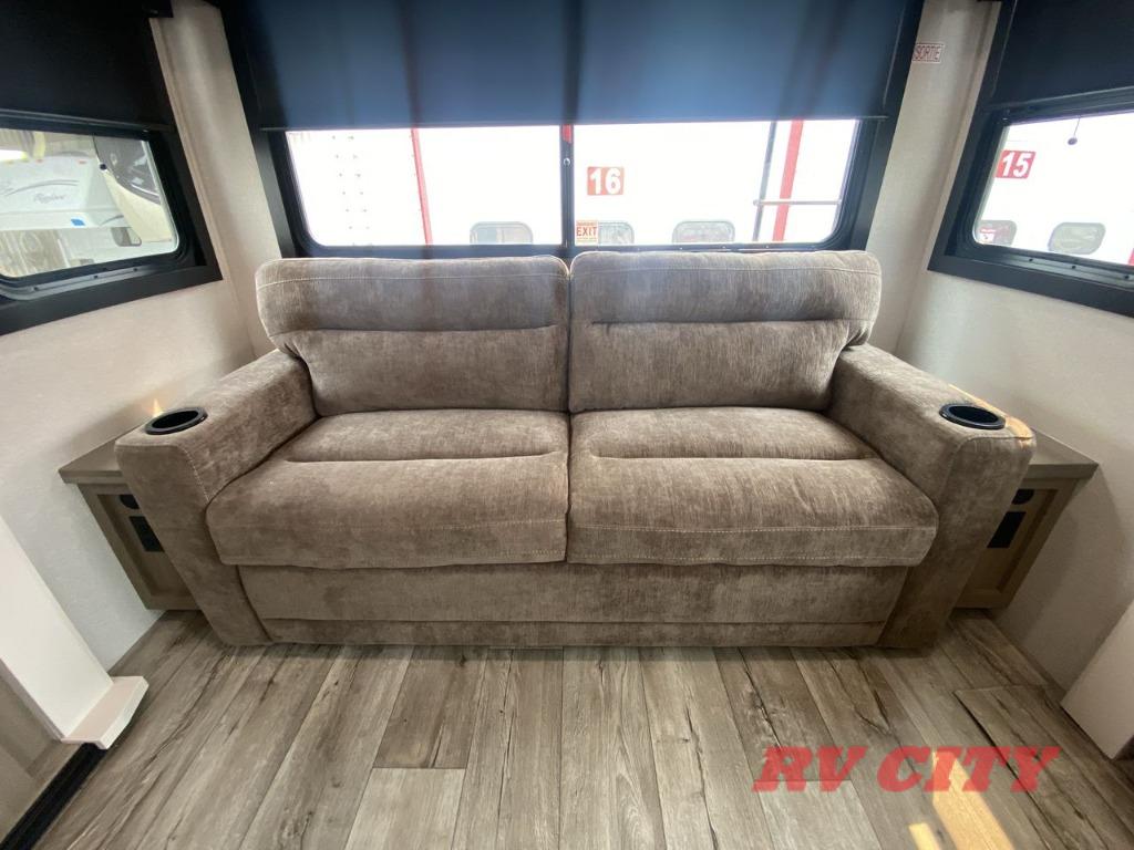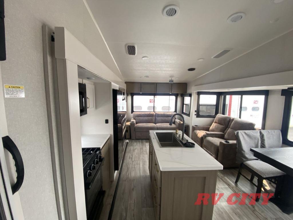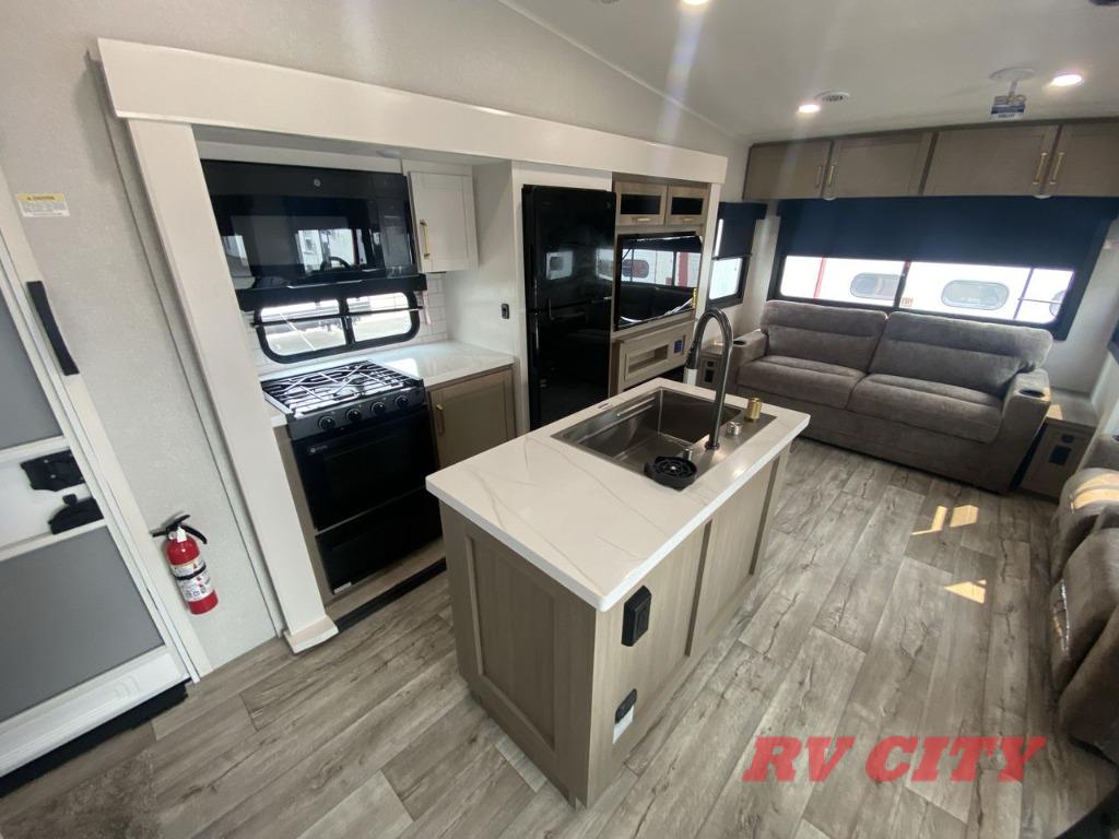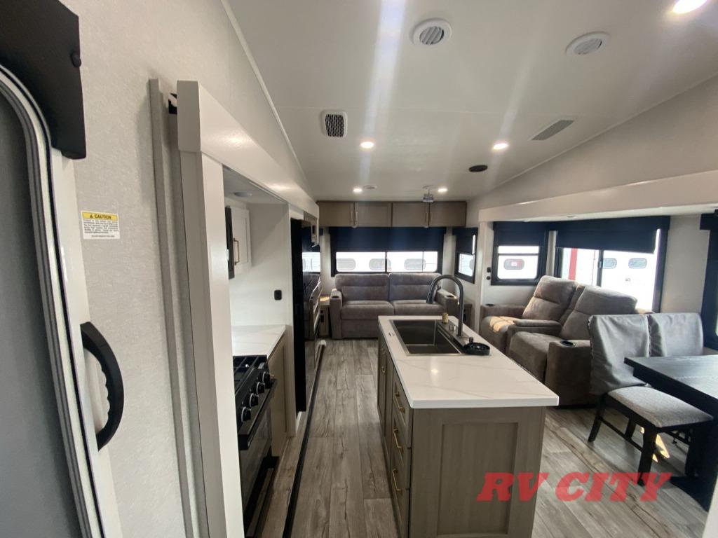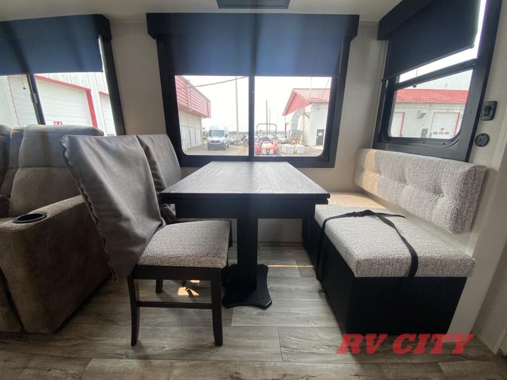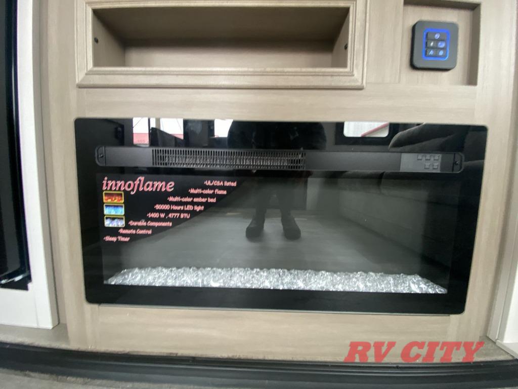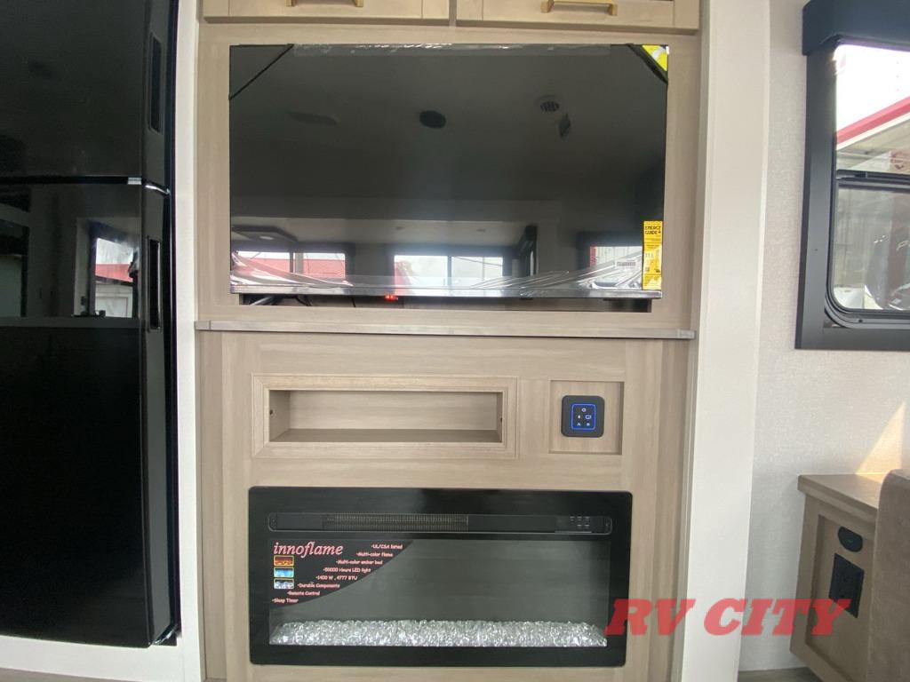Pack your bags and head off on adventure in this spacious fifth wheel for four! The dual opposing slides in the kitchen and main living area will give your crew more space to relax. Speaking of relaxing, there is a theater seat across from the fireplace and TV plus a tri-fold sofa to make it a movie night. The free-standing table includes two chairs on one side and a bench on the other, and the kitchen island is sure to be appreciated by the chef of your group. There is also a spacious kitchen pantry and an outside kitchen if they'd rather cook outdoors. The front master bedroom includes an Olympic queen bed, dual wardrobes plus a third wardrobe within the bedroom slide out, and TV prep if you want the option to watch a show in bed!