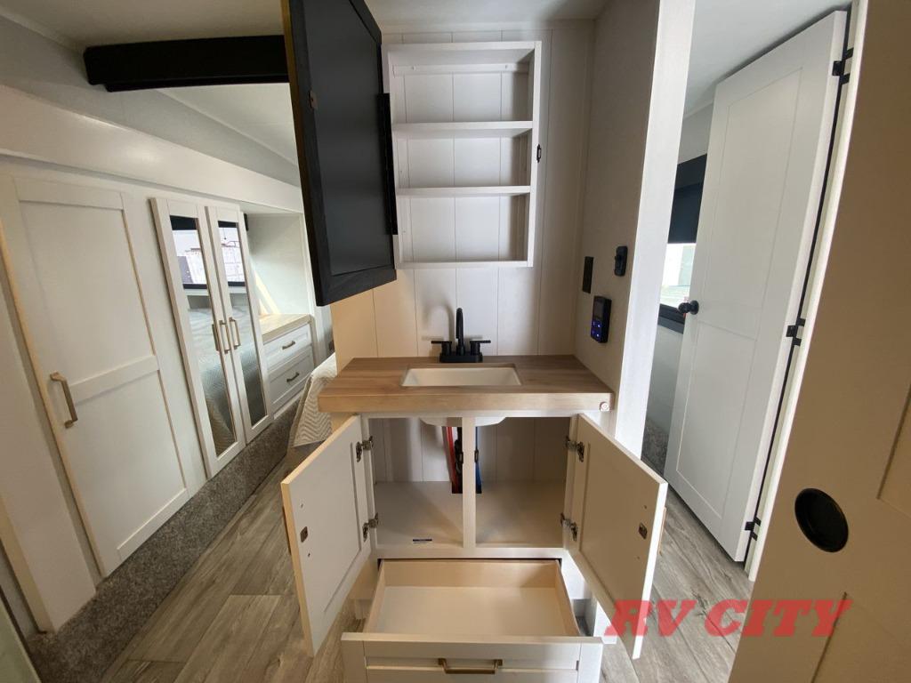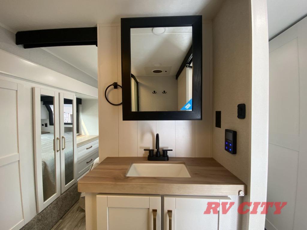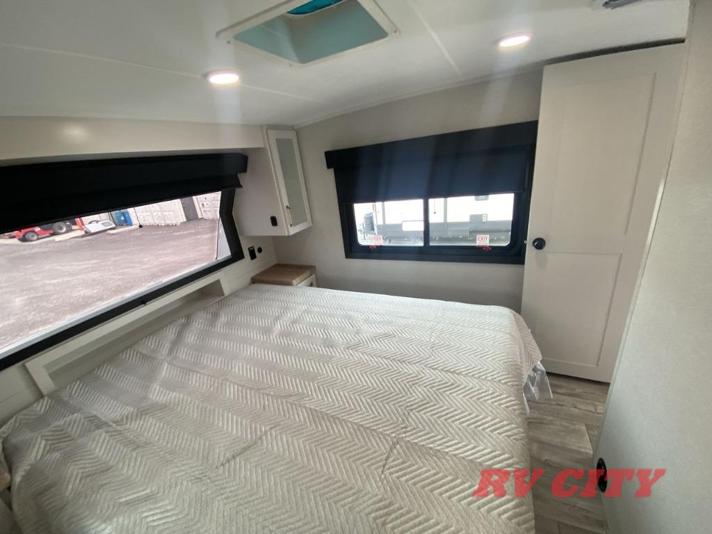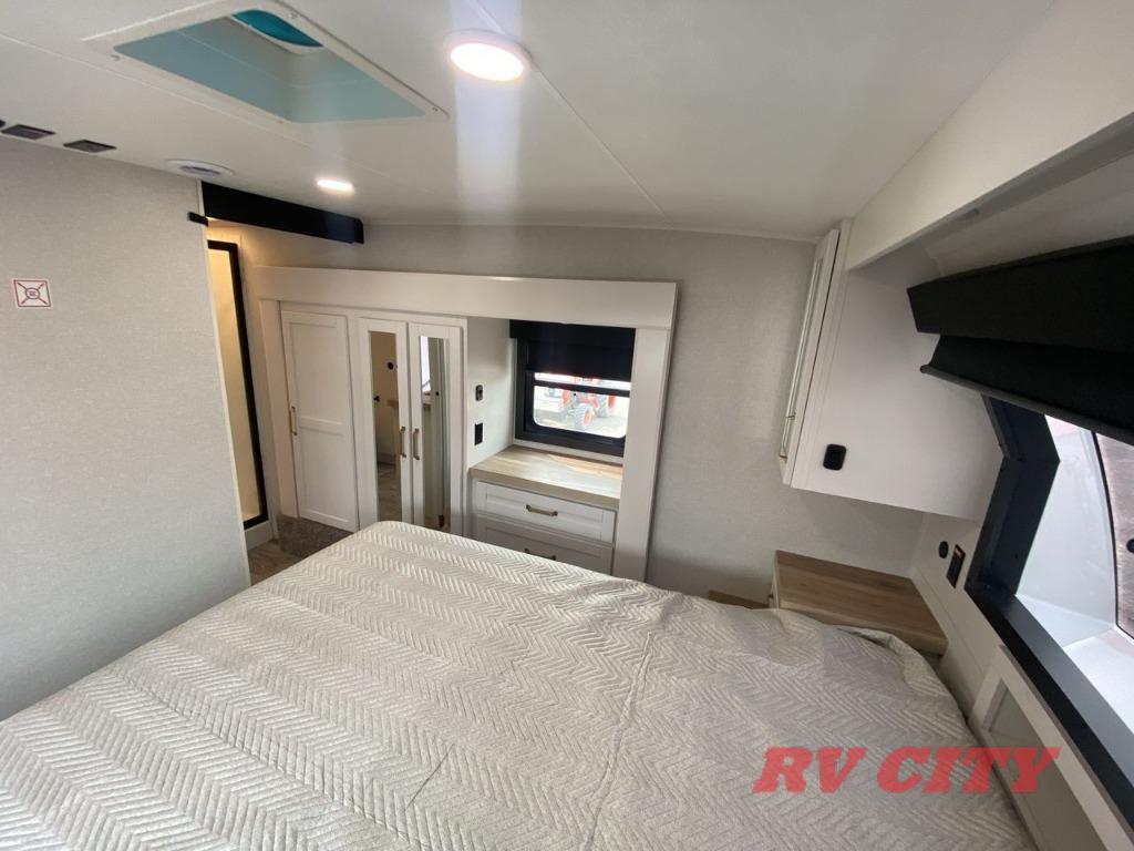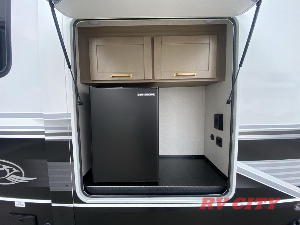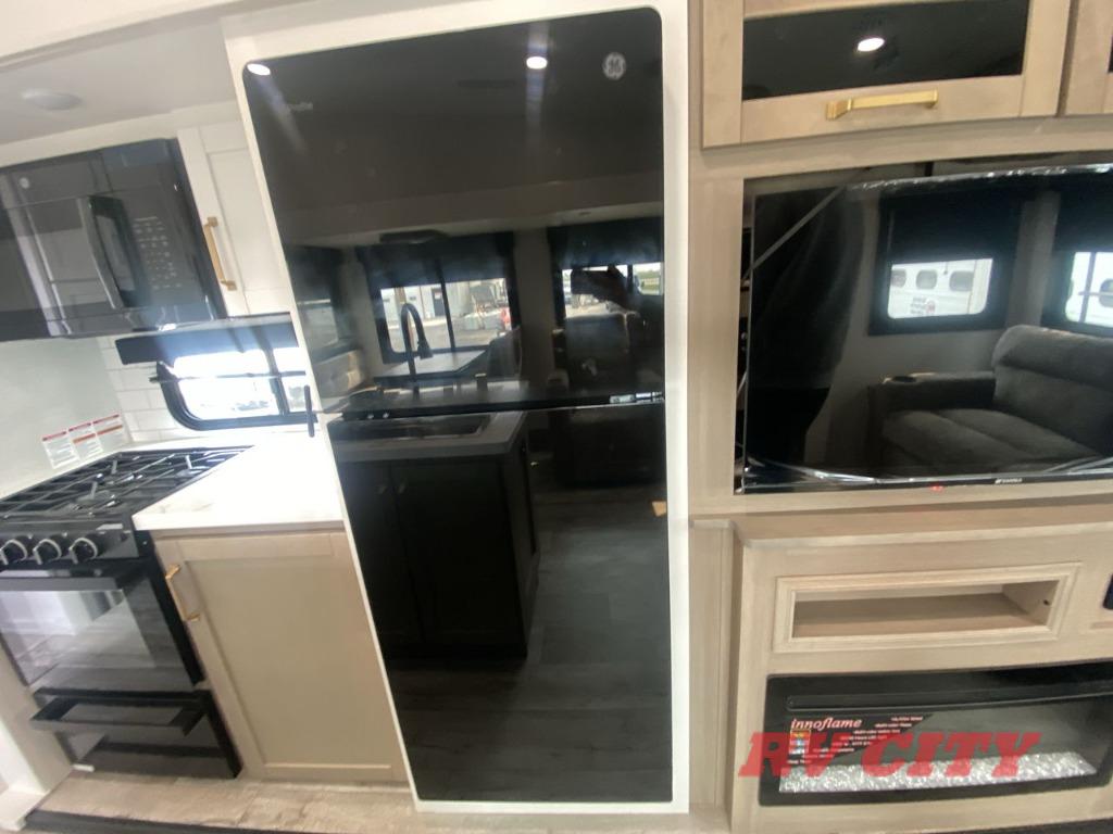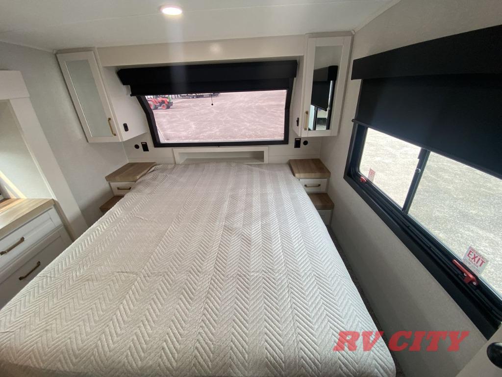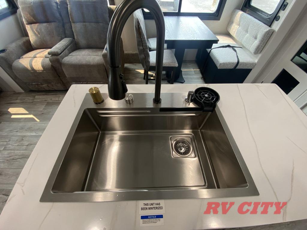 Pack your bags and head off on adventure in this spacious fifth wheel for four! The dual opposing slides in the kitchen and main living area will give your crew more space to relax. Speaking of relaxing, there is a theater seat across from the fireplace and TV plus a tri-fold sofa to make it a movie night. The free-standing table includes two chairs on one side and a bench on the other, and the kitchen island is sure to be appreciated by the chef of your group. There is also a spacious kitchen pantry and an outside kitchen if they'd rather cook outdoors. The front master bedroom includes an Olympic queen bed, dual wardrobes plus a third wardrobe within the bedroom slide out, and TV prep if you want the option to watch a show in bed!