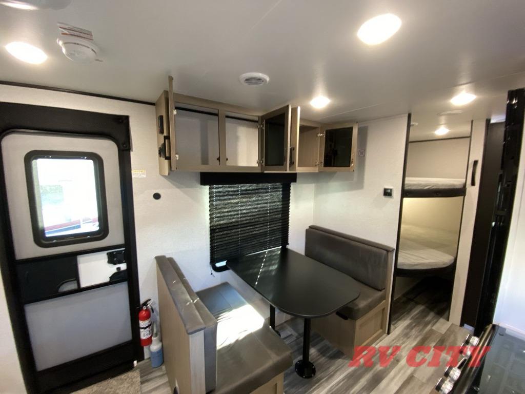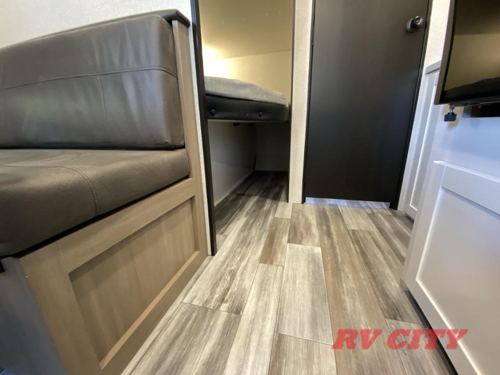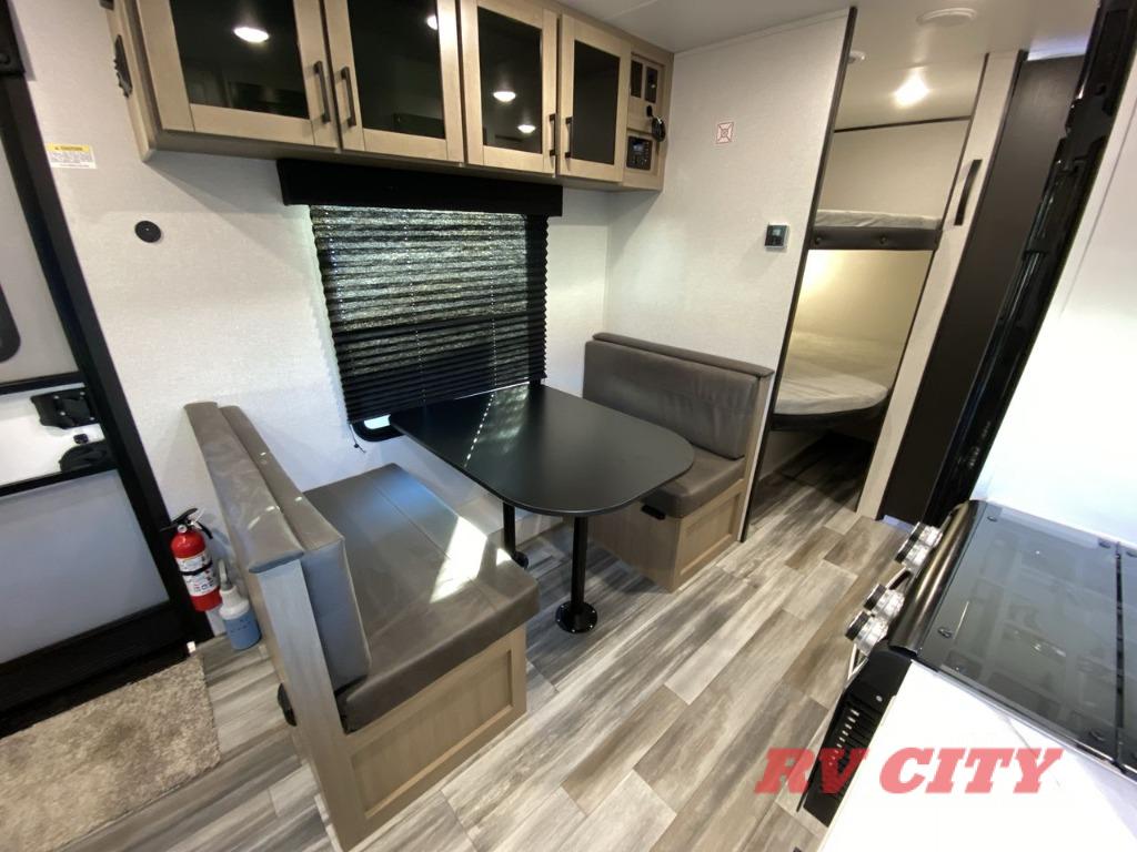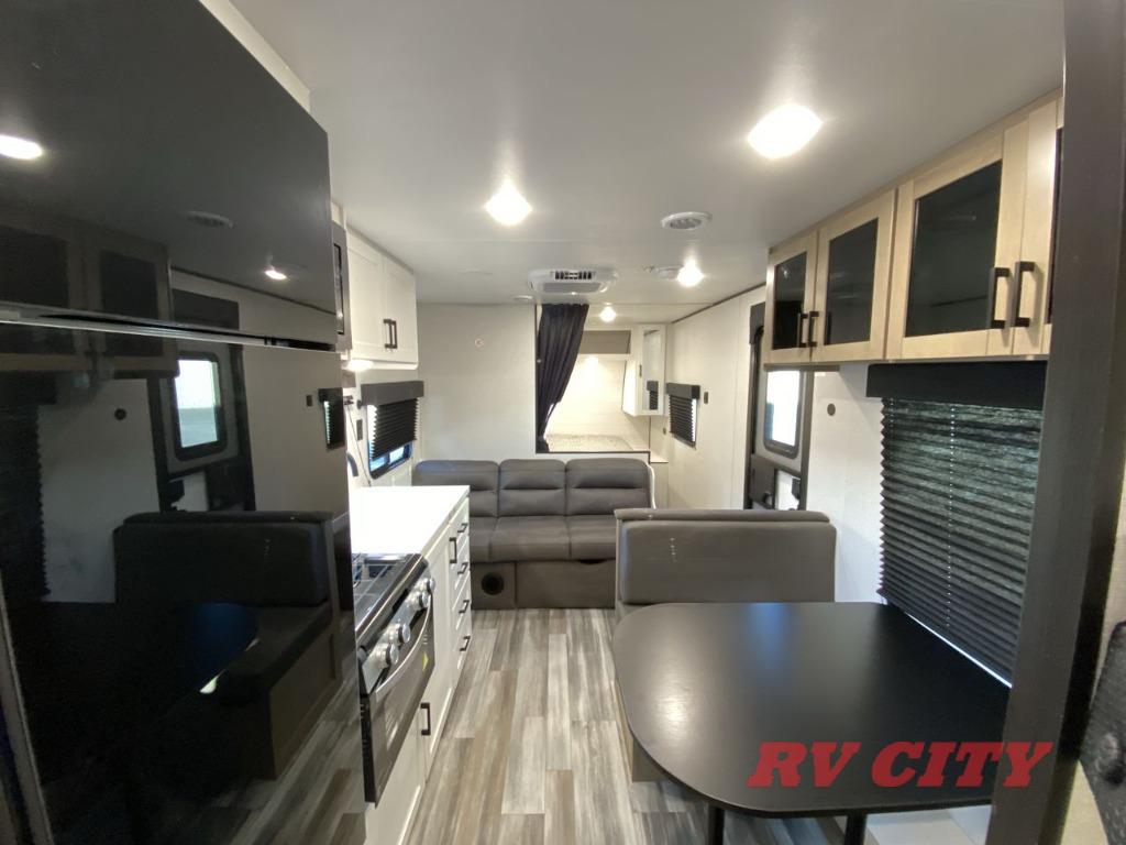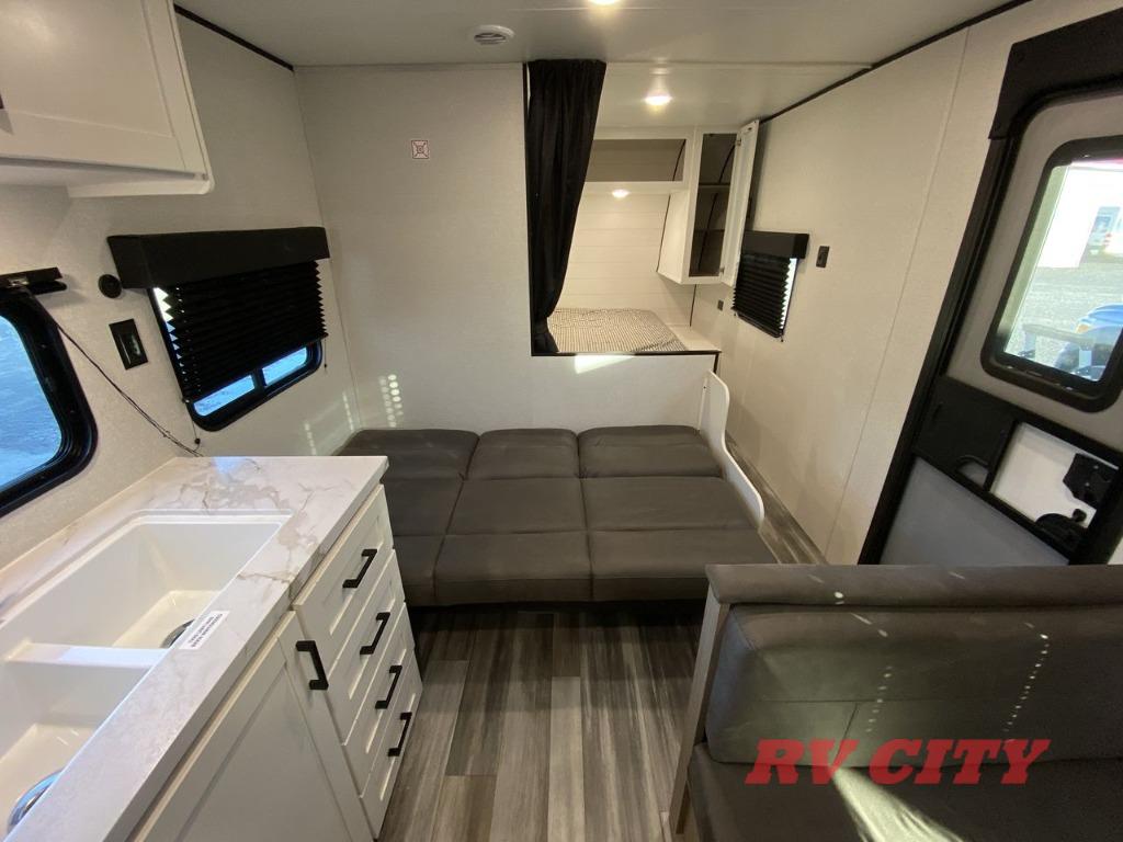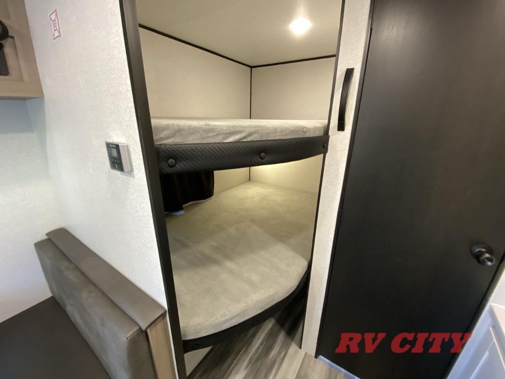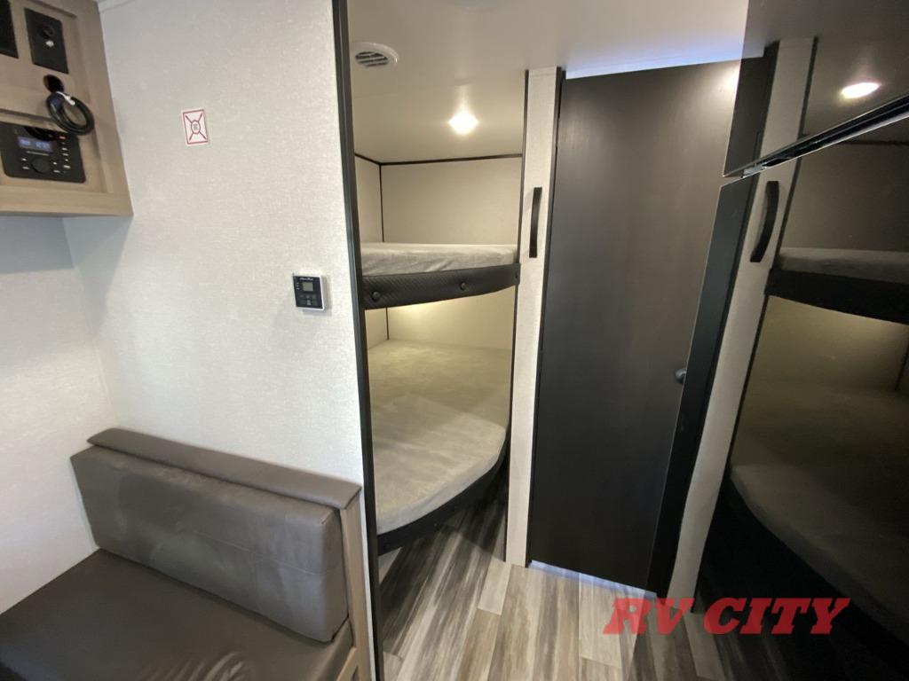 You can comfortably sleep up to eight people in this trailer thanks to the double-size bunks, the RV queen bed in the front bedroom, plus the booth dinette and jack-knife sofa in the main living area! The chef of your crew will have a three burner cooktop and microwave oven to prepare meals, and everyone can store their favorite drinks in the 8 cu. ft. 12V refrigerator. The bathroom includes a shower and a toilet, with the sink just outside of this room so others can brush their teeth if one is taking a shower before bed. The outside storage will let you bring along fishing poles and the 16' power awning with LED lights will create a nice place to gather in the evenings!