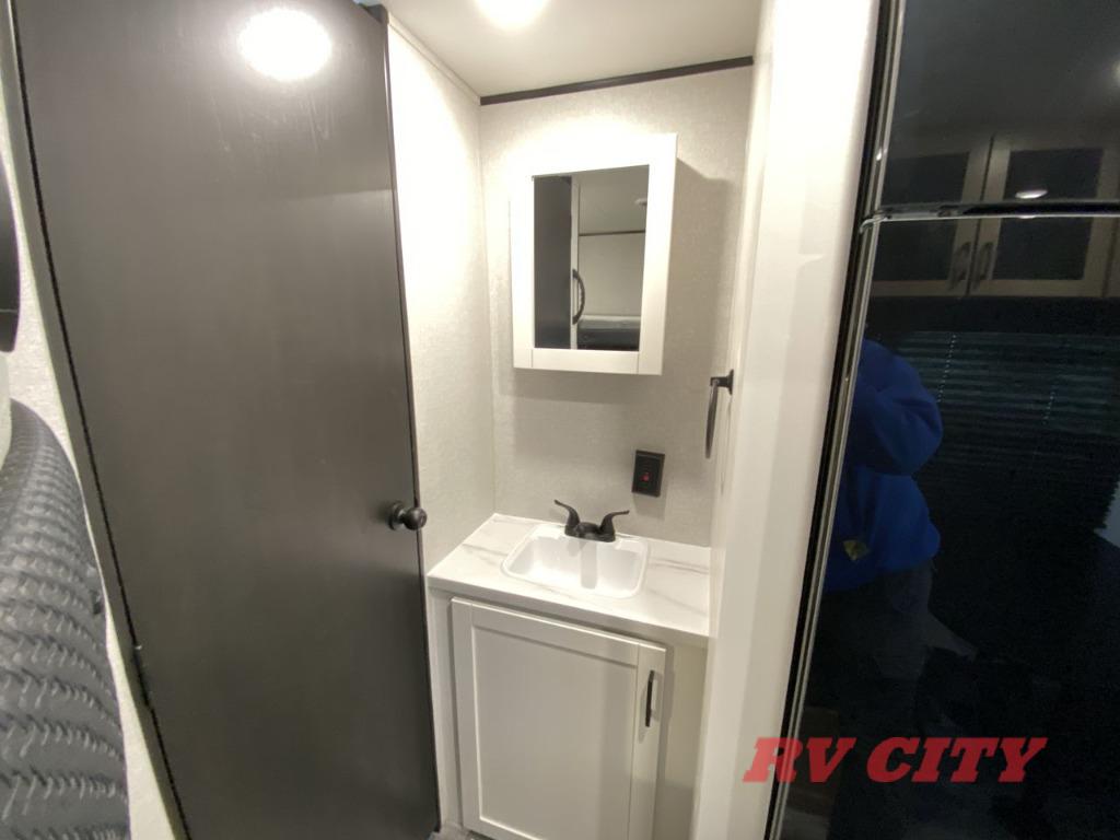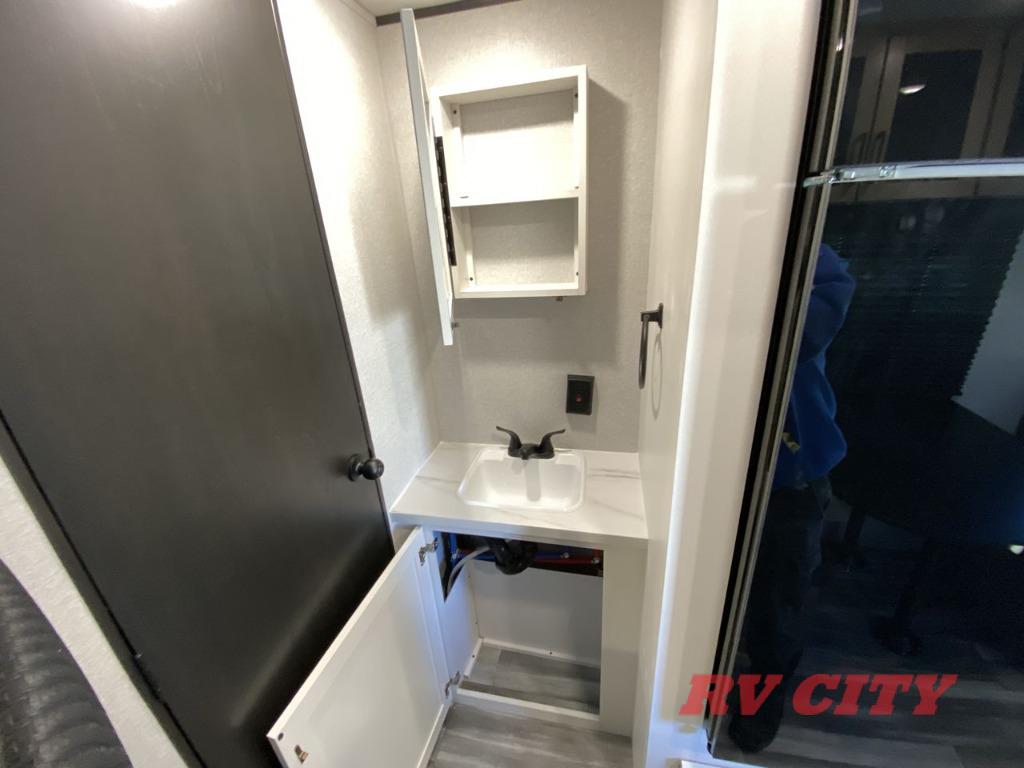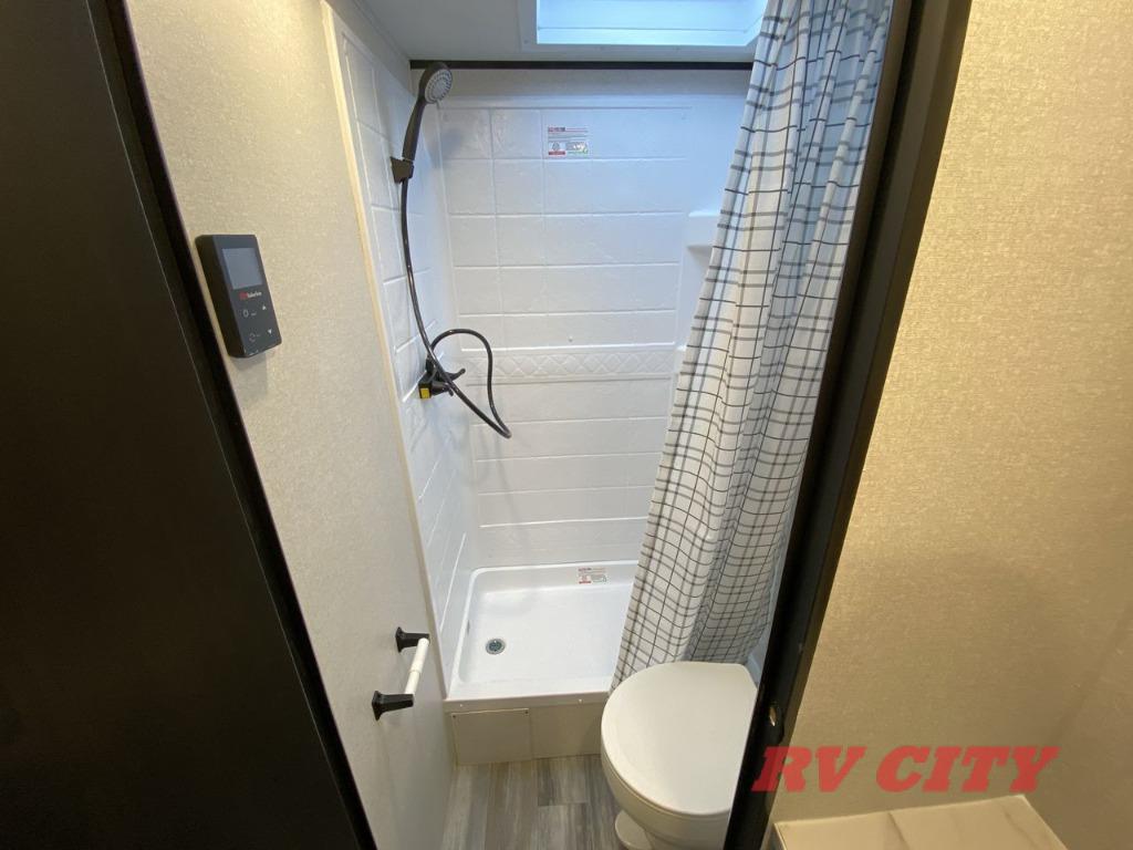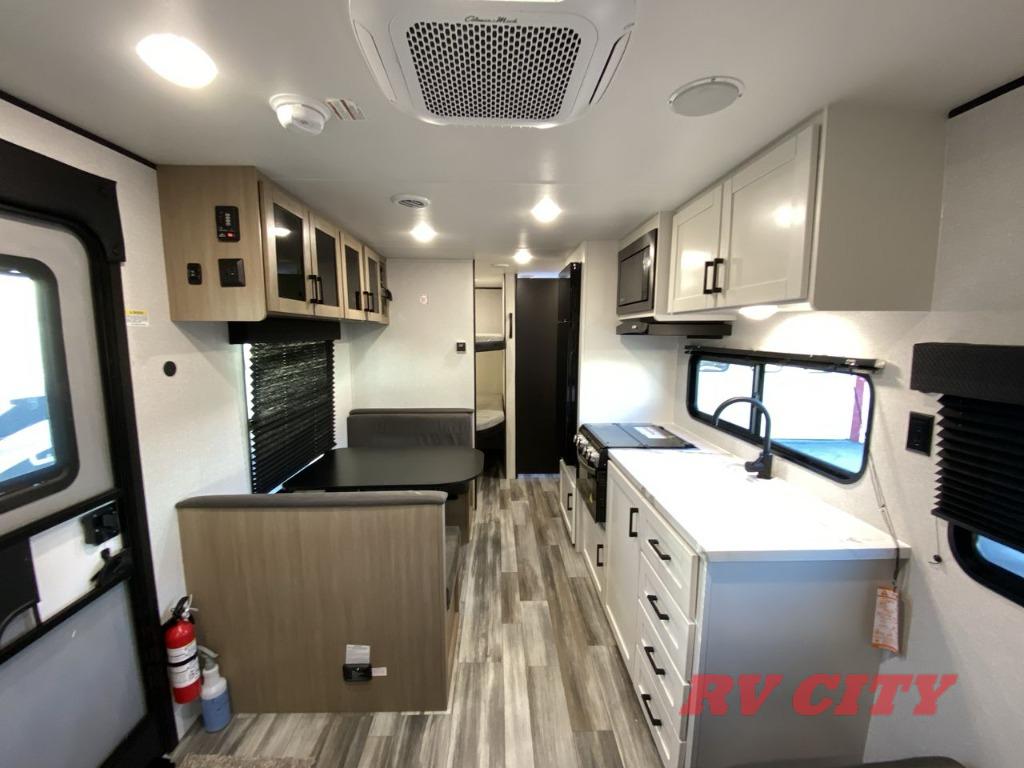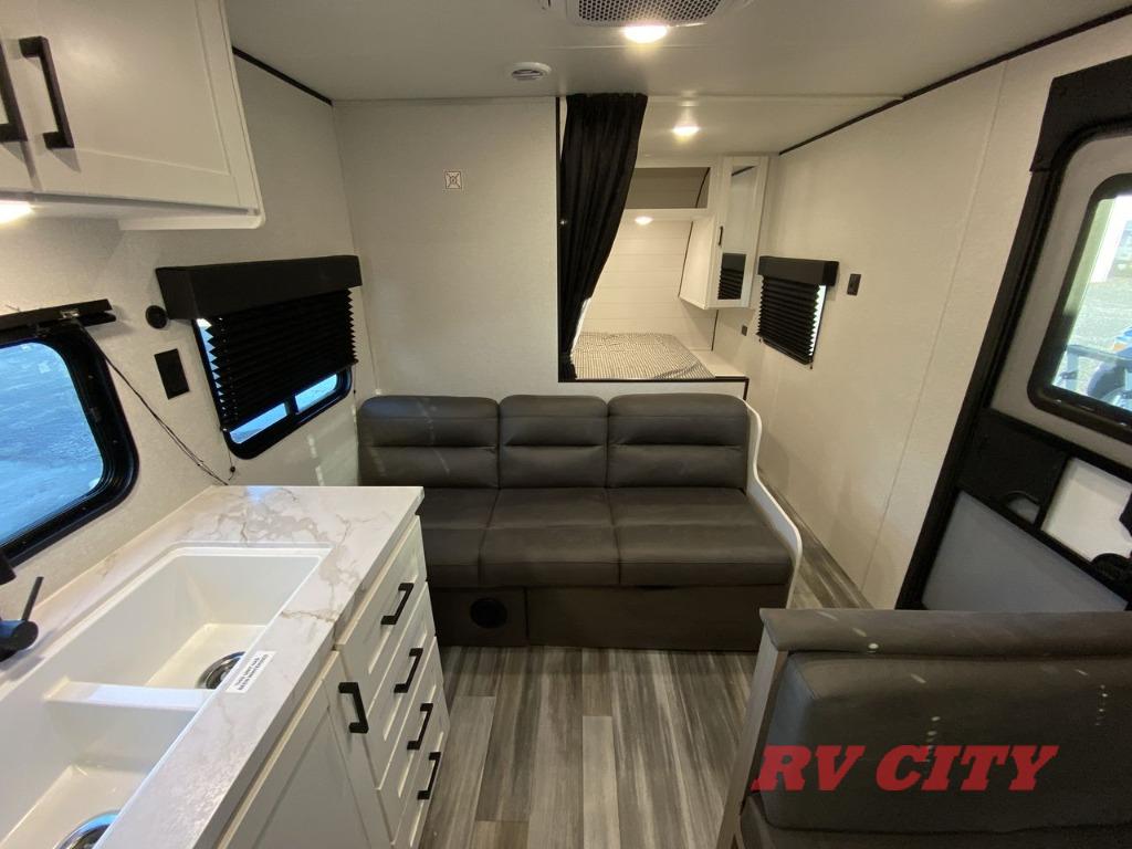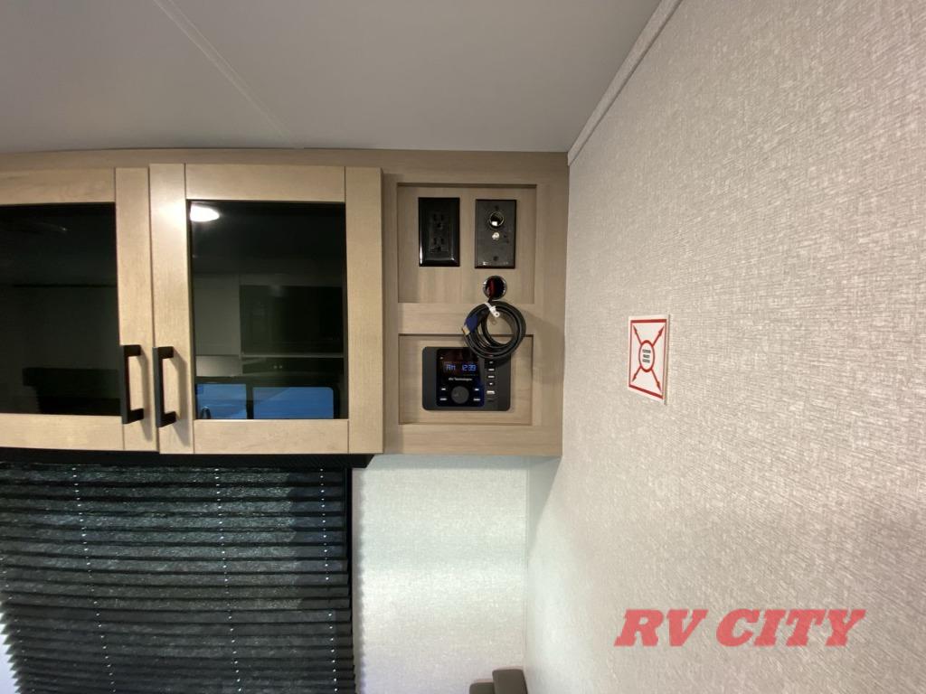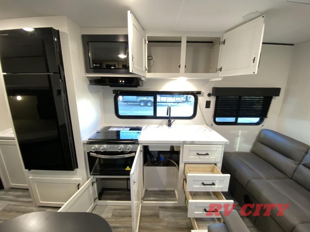 You can comfortably sleep up to eight people in this trailer thanks to the double-size bunks, the RV queen bed in the front bedroom, plus the booth dinette and jack-knife sofa in the main living area! The chef of your crew will have a three burner cooktop and microwave oven to prepare meals, and everyone can store their favorite drinks in the 8 cu. ft. 12V refrigerator. The bathroom includes a shower and a toilet, with the sink just outside of this room so others can brush their teeth if one is taking a shower before bed. The outside storage will let you bring along fishing poles and the 16' power awning with LED lights will create a nice place to gather in the evenings!
