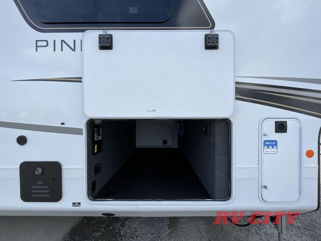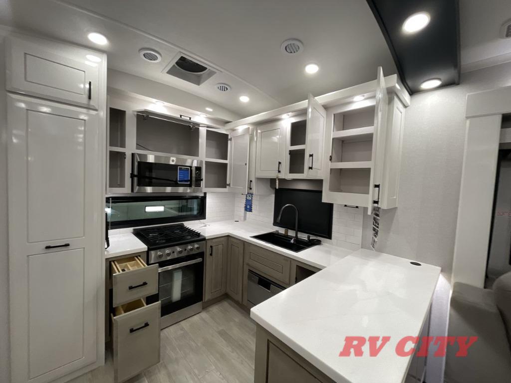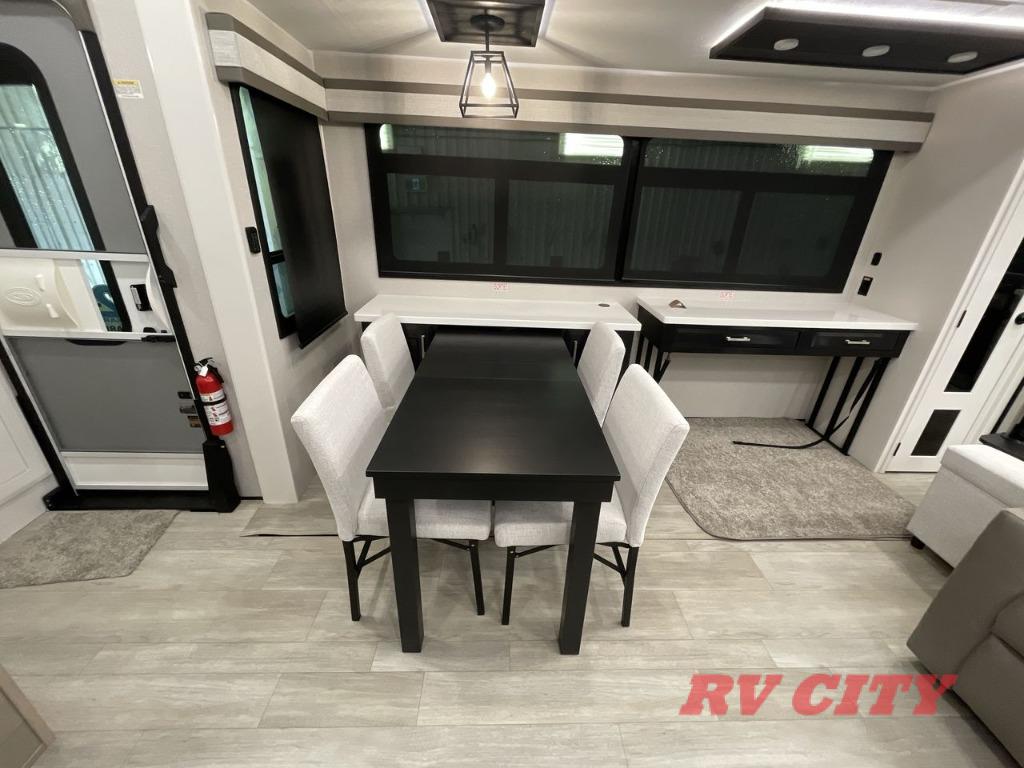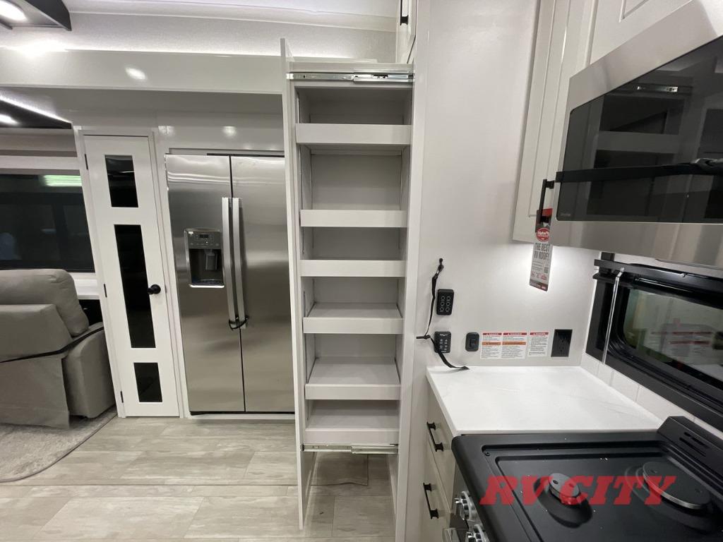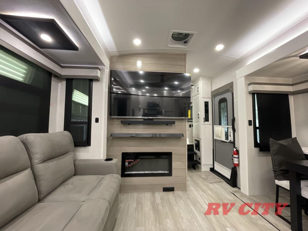 Triples slides, a desk/coffee bar, fireplace, and a huge master bath in front all indicate the kind of vacation you will experience in this Pinnacle Fifth Wheel! As you enter, a convenient half bath is located straight ahead. Slightly to your left, a nice seating area for gathering with family or friends to relax and watch TV, enjoy the fireplace while reading a book or watching a movie, and the dining table with chairs. The dinette slide also houses a 21 cu. ft. residential refrigerator and pantry. The rear kitchen features a u-shaped counter, all the appliances you need to cook like at home, even a pull-out butcher block space for chopping up your veggies. Back through and up the steps to your right in front, the master bedroom will make you feel like royalty with its king bed, plus luxurious full rear bath. A huge vanity with dual bath sinks will allow you both to get ready at the same time, plus there is a walk-in shower with a seat for added convenience. Speaking of walk-in, you will also love the spacious walk-in closet that includes washer/dryer prep.