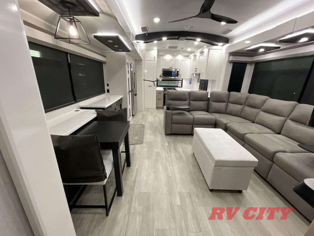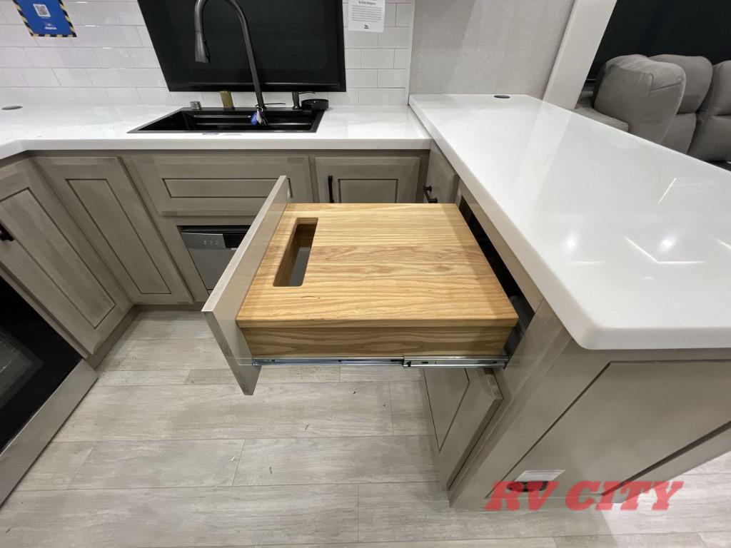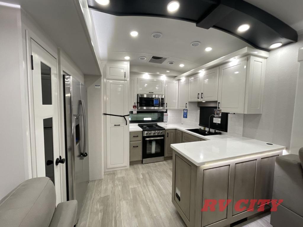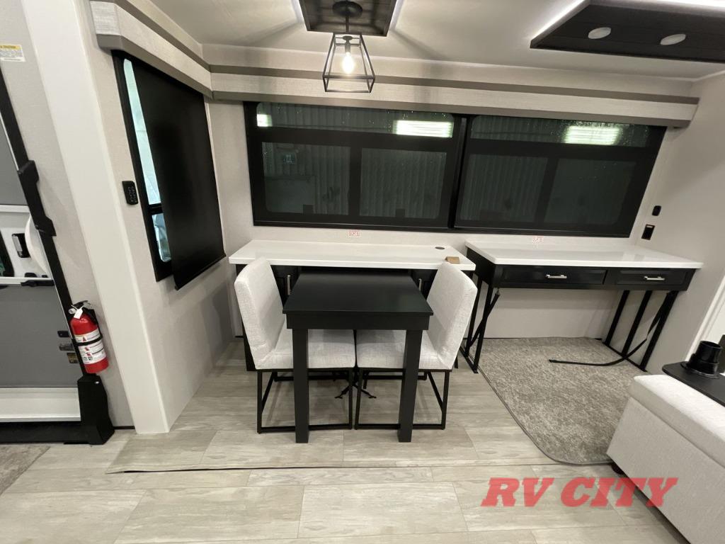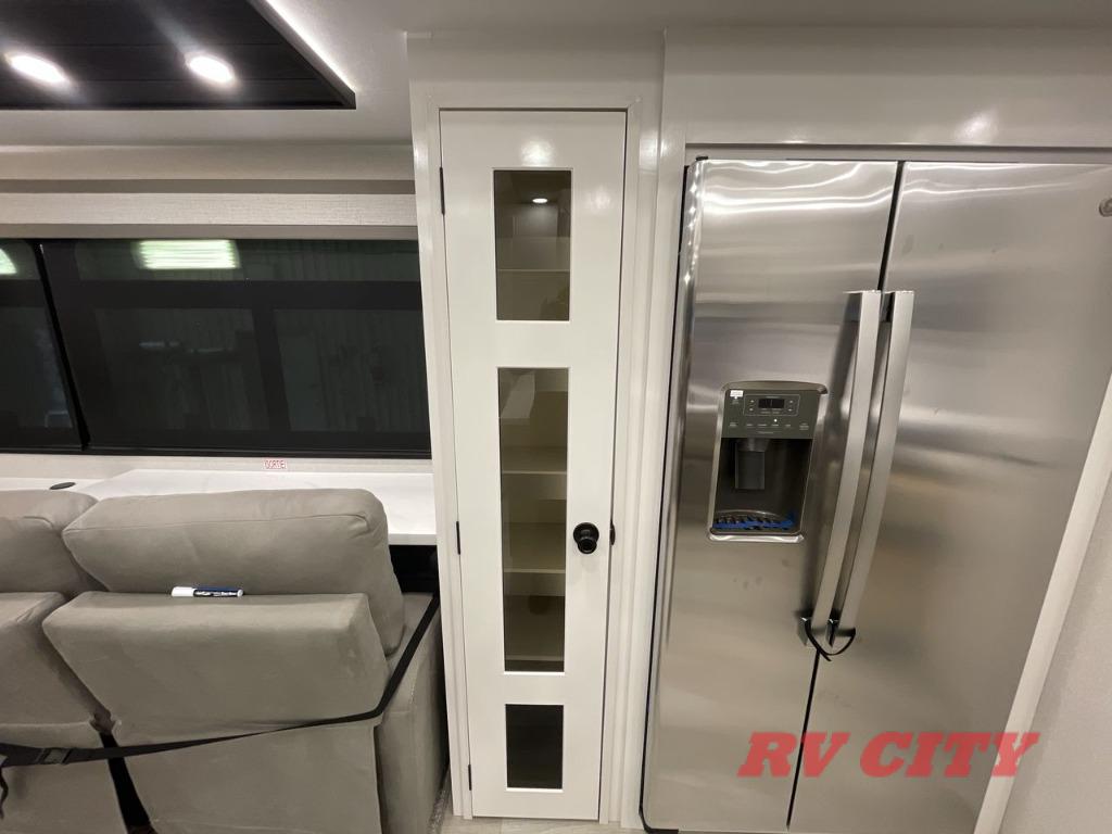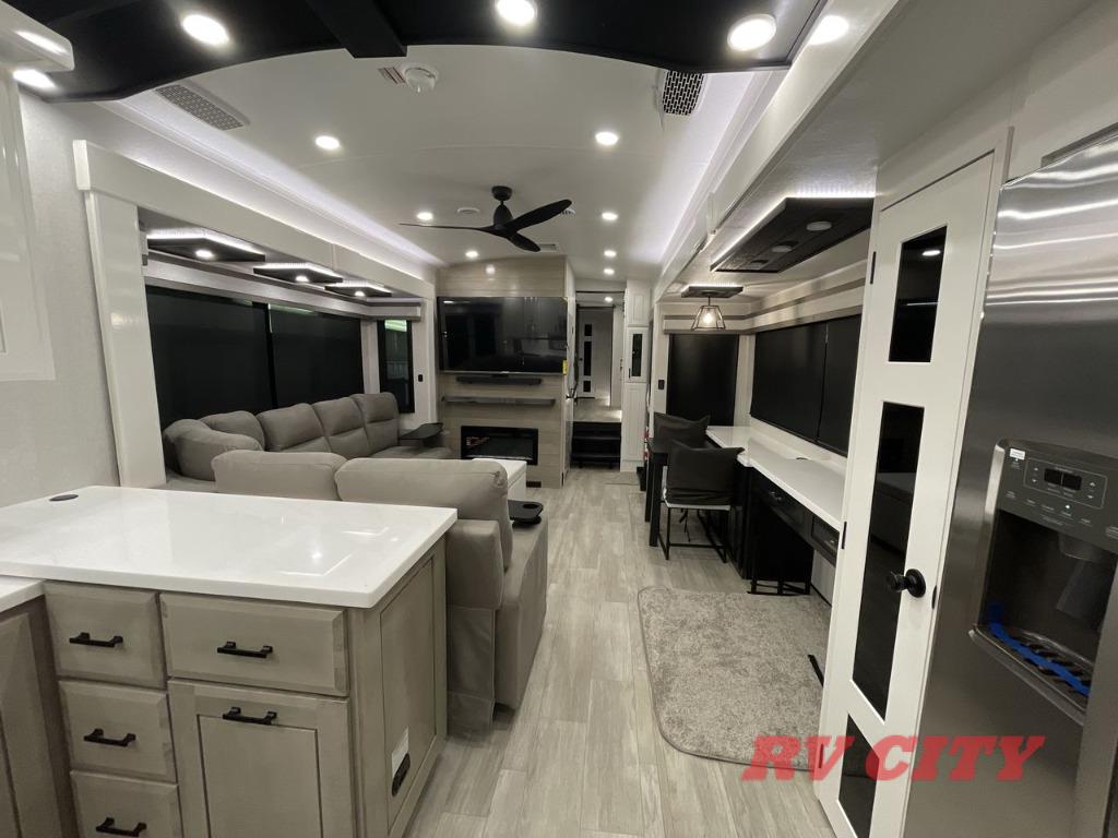 Triples slides, a desk/coffee bar, fireplace, and a huge master bath in front all indicate the kind of vacation you will experience in this Pinnacle Fifth Wheel! As you enter, a convenient half bath is located straight ahead. Slightly to your left, a nice seating area for gathering with family or friends to relax and watch TV, enjoy the fireplace while reading a book or watching a movie, and the dining table with chairs. The dinette slide also houses a 21 cu. ft. residential refrigerator and pantry. The rear kitchen features a u-shaped counter, all the appliances you need to cook like at home, even a pull-out butcher block space for chopping up your veggies. Back through and up the steps to your right in front, the master bedroom will make you feel like royalty with its king bed, plus luxurious full rear bath. A huge vanity with dual bath sinks will allow you both to get ready at the same time, plus there is a walk-in shower with a seat for added convenience. Speaking of walk-in, you will also love the spacious walk-in closet that includes washer/dryer prep.