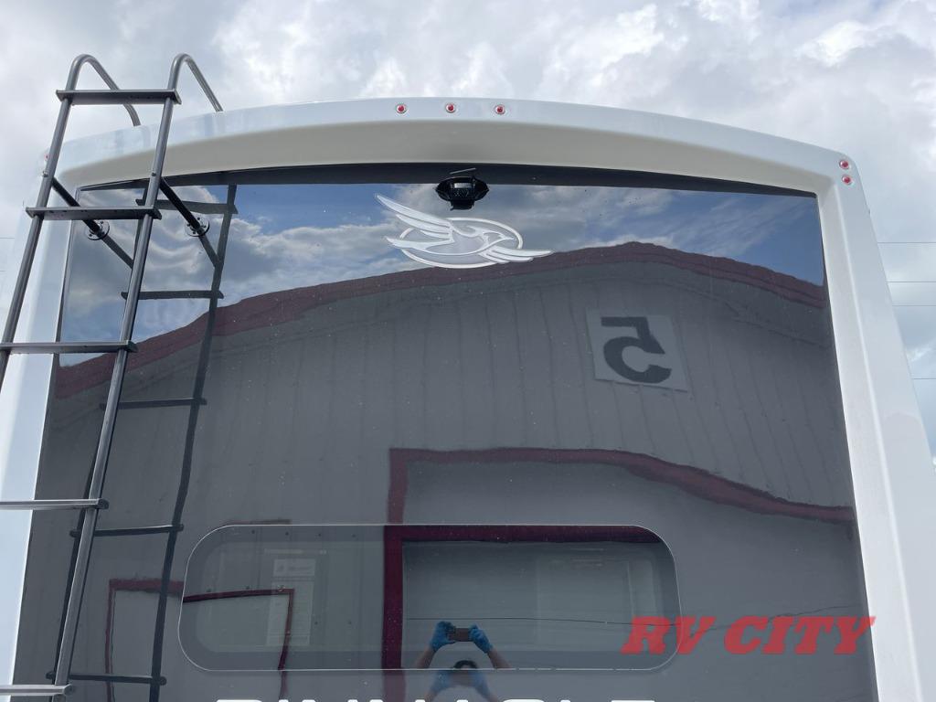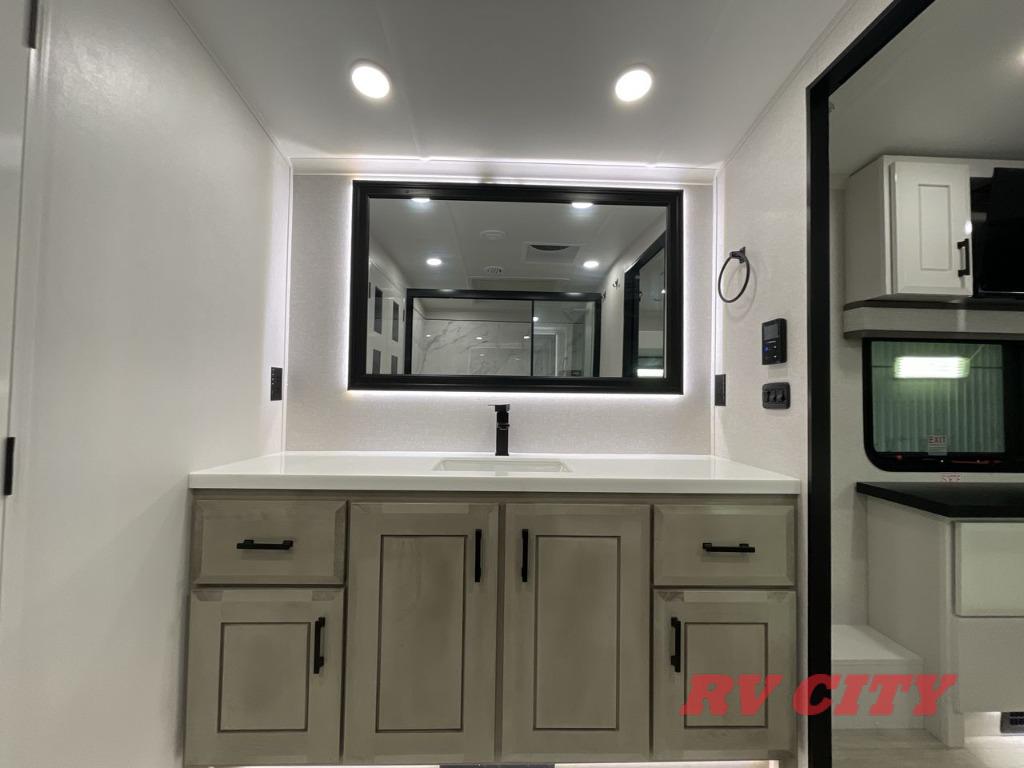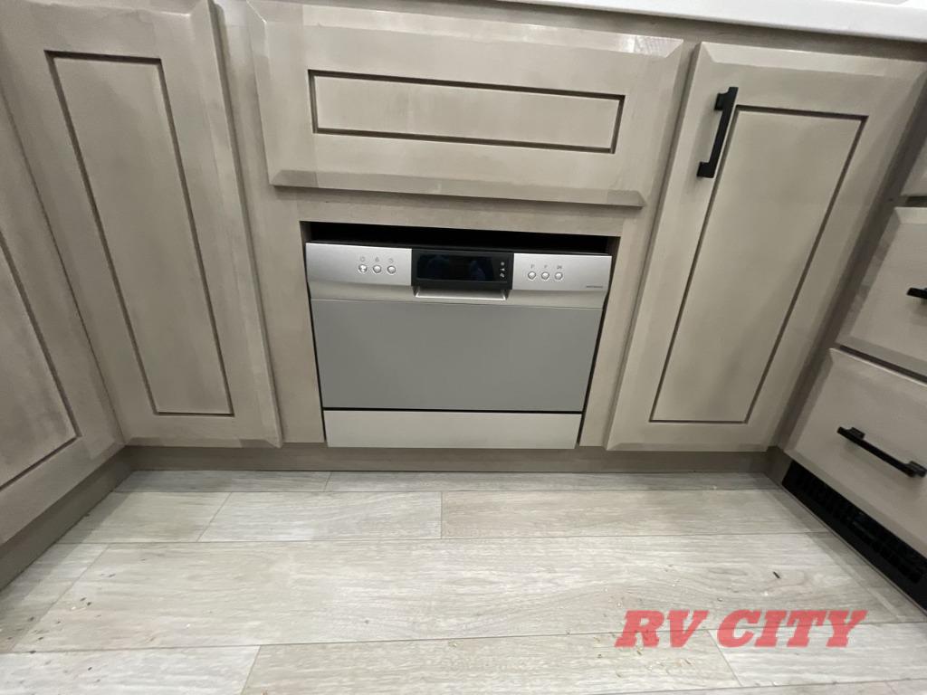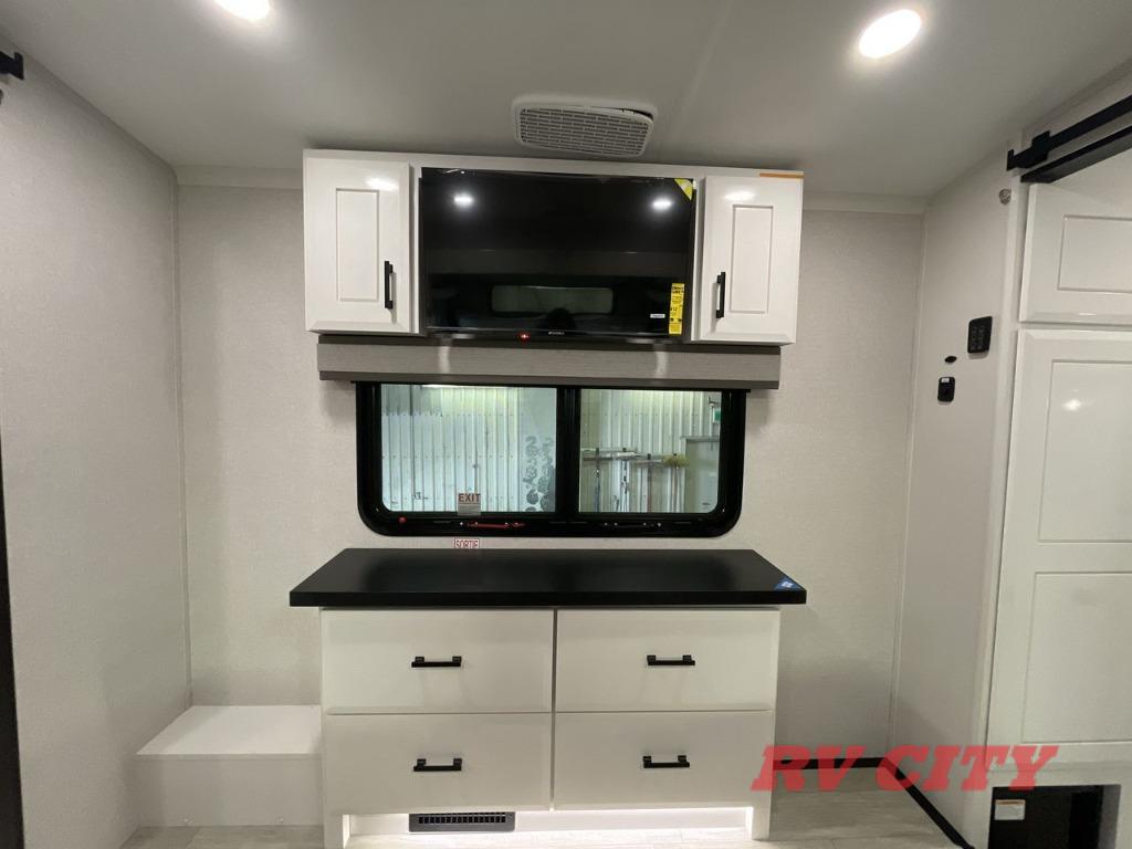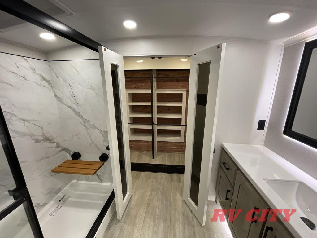 Triples slides, a desk/coffee bar, fireplace, and a huge master bath in front all indicate the kind of vacation you will experience in this Pinnacle Fifth Wheel! As you enter, a convenient half bath is located straight ahead. Slightly to your left, a nice seating area for gathering with family or friends to relax and watch TV, enjoy the fireplace while reading a book or watching a movie, and the dining table with chairs. The dinette slide also houses a 21 cu. ft. residential refrigerator and pantry. The rear kitchen features a u-shaped counter, all the appliances you need to cook like at home, even a pull-out butcher block space for chopping up your veggies. Back through and up the steps to your right in front, the master bedroom will make you feel like royalty with its king bed, plus luxurious full rear bath. A huge vanity with dual bath sinks will allow you both to get ready at the same time, plus there is a walk-in shower with a seat for added convenience. Speaking of walk-in, you will also love the spacious walk-in closet that includes washer/dryer prep.