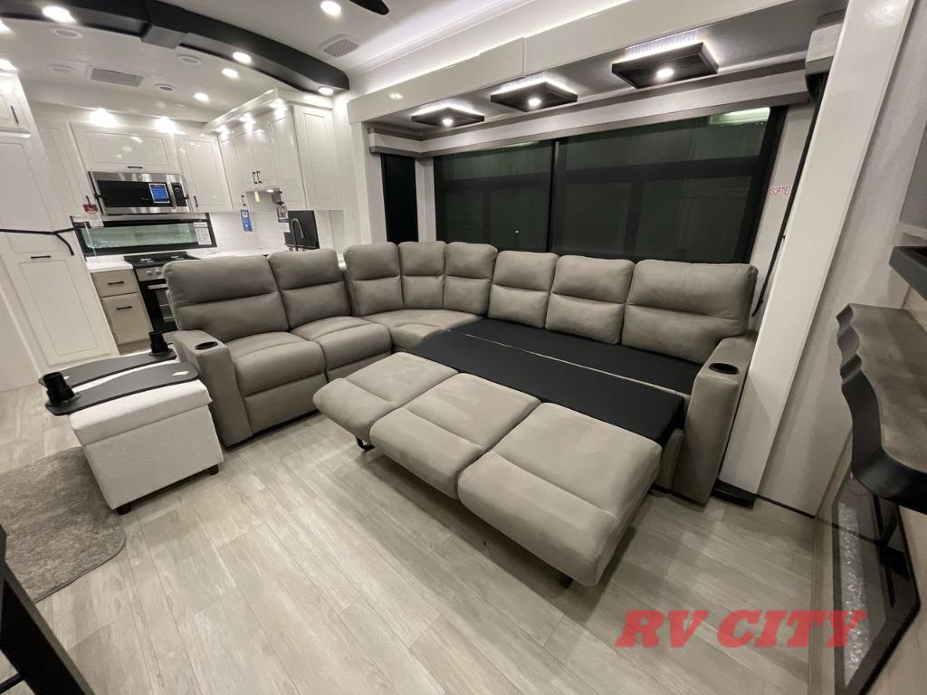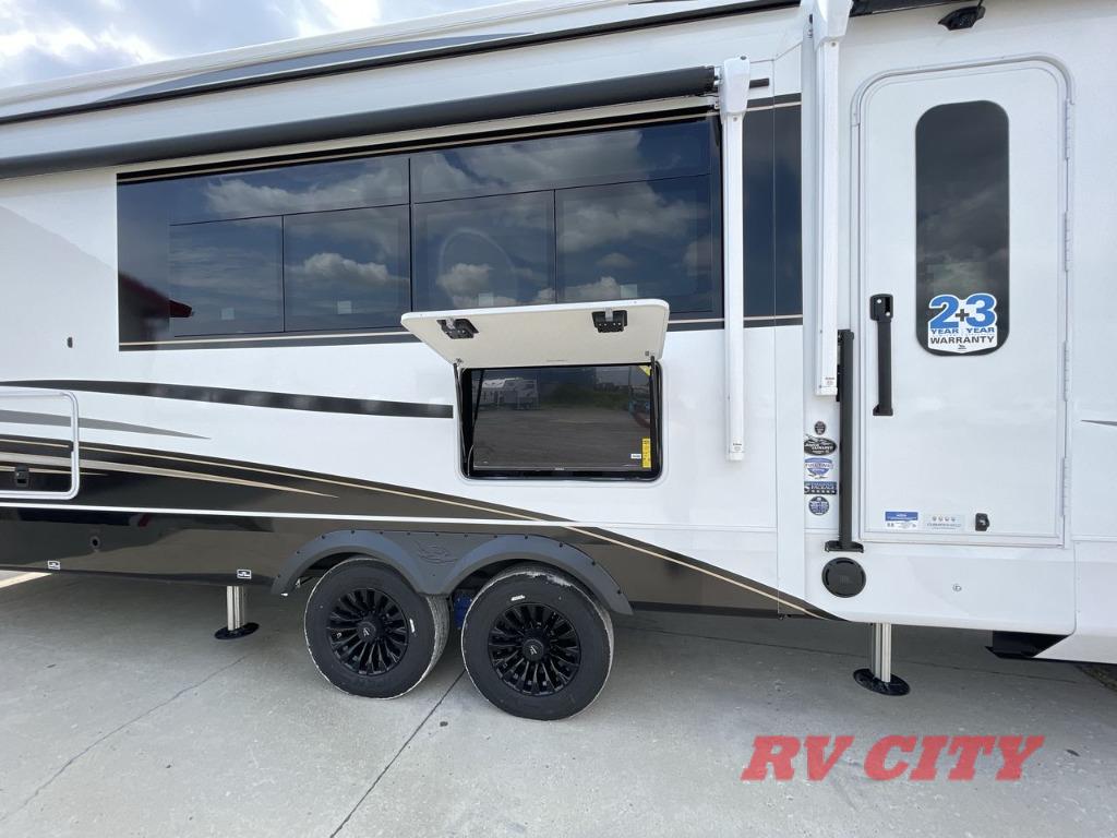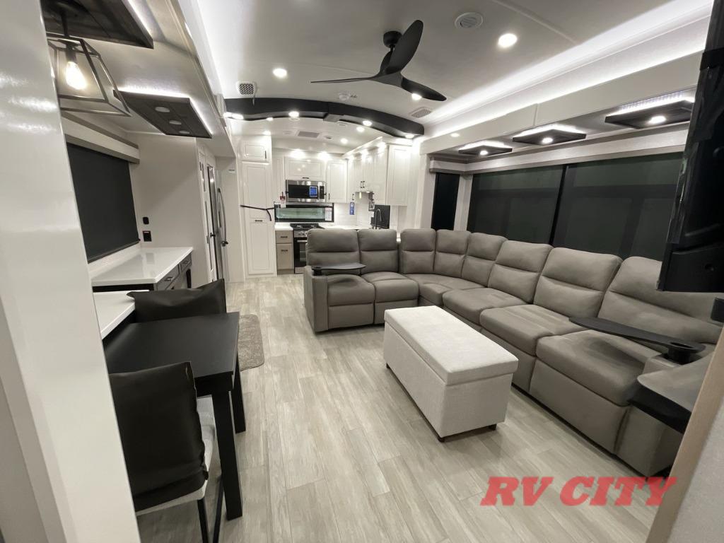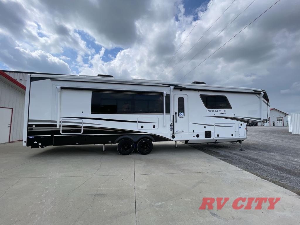 Each Pinnacle fifth wheel features Stronghold VBL lamination for the lightest, yet strongest construction in the RV industry. Add that to the Magnum Truss XL6 roof system and Climate Shield zero-degree tested weather protection and you'll be enjoying your fifth wheel for years to come. Some of the exterior conveniences you will appreciate are the Keyed-Alike lock system, the fully enclosed, universal docking center, and the 6-point hydraulic auto-leveling system for quick and easy set up. The 5 Star Handling Package will make towing a fifth wheel a walk in the park, and the two Whisper Quiet A/C units will keep you comfortable during the hot summer months. Inside, you'll enjoy the residential "Do it all" sink with pull-out kitchen faucet, glass rinse, and vegetable rinse, the handcrafted hardwood glazed cabinetry, the vinyl flooring throughout, plus many more comforts. There is even a central vacuum system, a wireless remote control system, USB ports throughout, plus many more conveniences to make each trip enjoyable.