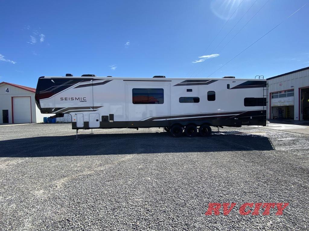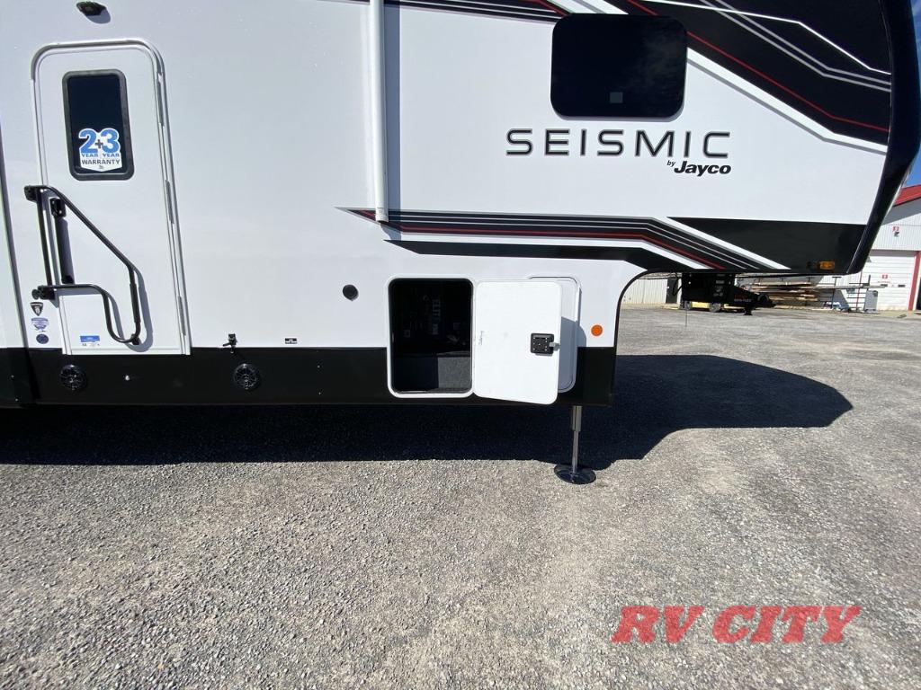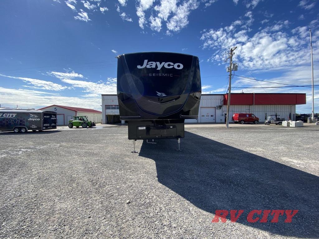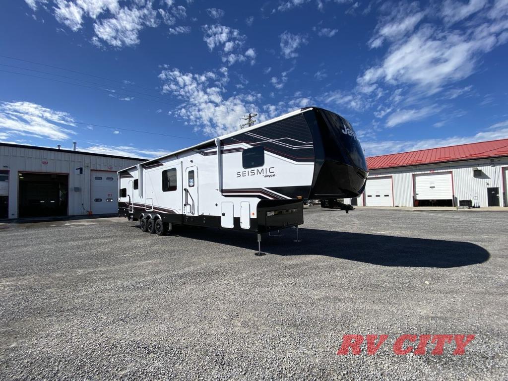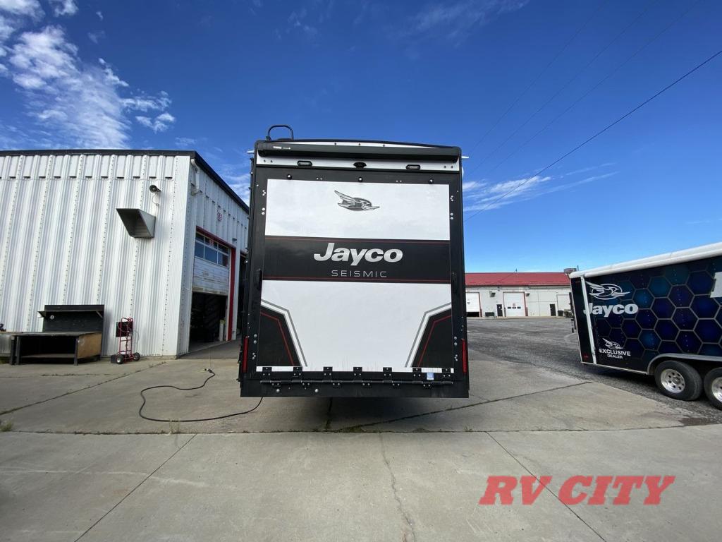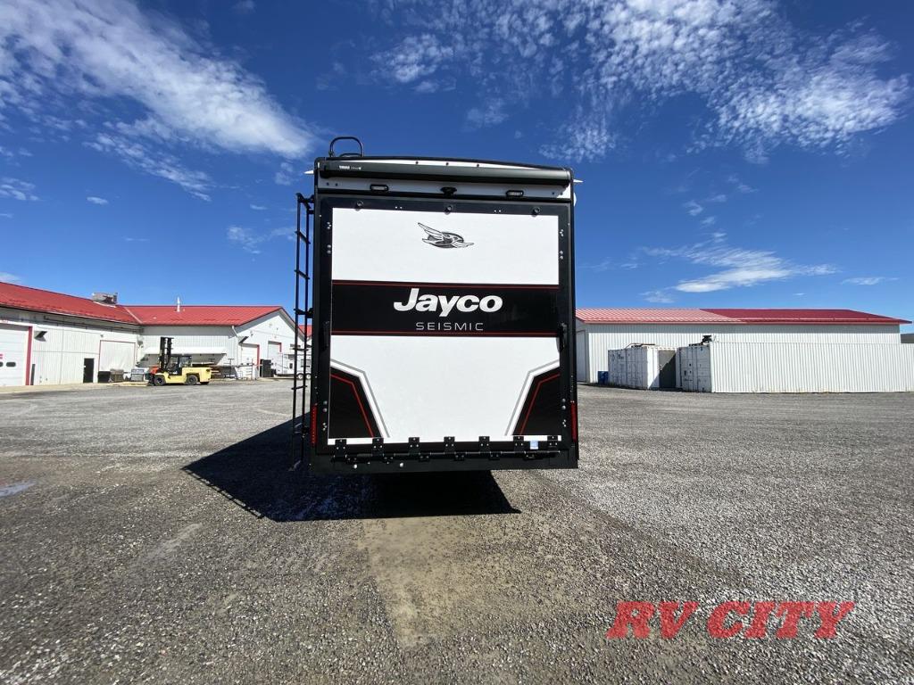 The Seismic Toy Hauler has room for all your toys with its 102-inch wide-body design, and is equipped to get you wherever you want to go. Seismic has a standard ramp patio with rear steps, three-seasons room and a 5.5K generator, 17.5-inch Uniroyal "H" rated tires and 6-point hydraulic landing gear. The Seismic Toy Hauler is warrantied for full-time RV use with Jayco’s 2+3 warranty.