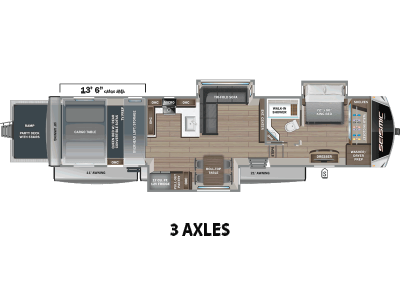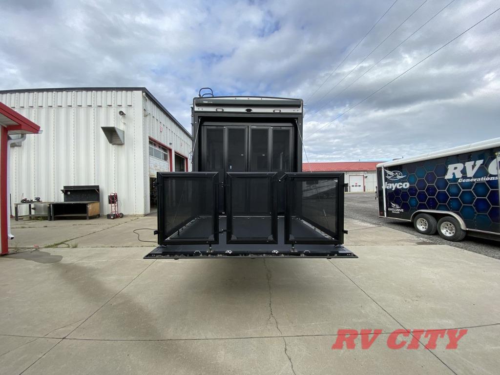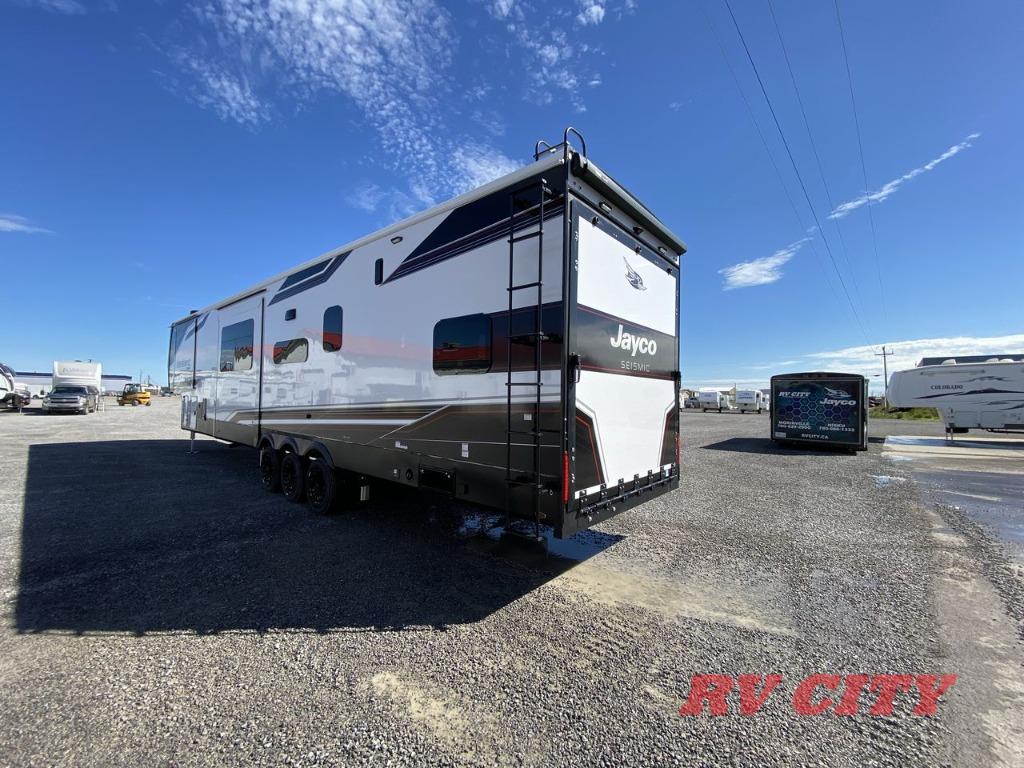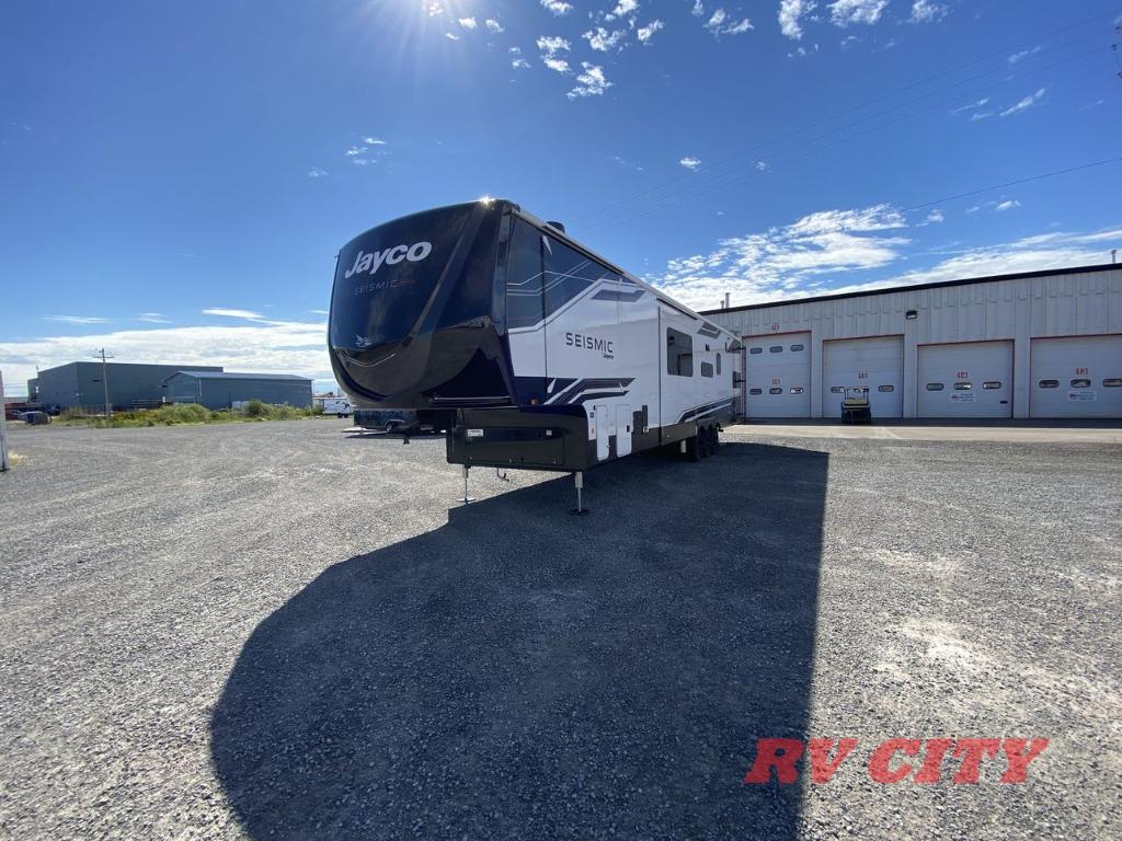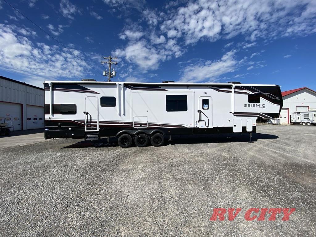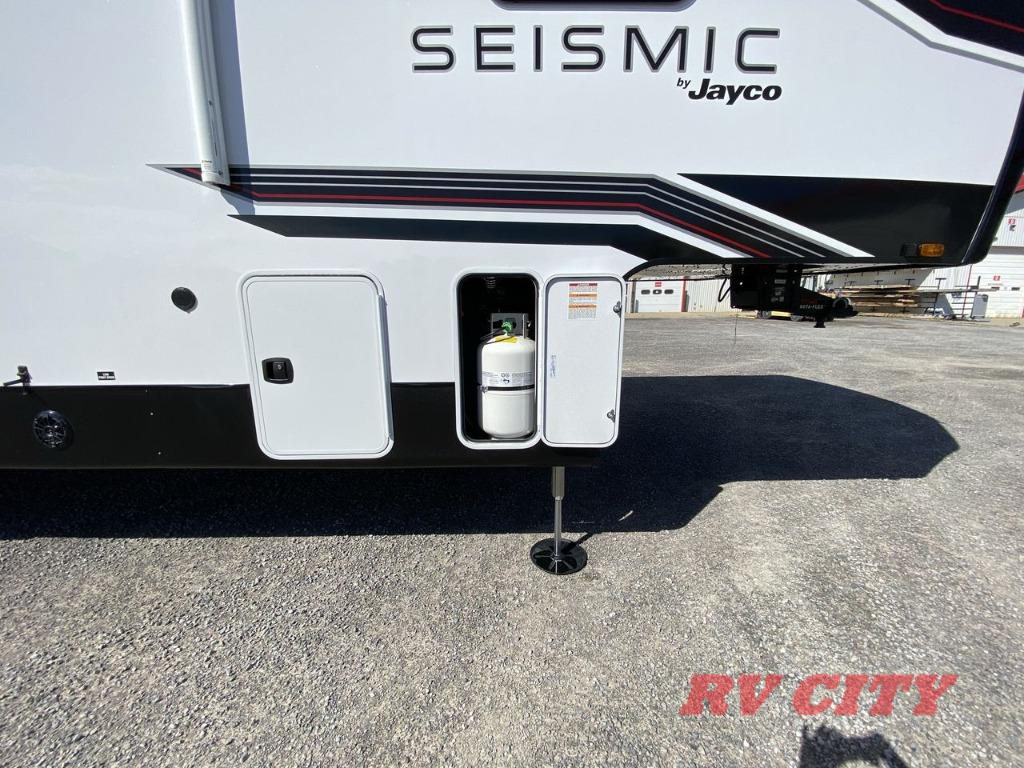 The Seismic Toy Hauler has room for all your toys with its 102-inch wide-body design, and is equipped to get you wherever you want to go. Seismic has a standard ramp patio with rear steps, three-seasons room and a 5.5K generator, 17.5-inch Uniroyal "H" rated tires and 6-point hydraulic landing gear. The Seismic Toy Hauler is warrantied for full-time RV use with Jayco’s 2+3 warranty.
