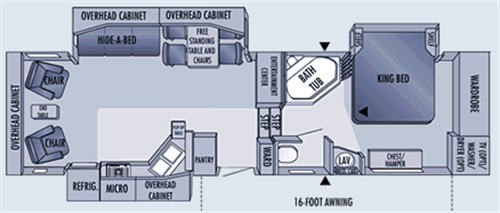 Triple Slide, Rear Living Space w/2 Recliners, End Table, Hide-A-Bed, Free Standing Table & Chairs or Opt. Booth Dinette, Refrigerator, Range, Double Kitchen Sink, Pantry, Ent. Center, Garden Tub/Opt. Shower, King Bed Slide and Much More.