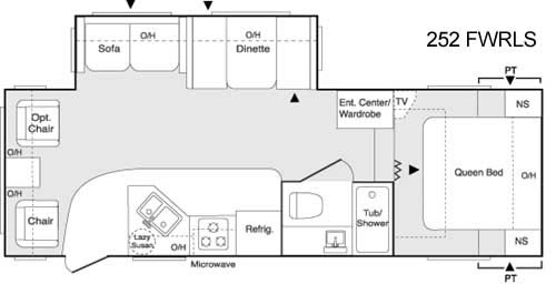 Single Slide, Rear Living Area w/Easy Chair & Table, Opt, 2nd Easy Chair, Sofa & Booth Dinette, Flip-top Counter, Dbl. Kitchen Sink, 3 Burner Range, Refrigerator, Ent. Center, Angle Garden Tub, Lav., Stool Room, Front Queen Bed w/2 Wardrobes, Pass-Through Storage, Overhead Cabinets, and Much More!