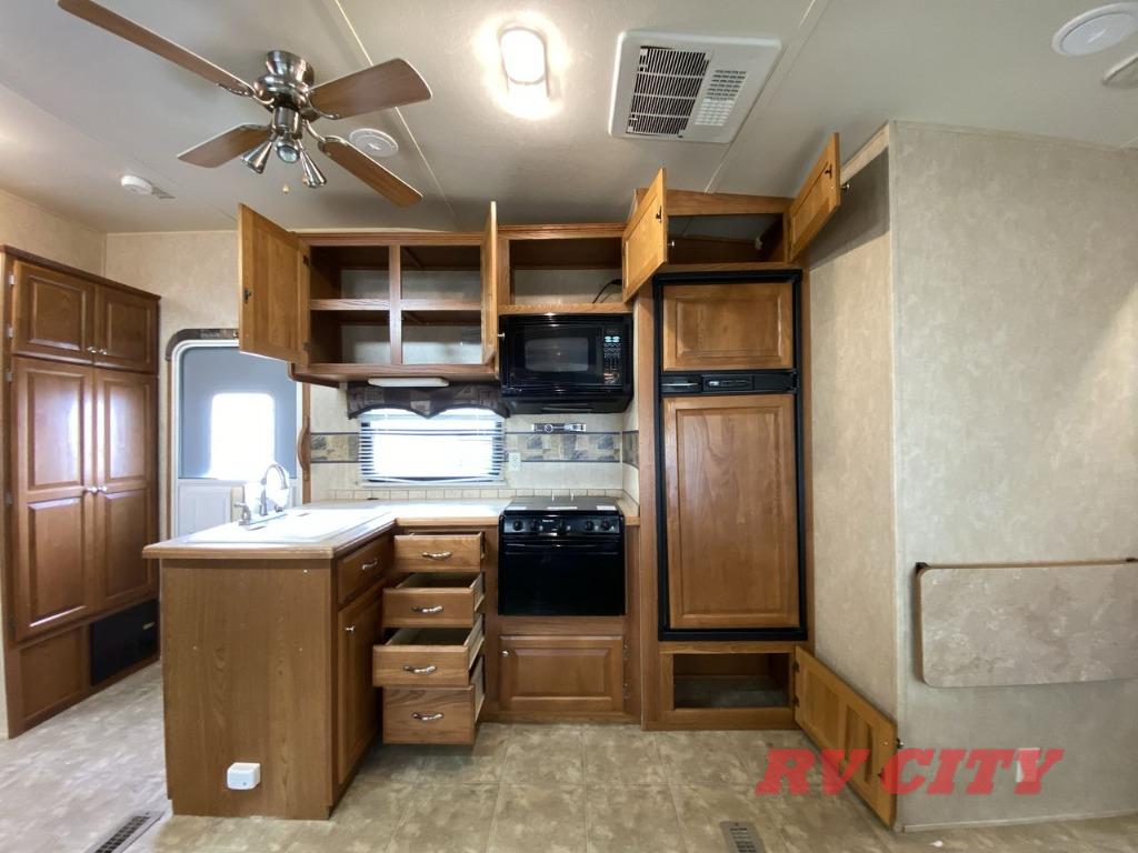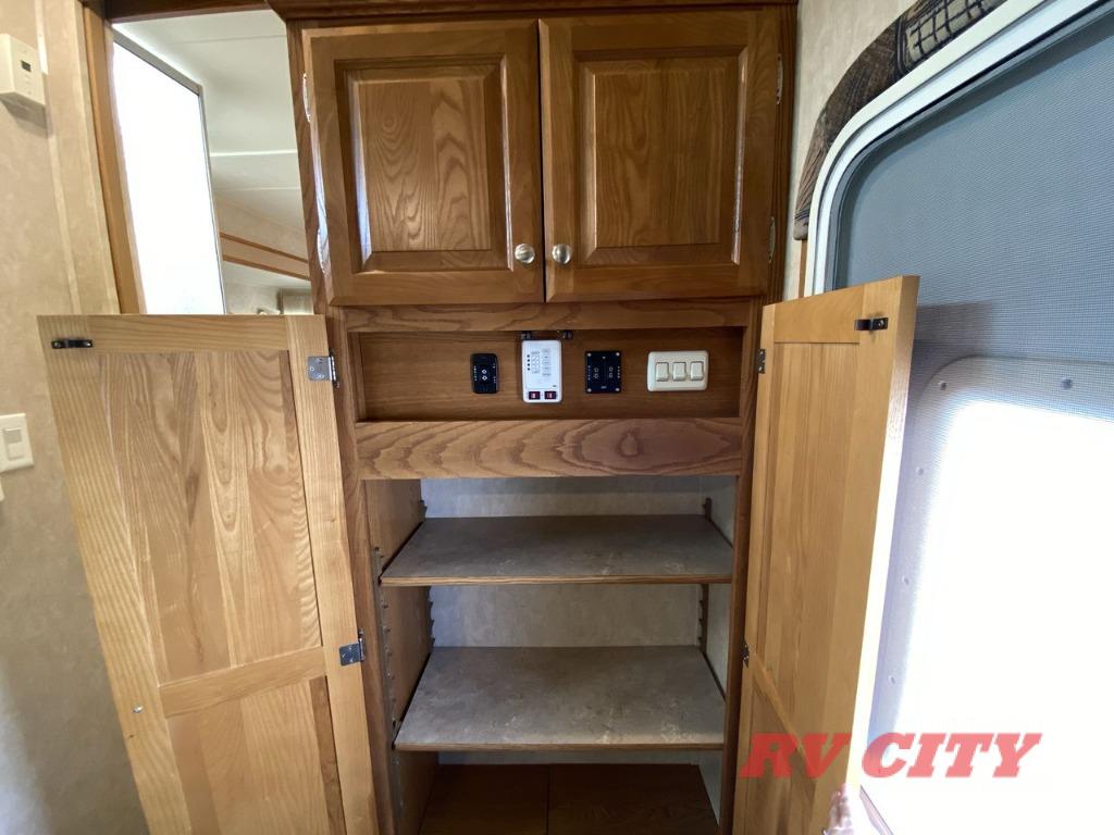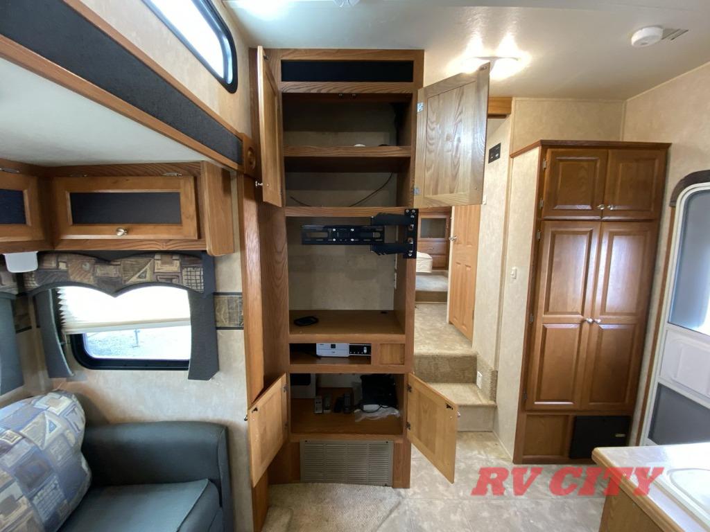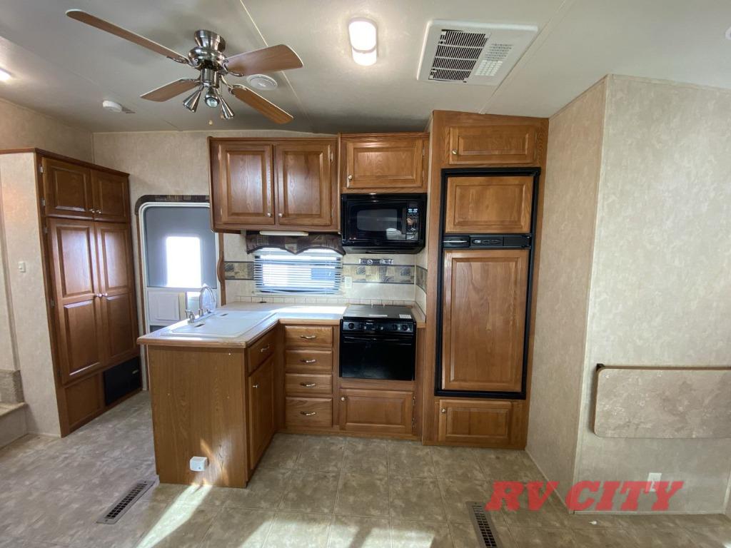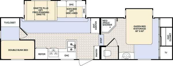 Double Bed Size Bunks, TV Cabinet, Dinette Plus or Free-Standing Dinette/Chairs, Hide-A-Bed or Sofa Bed, 3 Burner Range, Double Kitchen Sink, Pantry, Ent. Center, Neo-Angle Shower, Queen Bed Slide, TV Cabinet, Closet, Overhead Storage, and More.