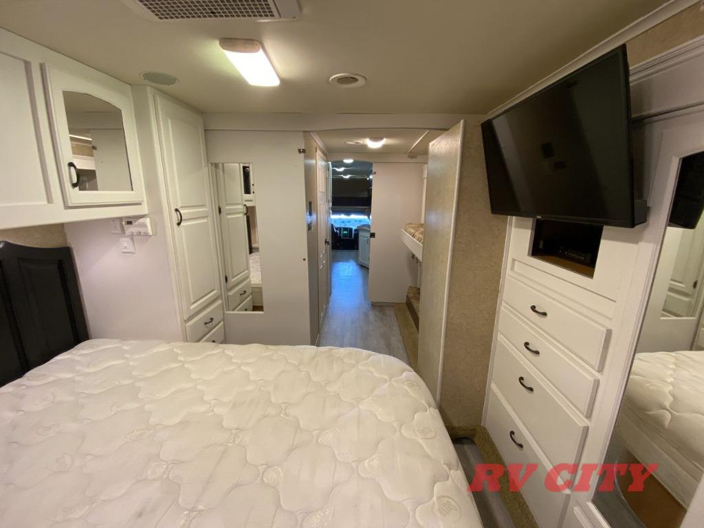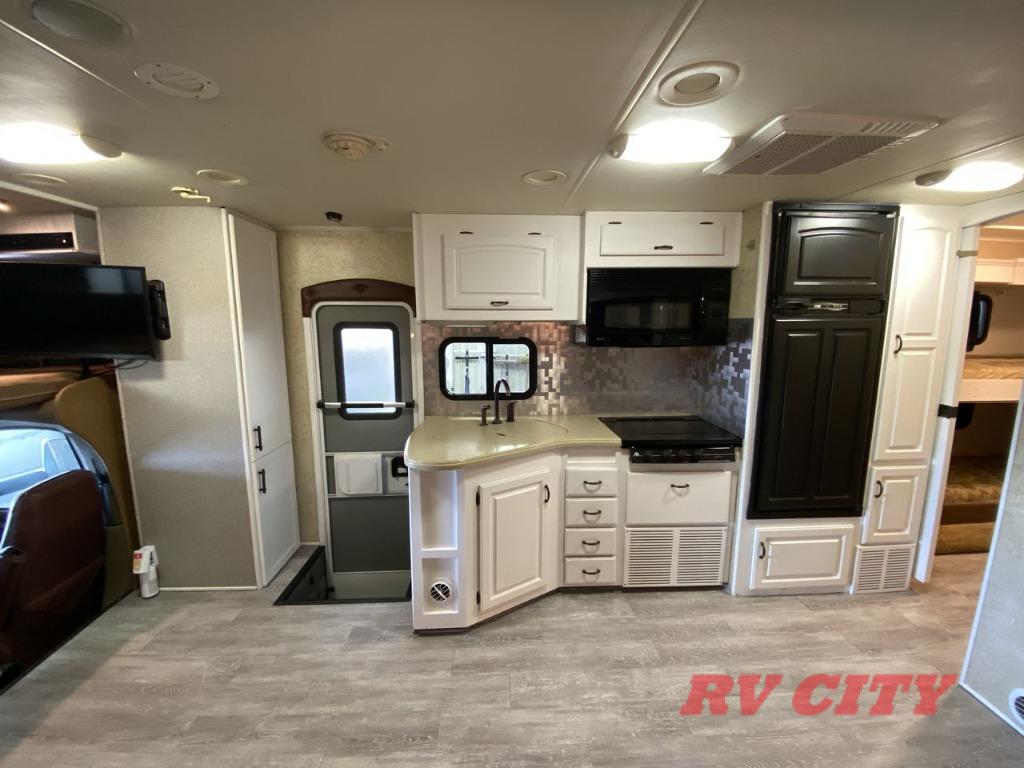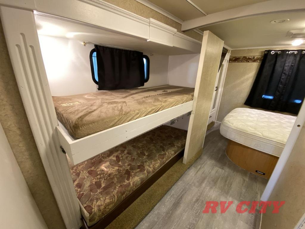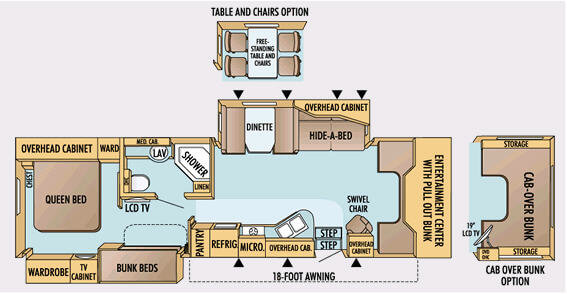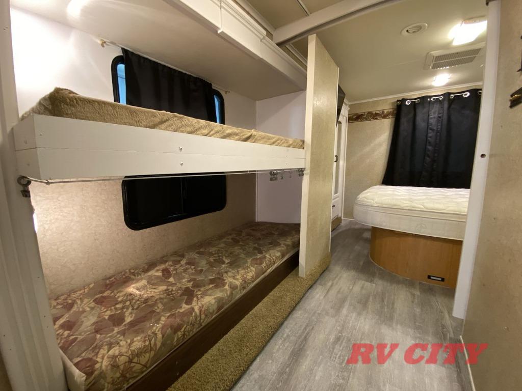 Double Slide Class C Bunkhouse w/Rear Queen Bed, Chest, Wardrobe, Overhead Cabinet, 2nd Wardrobe/TV Cabinet & Bunk Bed Slideout, LCD TV, Angle Shower, Lav., Med. Cabinet, Booth Dinette or Table & Chairs Opt. & Hide-A-Bed Sofa Slideout, Pantry, Refrigerator, 3 Burner Range w/Microwave, Double Kitchen Sink, Swivel Chair w/Overhead Cabinet, Front Ent. Center w/Pull-Out Bunk or Opt. Cab-Over Bunk, 18' Awning, Exterior Storage & Much More.