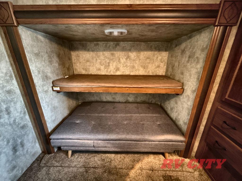 Rear Entertainment Bunkhouse has 2 slideouts; one with an Air Bed Sofa with Bunk Above and one with a Booth Dinette. Rear Wardrobe/Entertainment Center.
