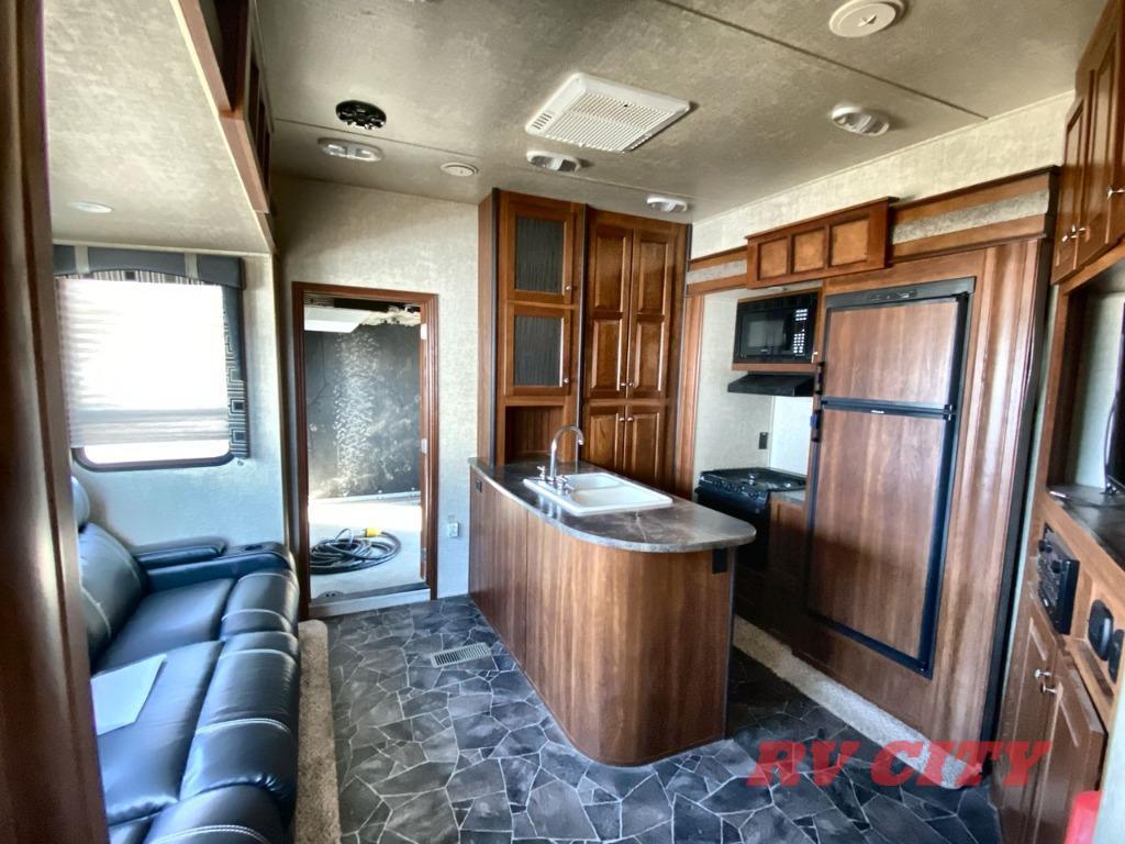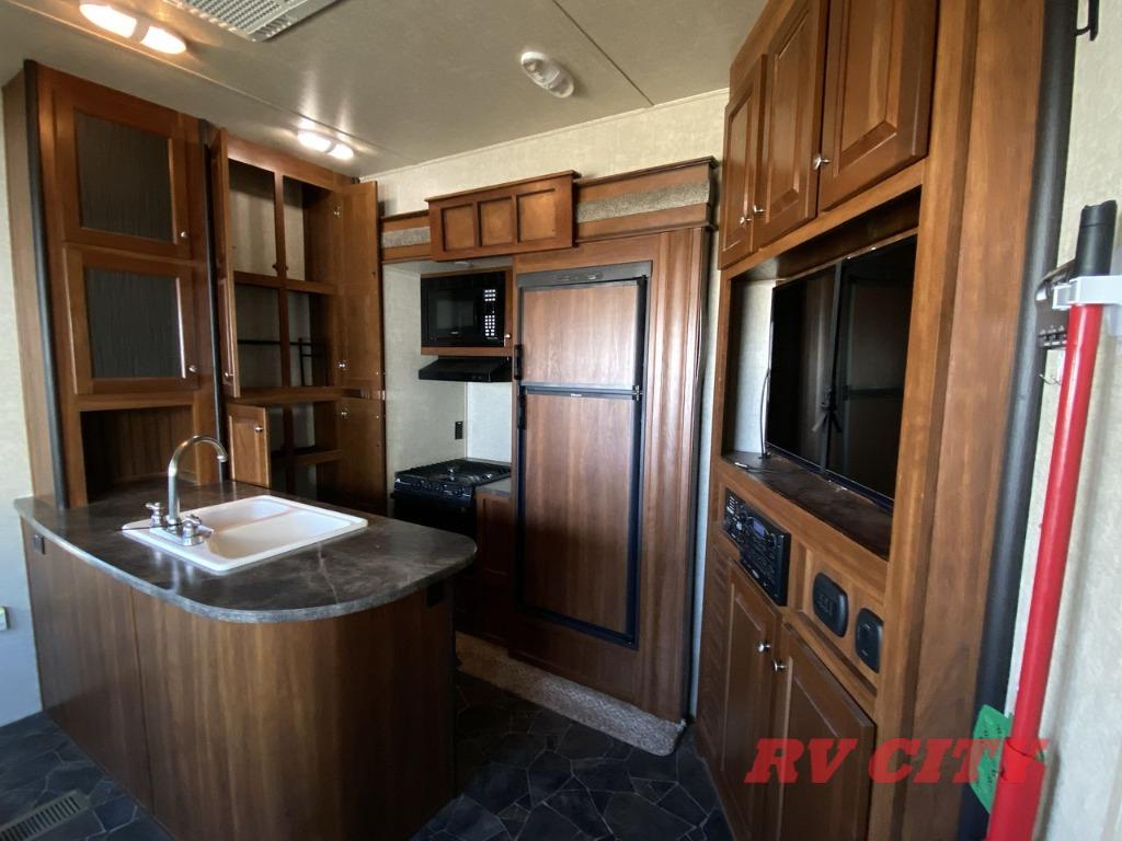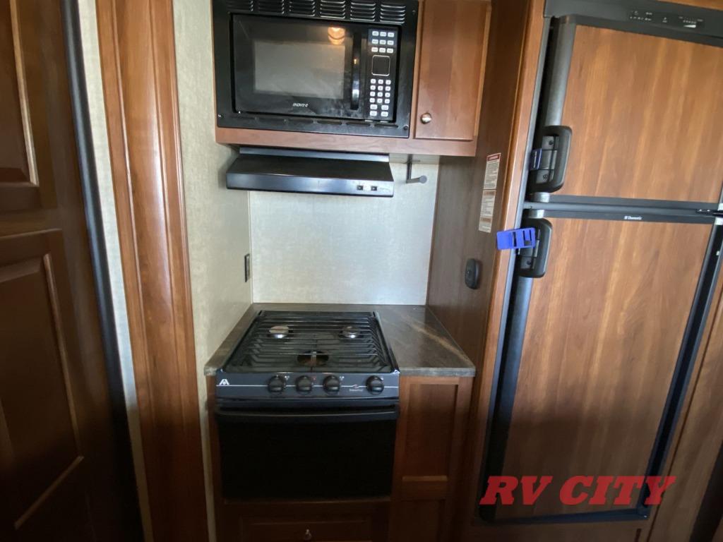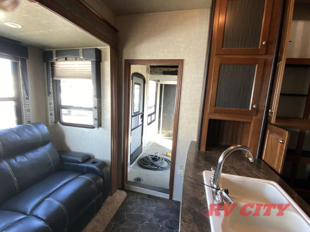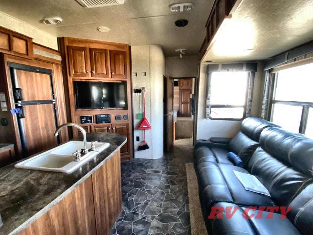 The living and kitchen area are combined and feature a large slide-out sofa with dinette table perfect for mealtime or hanging out. There is a peninsula with counter space and double sinks and pantry. There is also slide-out three burner range and 8 cu. ft. refrigerator.