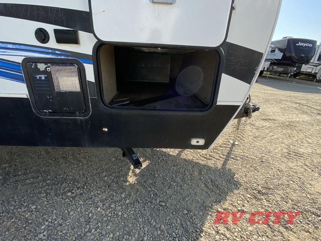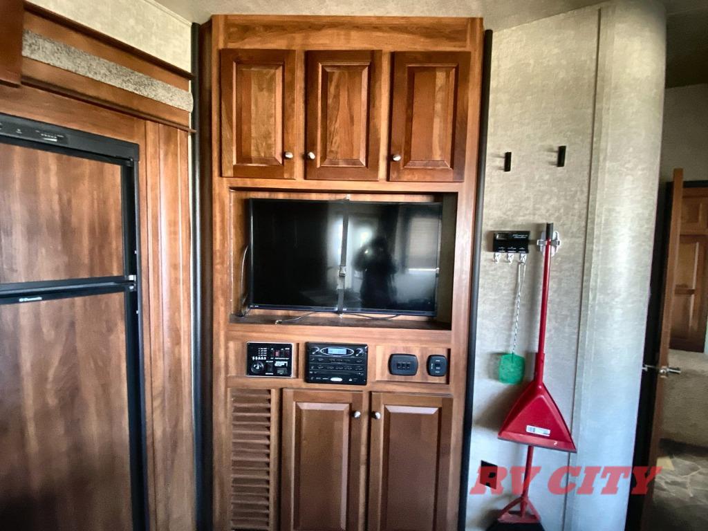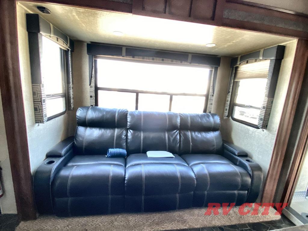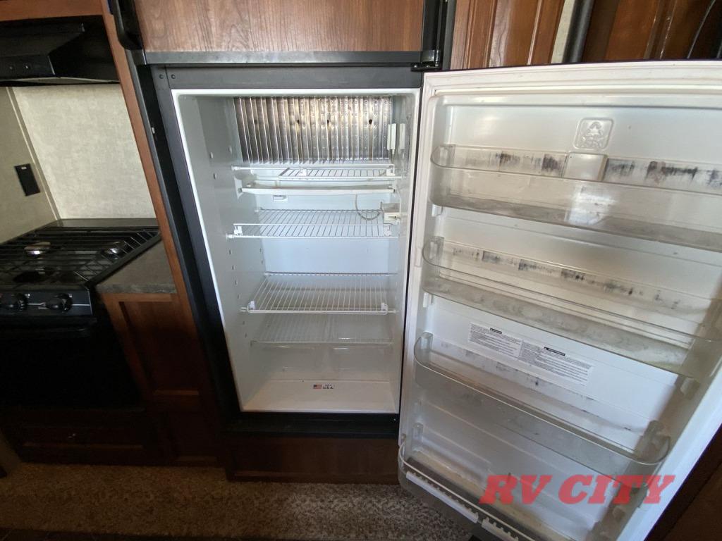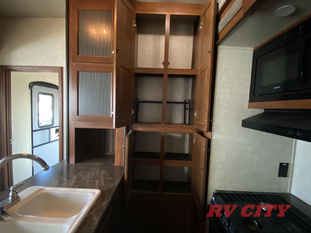 The living and kitchen area are combined and feature a large slide-out sofa with dinette table perfect for mealtime or hanging out. There is a peninsula with counter space and double sinks and pantry. There is also slide-out three burner range and 8 cu. ft. refrigerator.