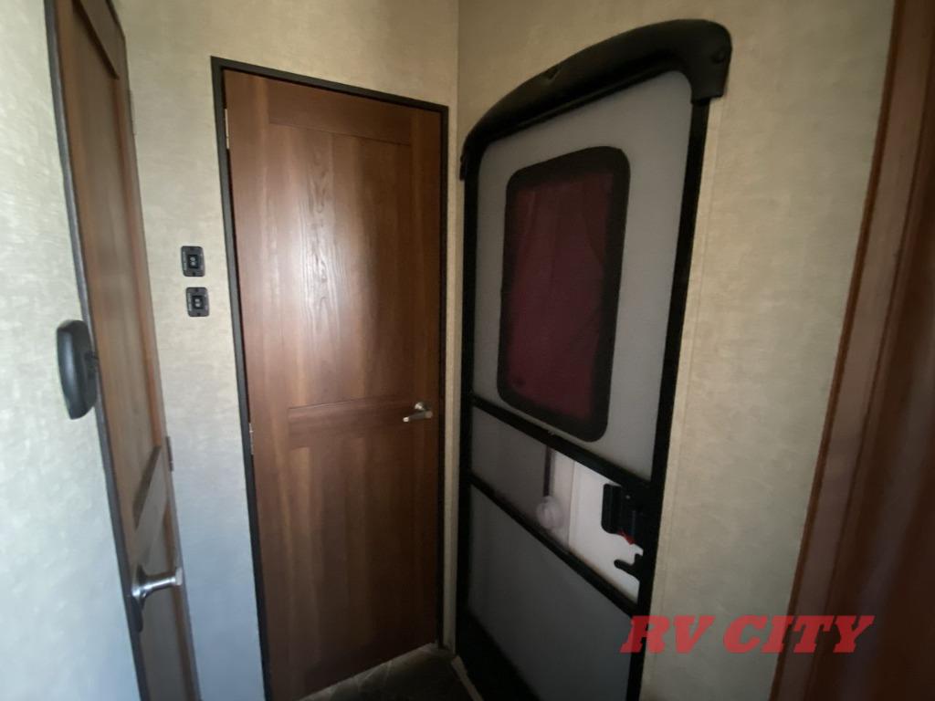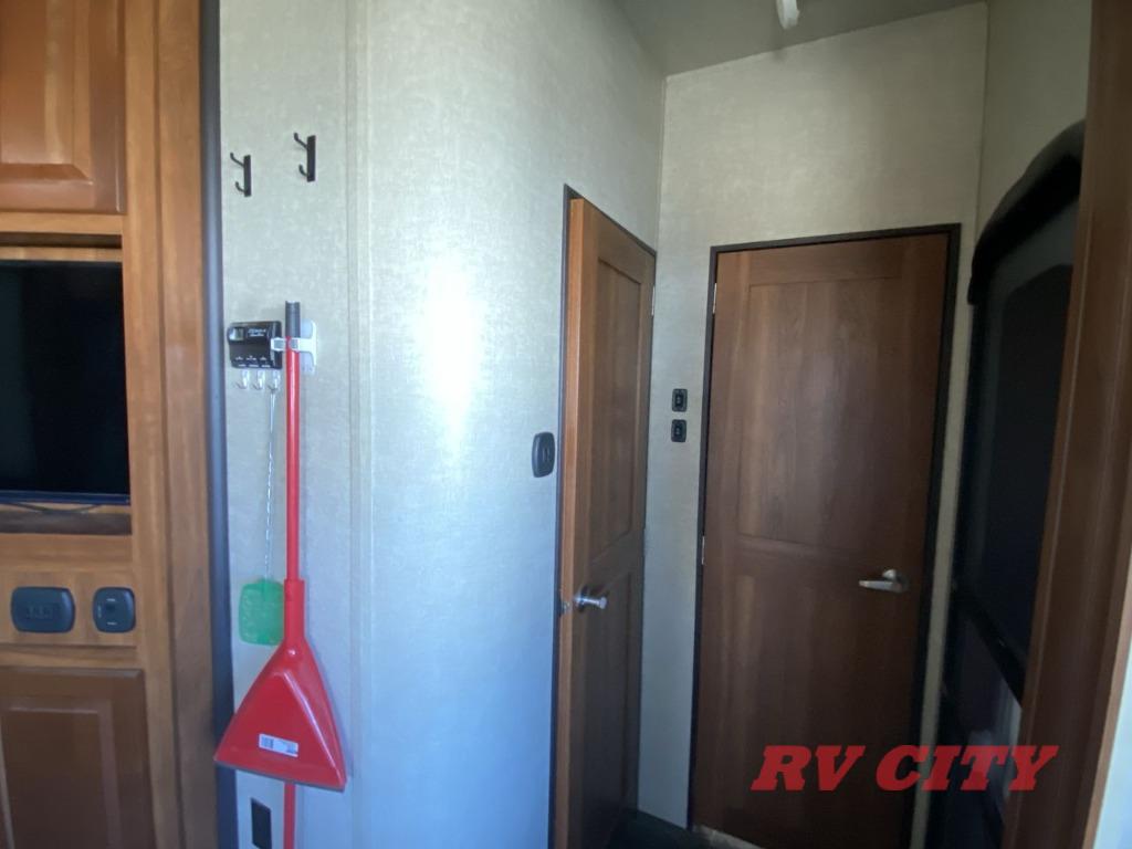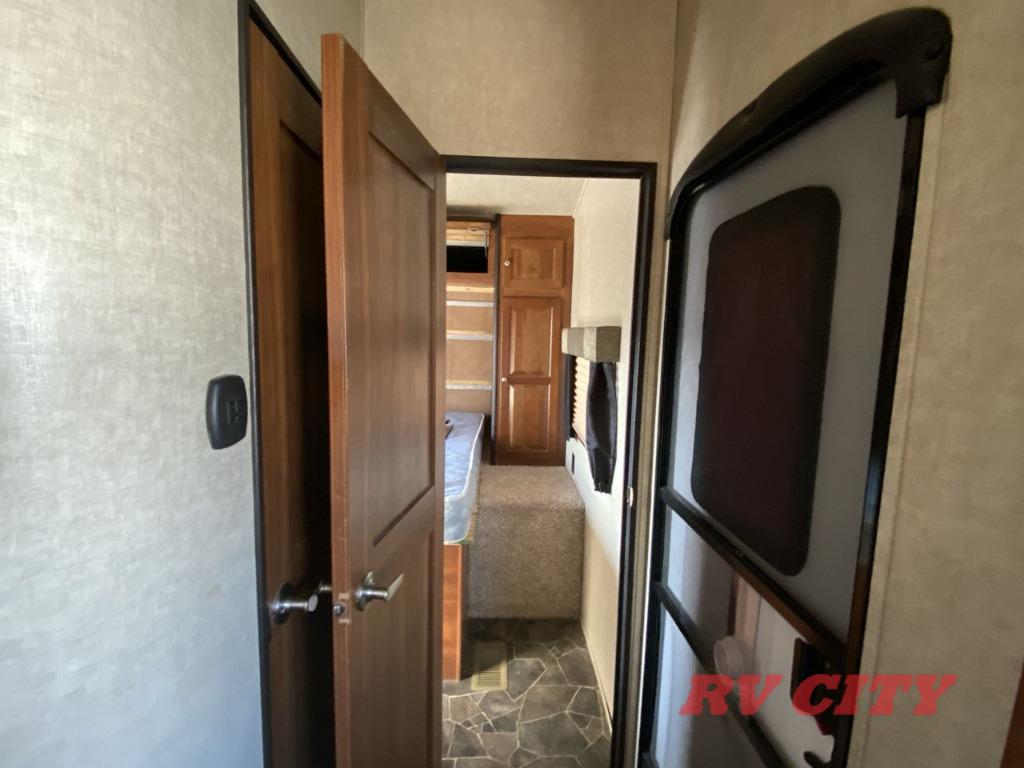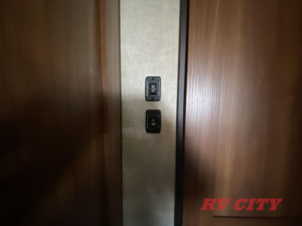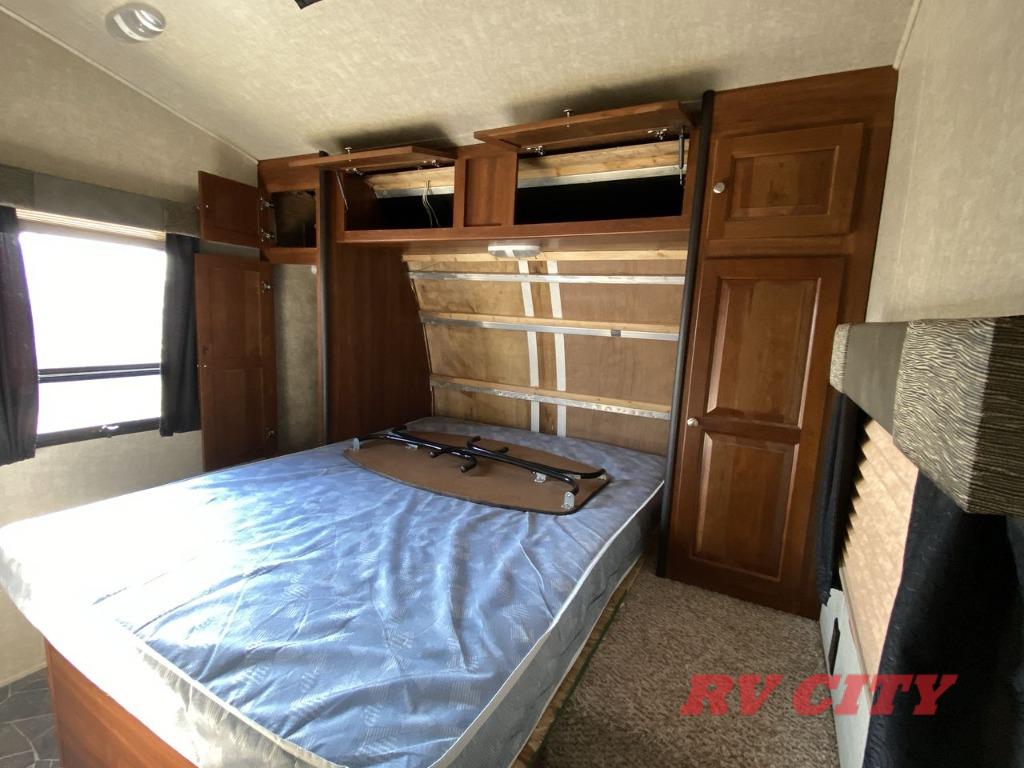 The front bedroom features a residential queen size bed, TV hookup, wardrobes on both sides of the bed, overhead cabinet, and so much more!