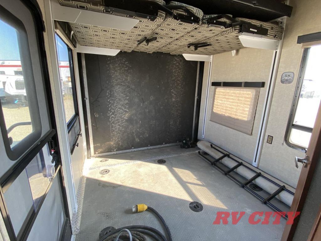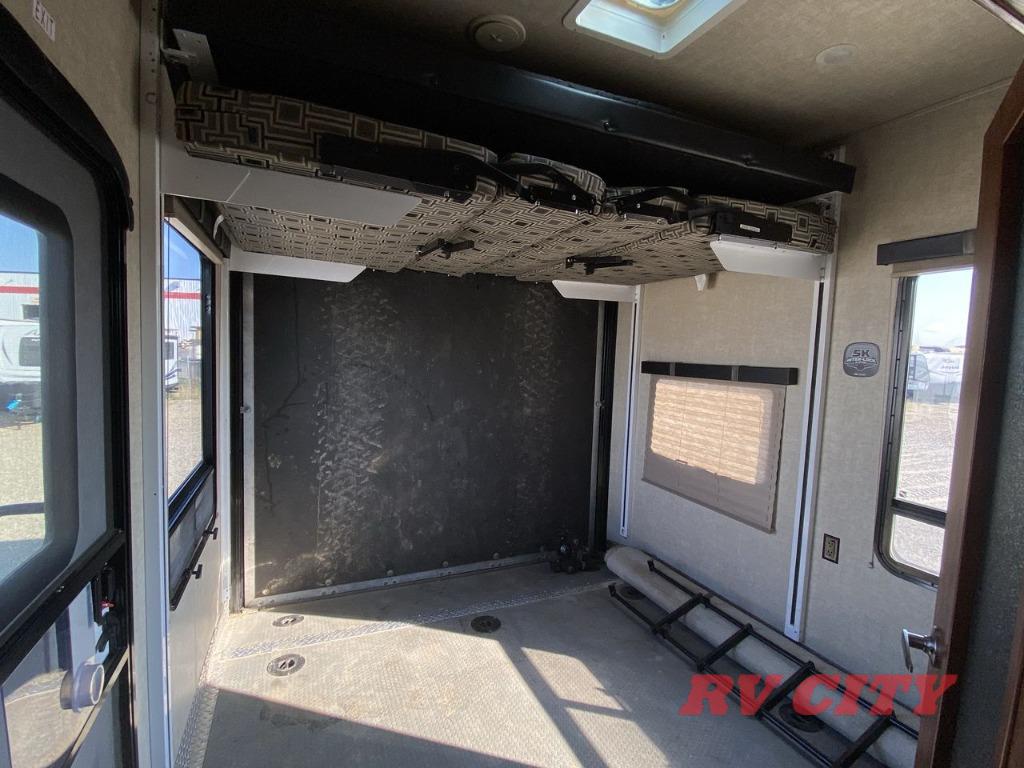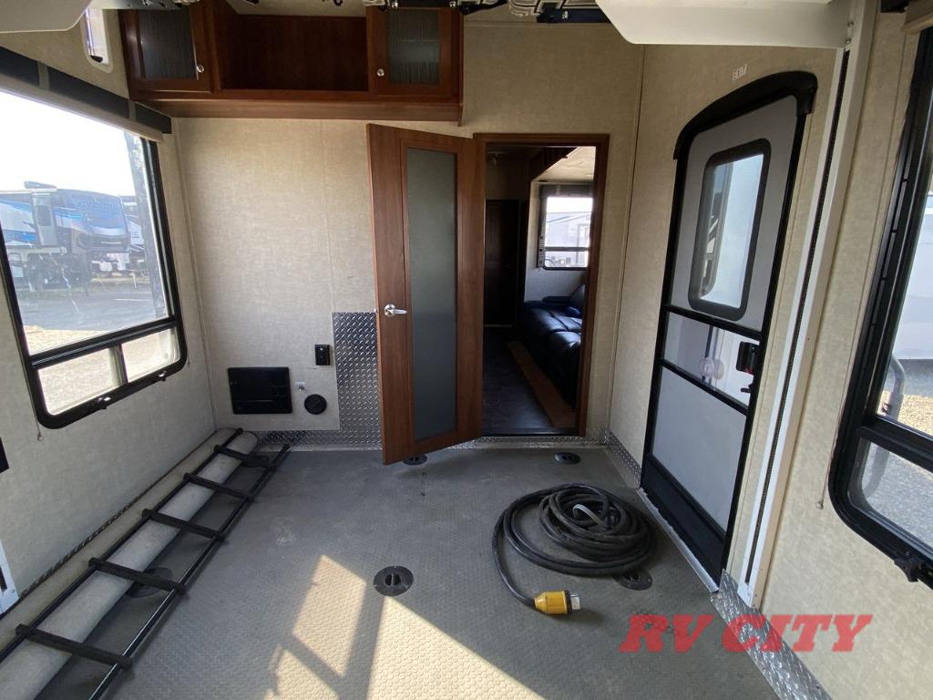 Step inside the 10' garage area and see how easily you can load and unload using the rear 8' garage door. There is overhead storage for gear inside, and dual opposing sofas with a top queen bed for use once you reach your destination and the cargo is removed. There are multiple tie downs to keep your things secure as you travel.