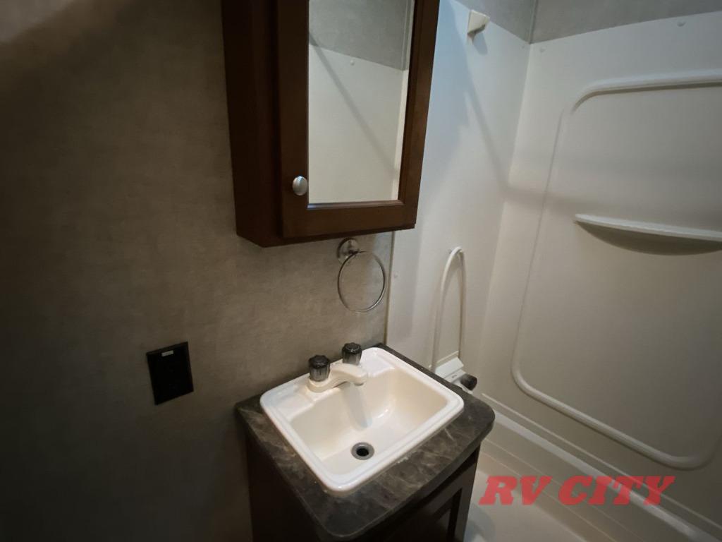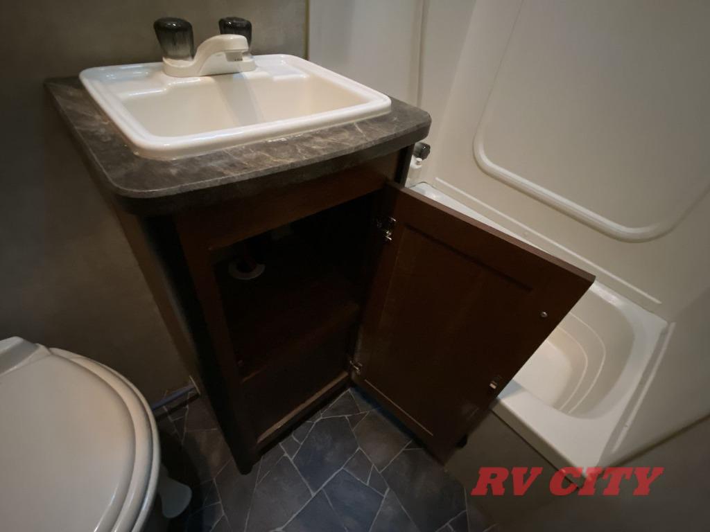 Moving toward the front you will find a side aisle bath on the left with tub/shower, toilet, and sink.