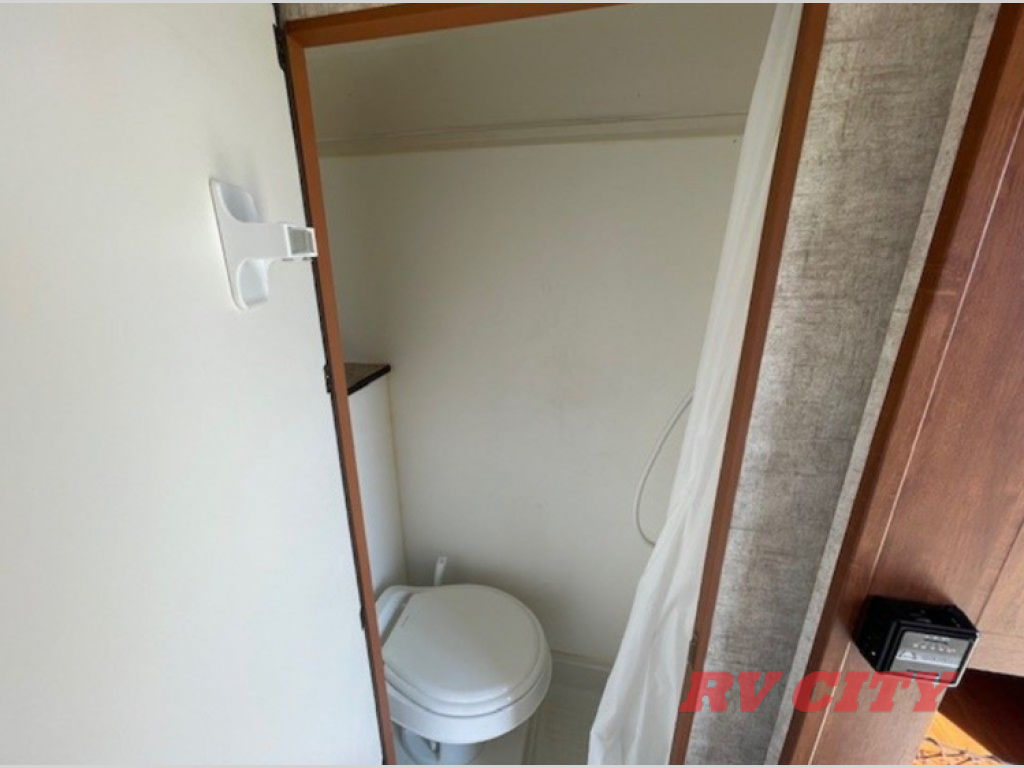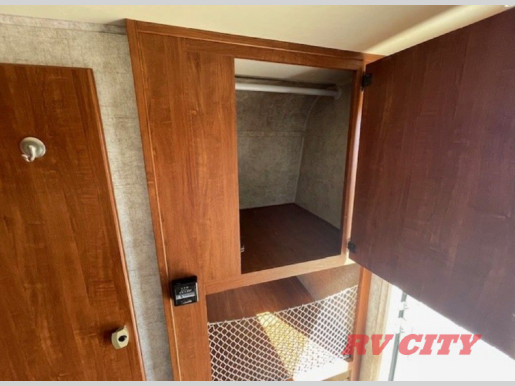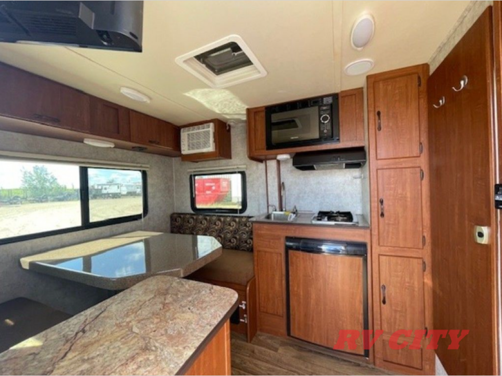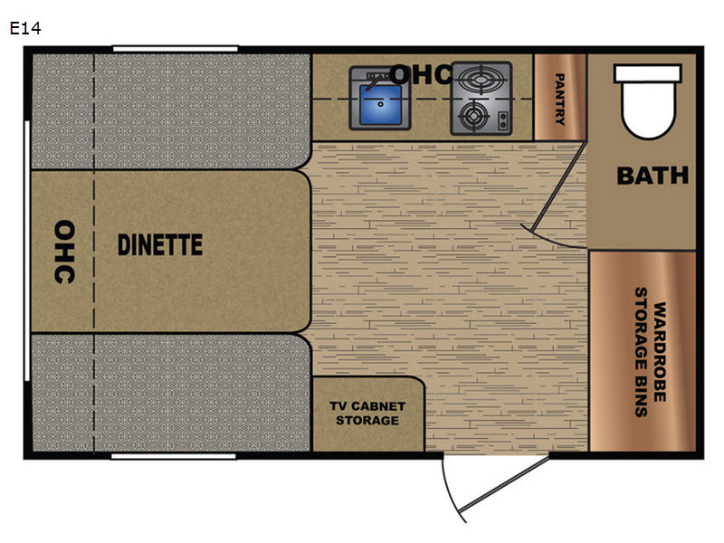 To the left of the entry door you will find a TV cabinet with storage, and a booth dinette for mealtime dining and sleeping space along the rear wall. There is also more storage above the dinette that stretches the entire width of the unit.