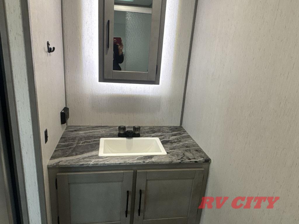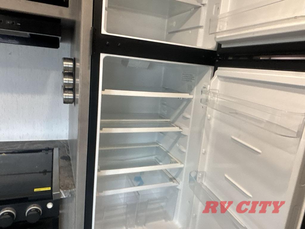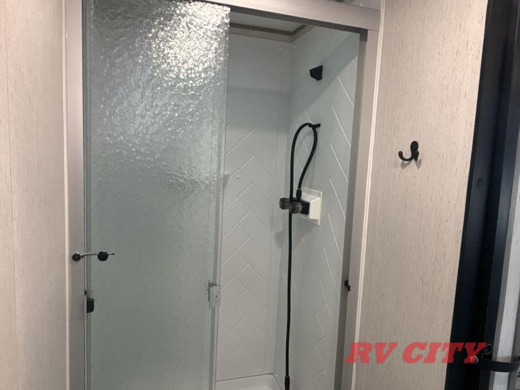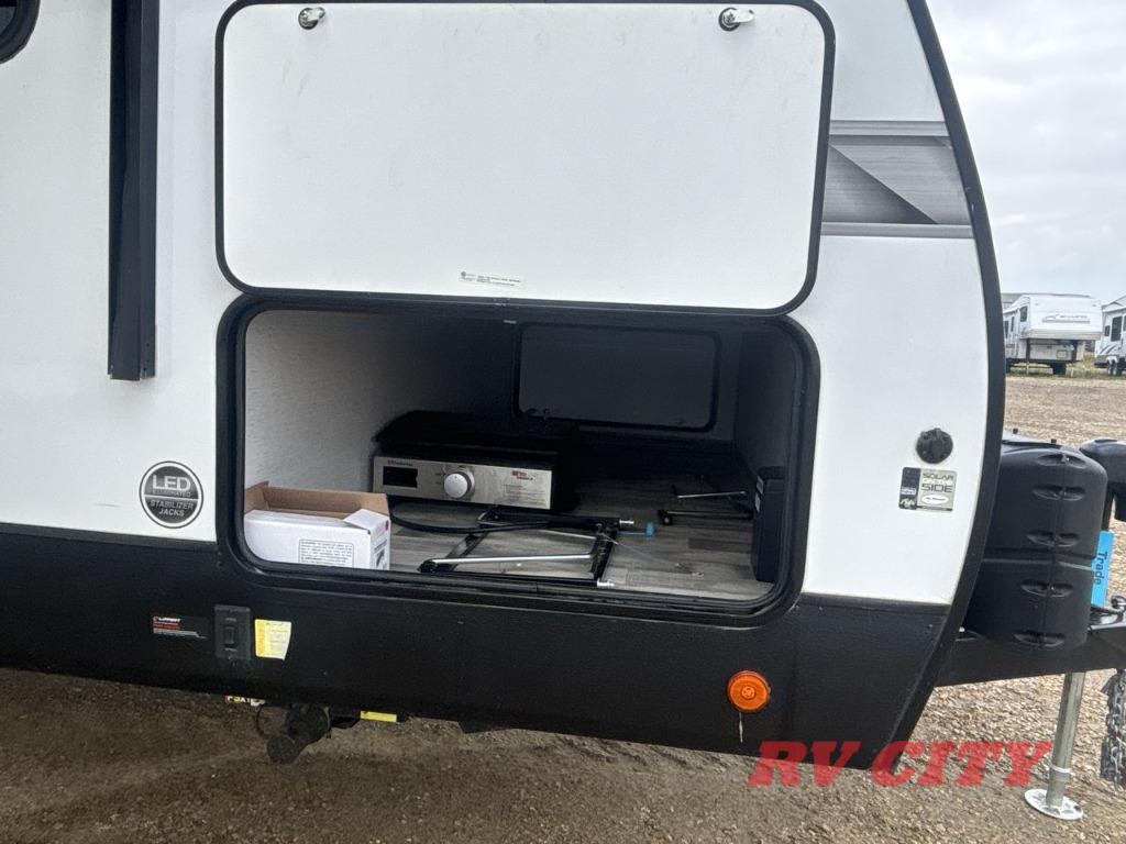 A full rear bath on board this cozy travel trailer will add privacy and convenience you won't want to camp without. The slide out in the main living area will provide plenty of space to let the chef whip up breakfast on the three burner range, and your crew can get comfy on the theater seats. The 10 cu. ft. refrigerator will allow you to pack your favorite cold ingredients, plus there is a hidden pantry behind the hinged entertainment center for smart storage spaces. This model also includes a front private bedroom with a queen bed, just like at home!