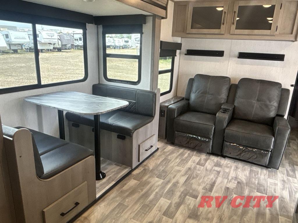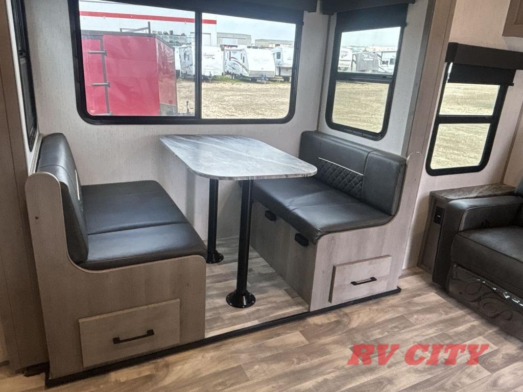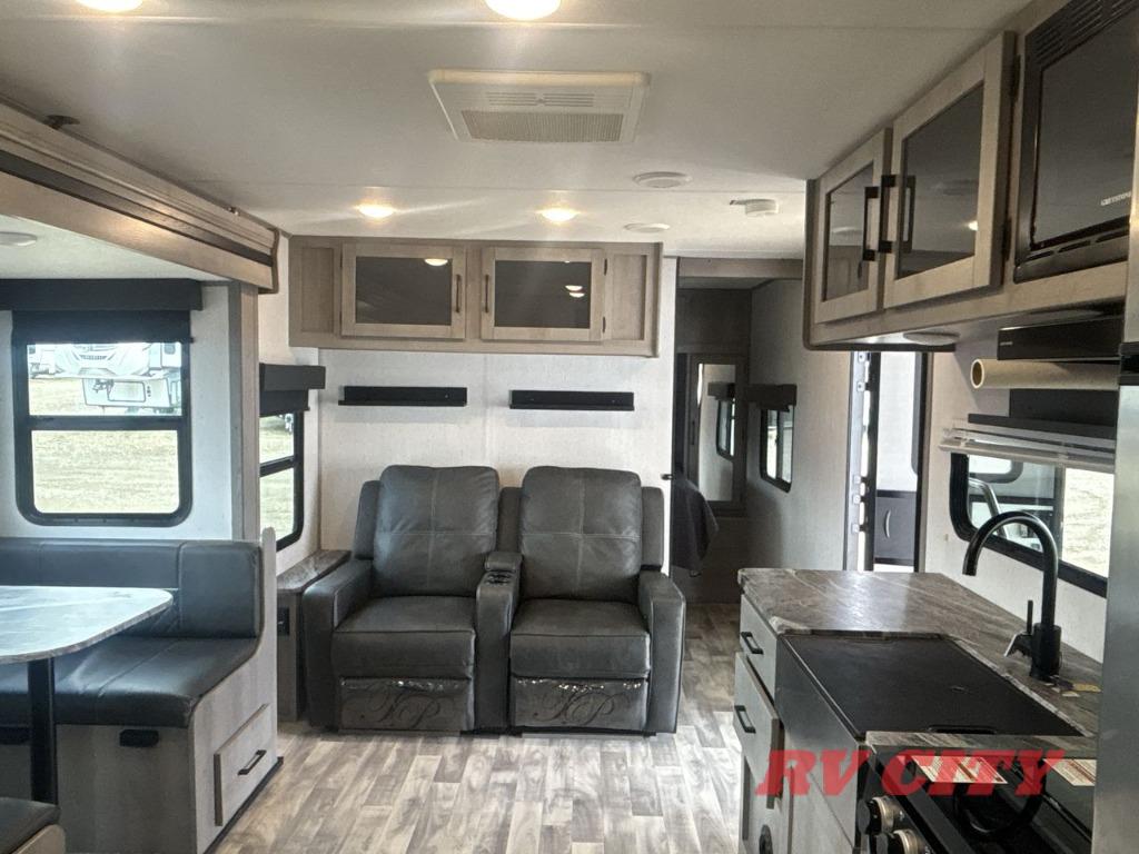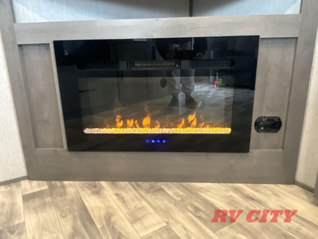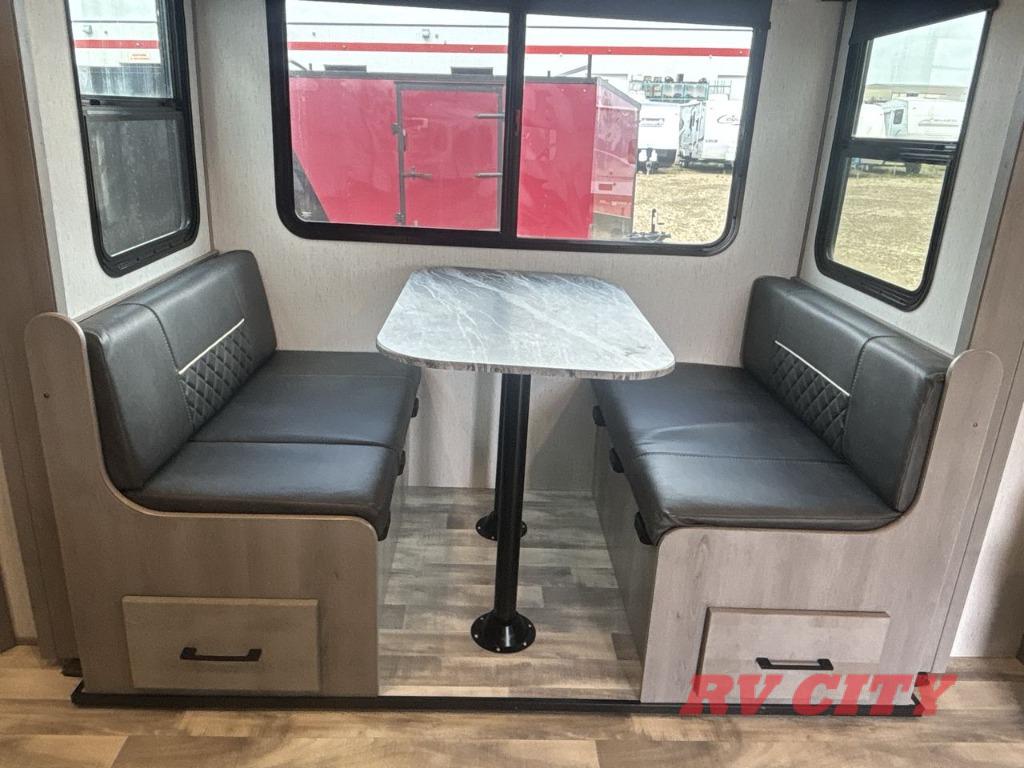 A full rear bath on board this cozy travel trailer will add privacy and convenience you won't want to camp without. The slide out in the main living area will provide plenty of space to let the chef whip up breakfast on the three burner range, and your crew can get comfy on the theater seats. The 10 cu. ft. refrigerator will allow you to pack your favorite cold ingredients, plus there is a hidden pantry behind the hinged entertainment center for smart storage spaces. This model also includes a front private bedroom with a queen bed, just like at home!