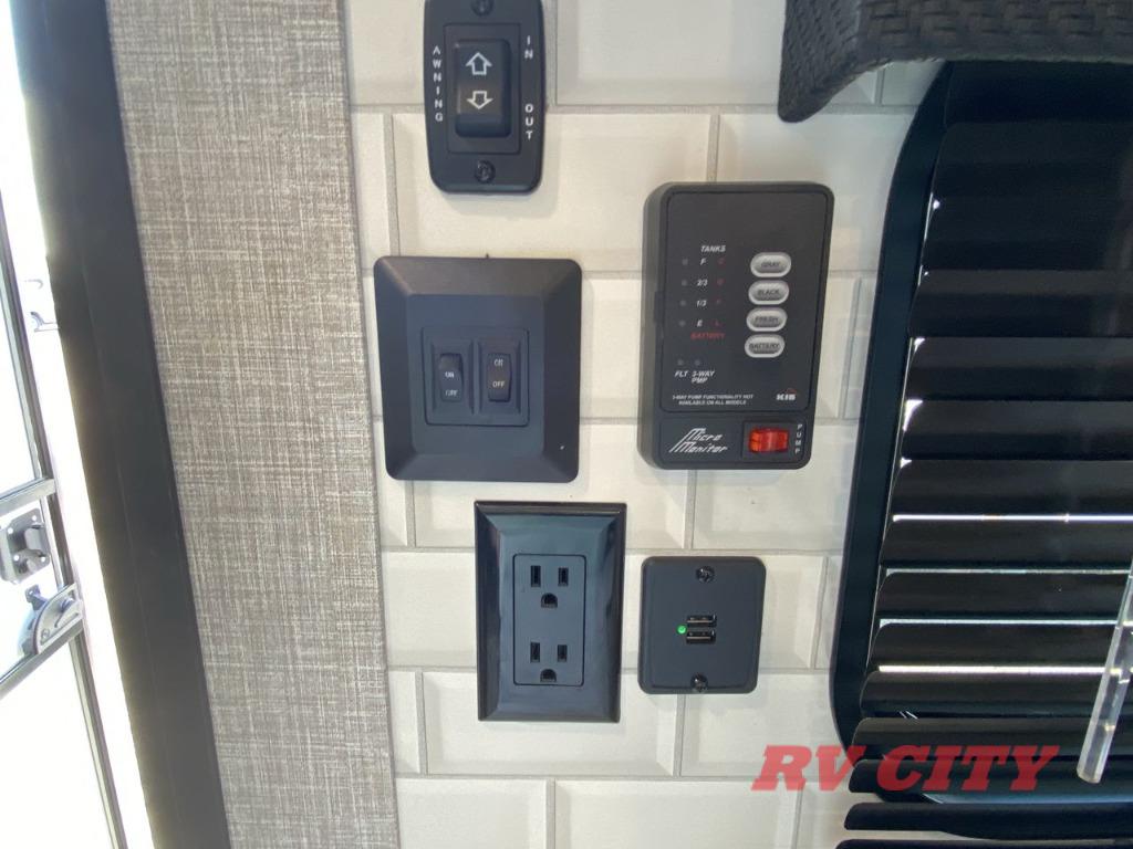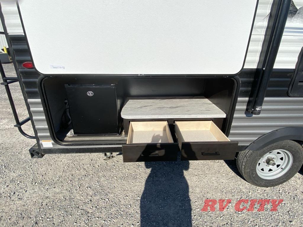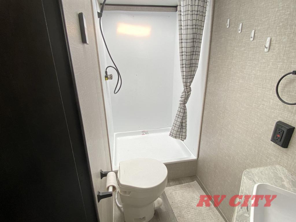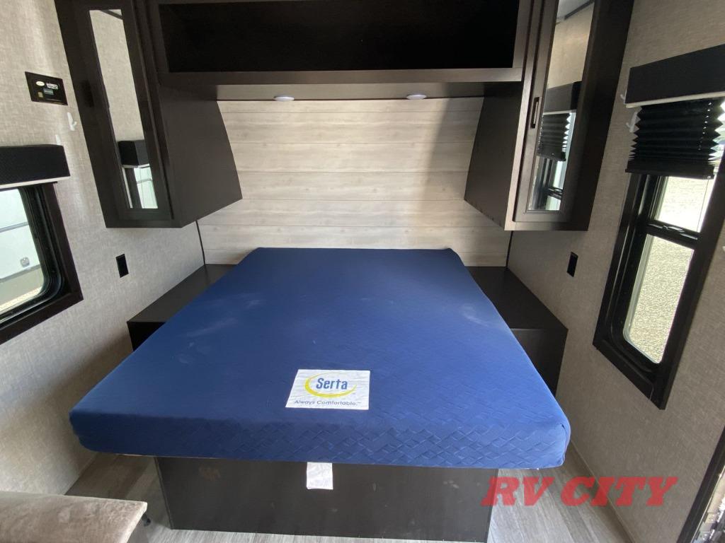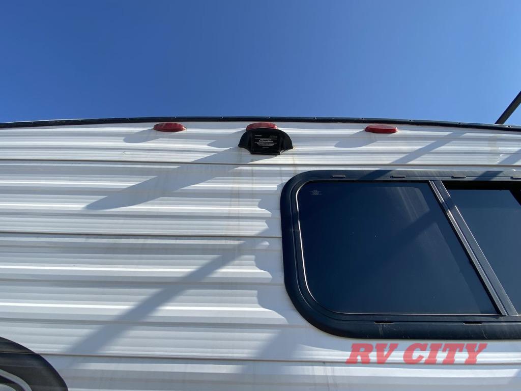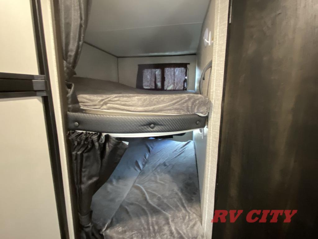 Get ready for family fun or a friend's weekend at the campgrounds in this trailer! This trailer offers full kitchen amenities including a pantry for snacks and such, plus a full rear corner bathroom for privacy and includes a shower. When you need a break, the semi-private bedroom up front offers a queen bed, dual wardrobes and a curtain to close, and the double size bunks offer a curtain to close as well. There is a 13' power awing with LED lights for you to enjoy this outdoor space into the night, plus exterior storage for your outdoor games and gear.